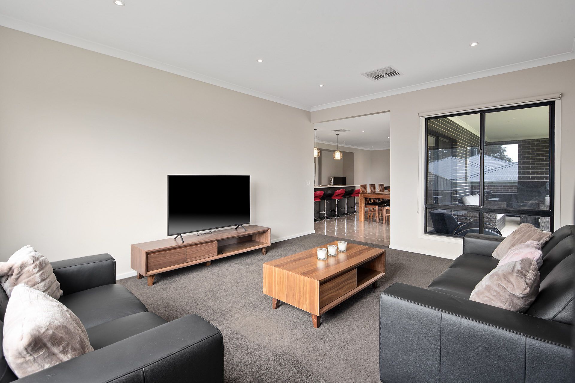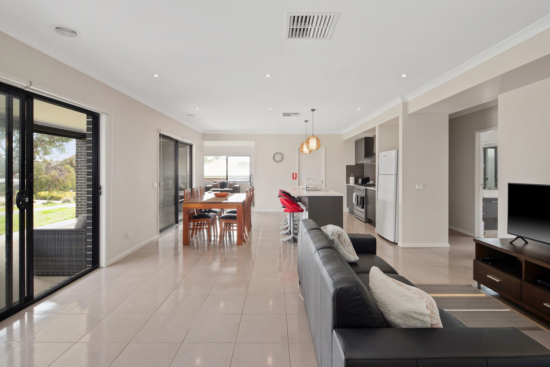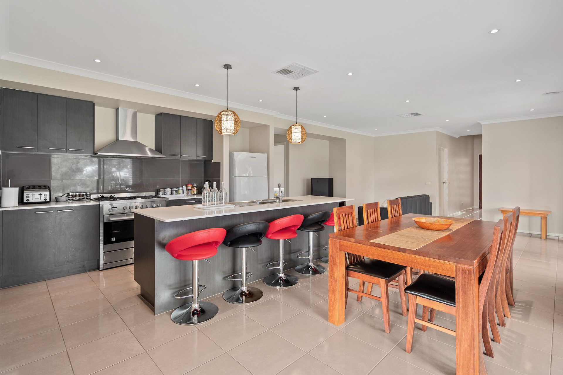 The home offers an inviting open plan living/dining area with plenty of natural light, a separate family room and a modern kitchen equipped with a dishwasher, gas cooktop, and electric oven. There are 5 stools at the island bench adjacent to the dining setting.