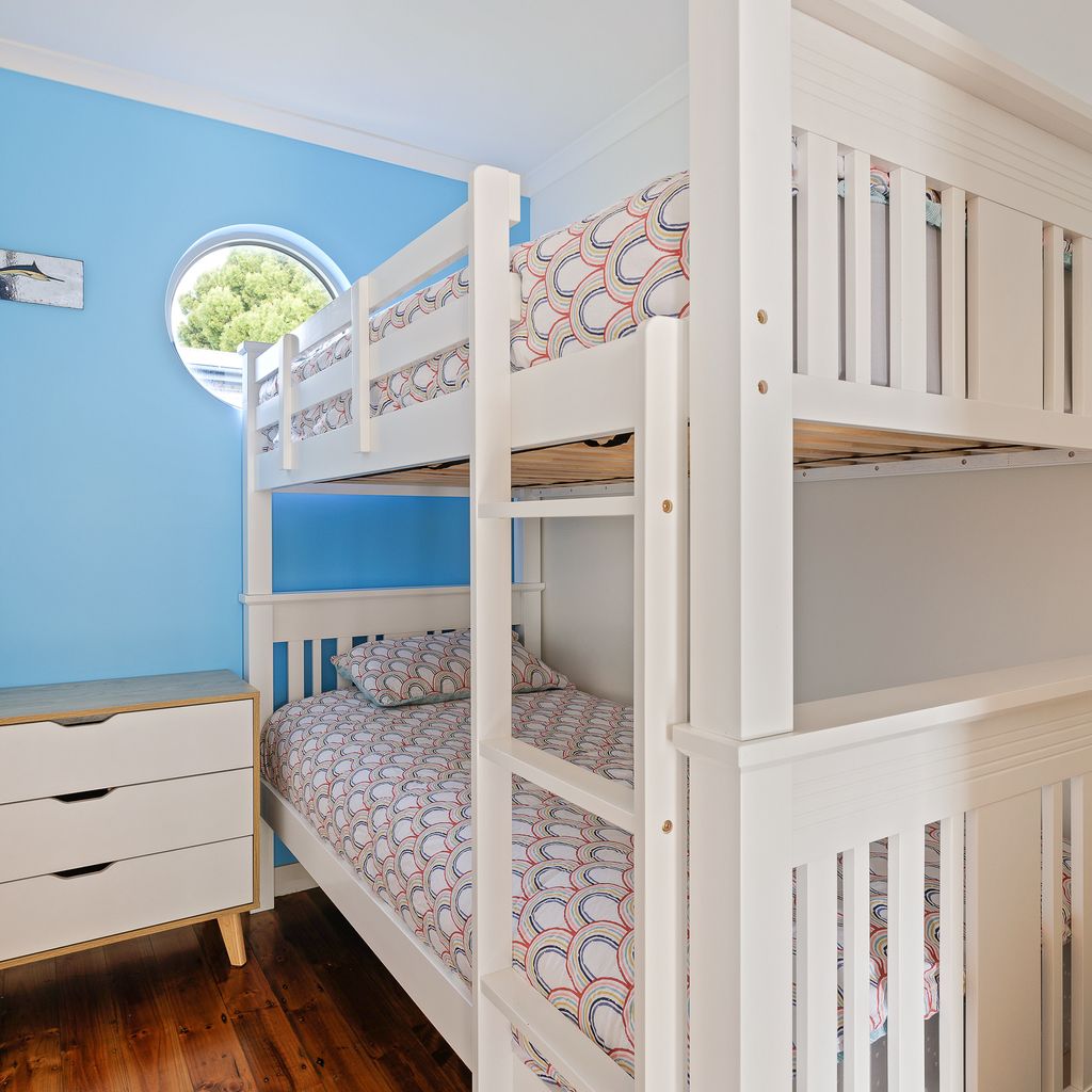 The kitchen is well equipped with stainless steel appliances; dishwasher an an electric oven and stovetop. The property has 3 bedrooms consisting of a queen bed in one, a queen bed and a single trundle bed in another and a set of single bunks beds in the third bedroom. Also upstairs is the bathroom.