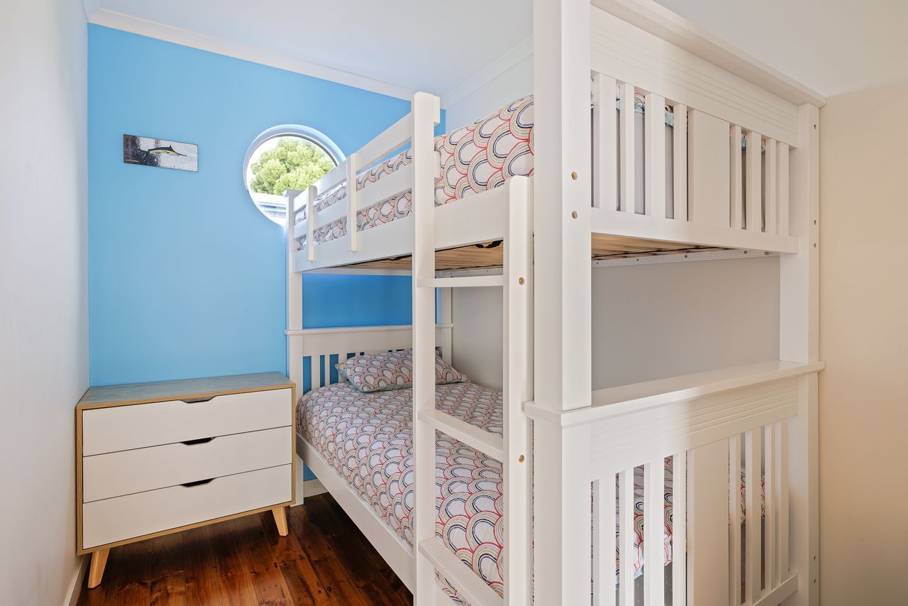 The kitchen is well equipped with stainless steel appliances; dishwasher an an electric oven and stovetop. The property has 3 bedrooms consisting of a queen bed in one, a queen bed and a single trundle bed in another and a set of single bunks beds in the third bedroom. Also upstairs is the bathroom.