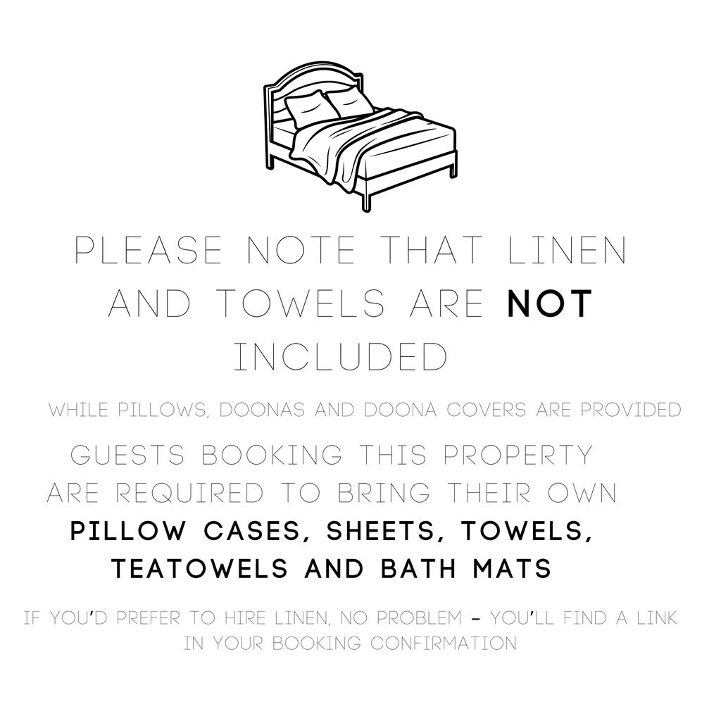 Guests are required to bring their own sheets, pillowcases, towels, bathmats and tea towels.