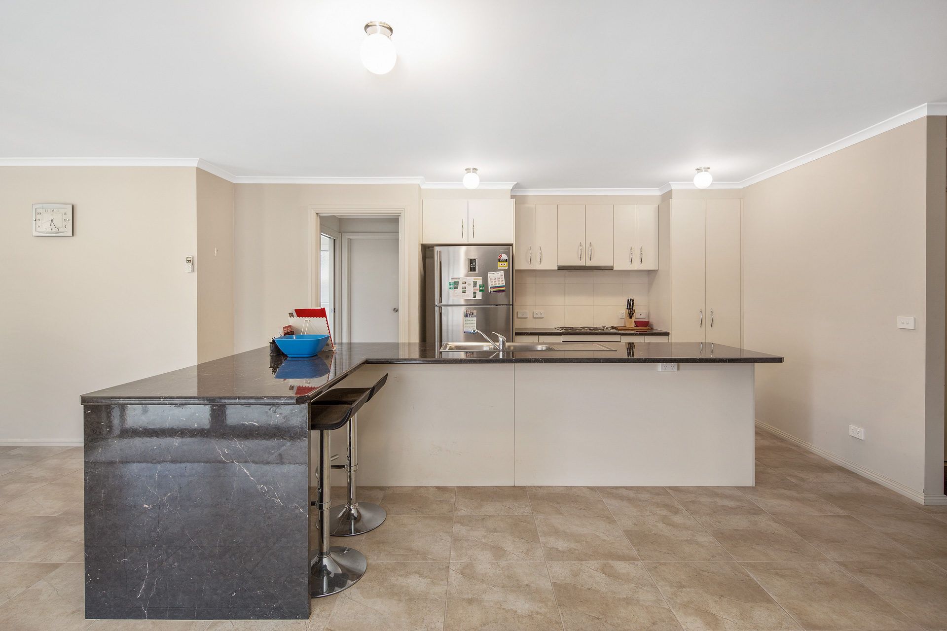 The property has an elegant kitchen and spacious dining area which flows out to the undercover outdoor entertaining area. The kitchen features stainless steel appliances, with electric oven and gas cooktop, microwave, dishwasher, and fridge/freezer, and a breakfast bar seating four people.