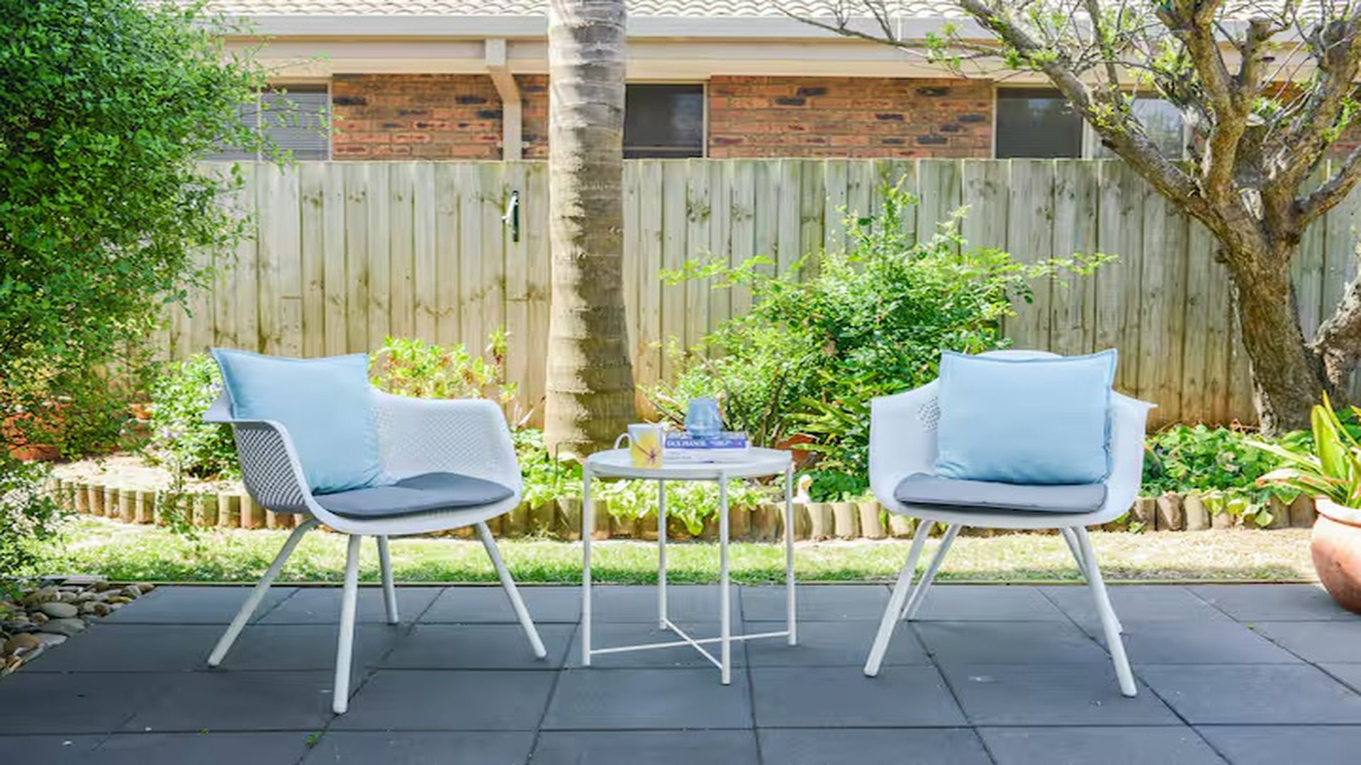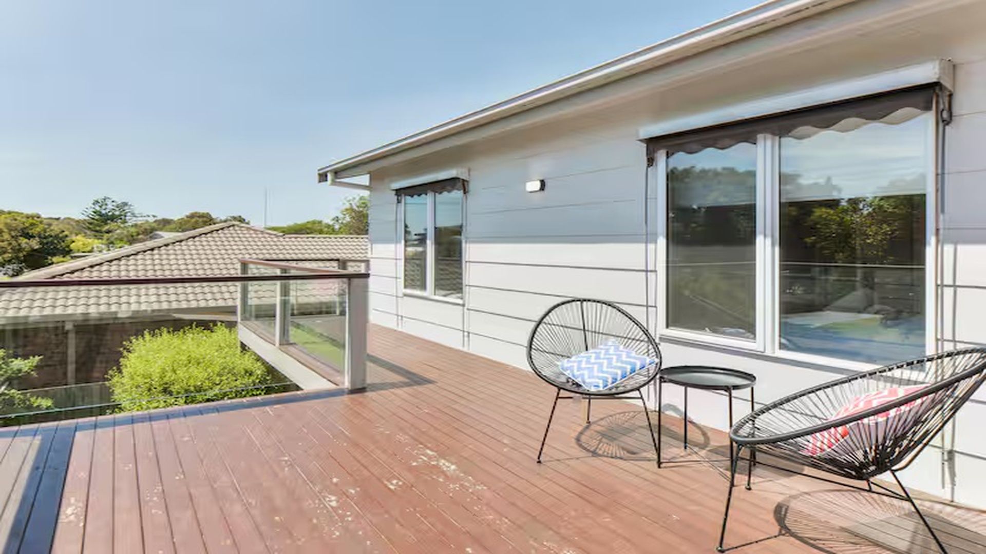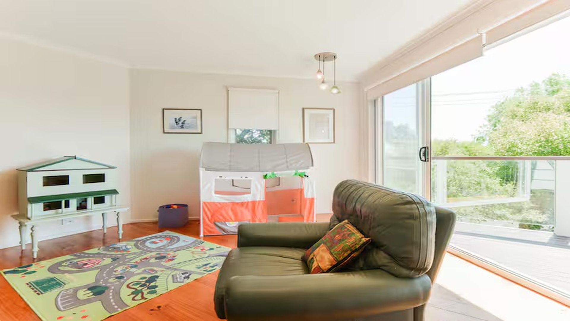 The upstairs rumpus has access to a large balcony with chairs to sit and enjoy the sunshine.