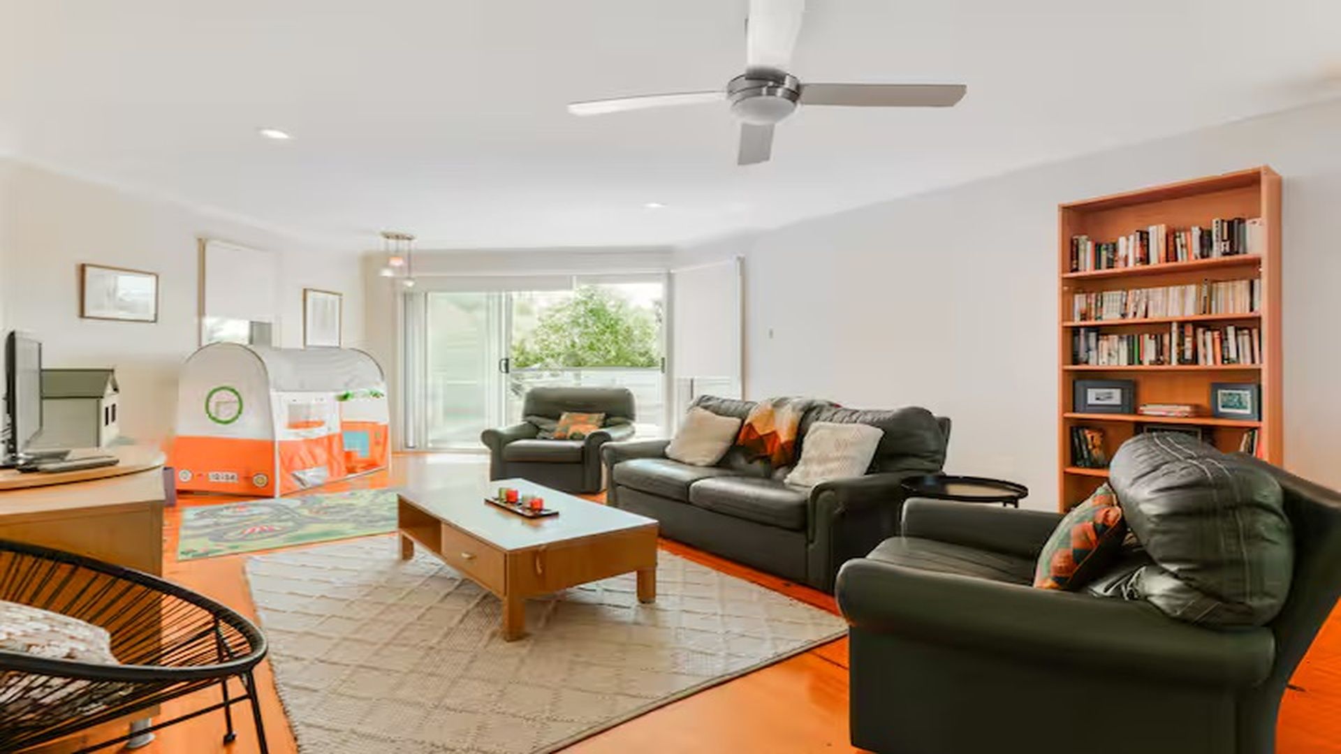 Separate rumpus room offers a retreat with a second television, refrigerator microwave and electric kettle and plenty of space for board games and activities for the kids.