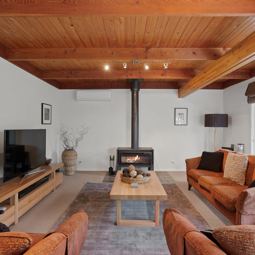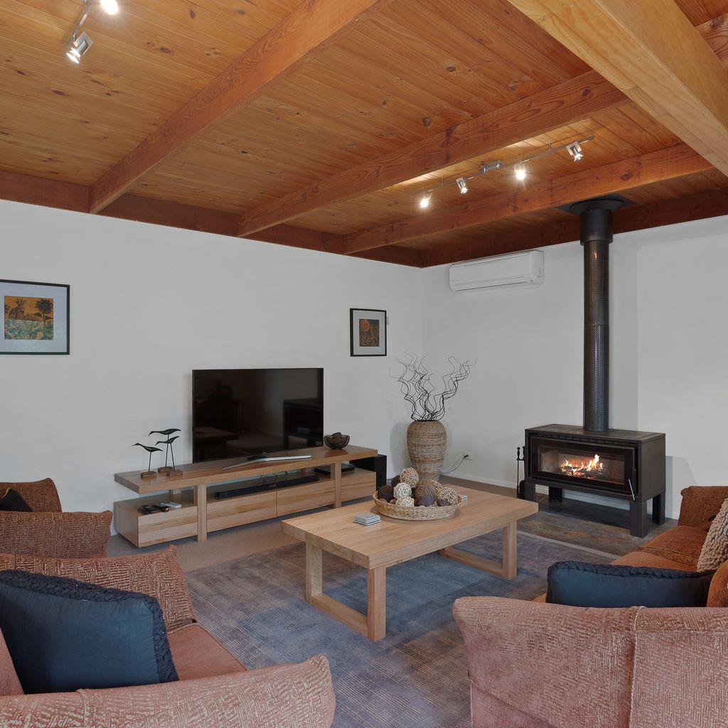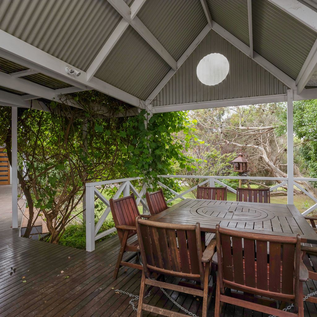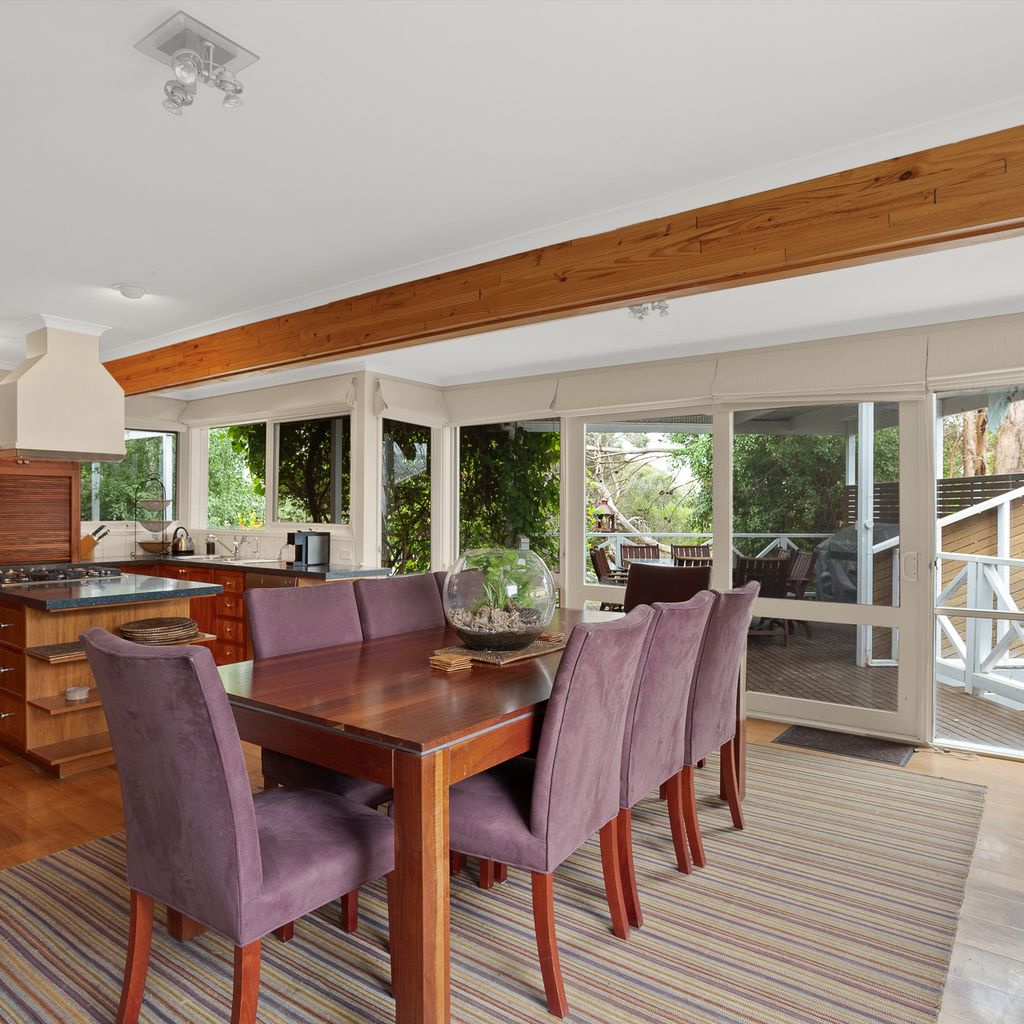 With a second split system and a wood heater in the main lounge room with its comfortable sofas Smart Tv, DvD and stereo cd player your year-round comfort is guaranteed. The house is set in a lovely established garden with a huge outdoor entertaining deck, covered and sheltered, perfect for alfresco dining. The deck is accessed directly from the kitchen dining area.