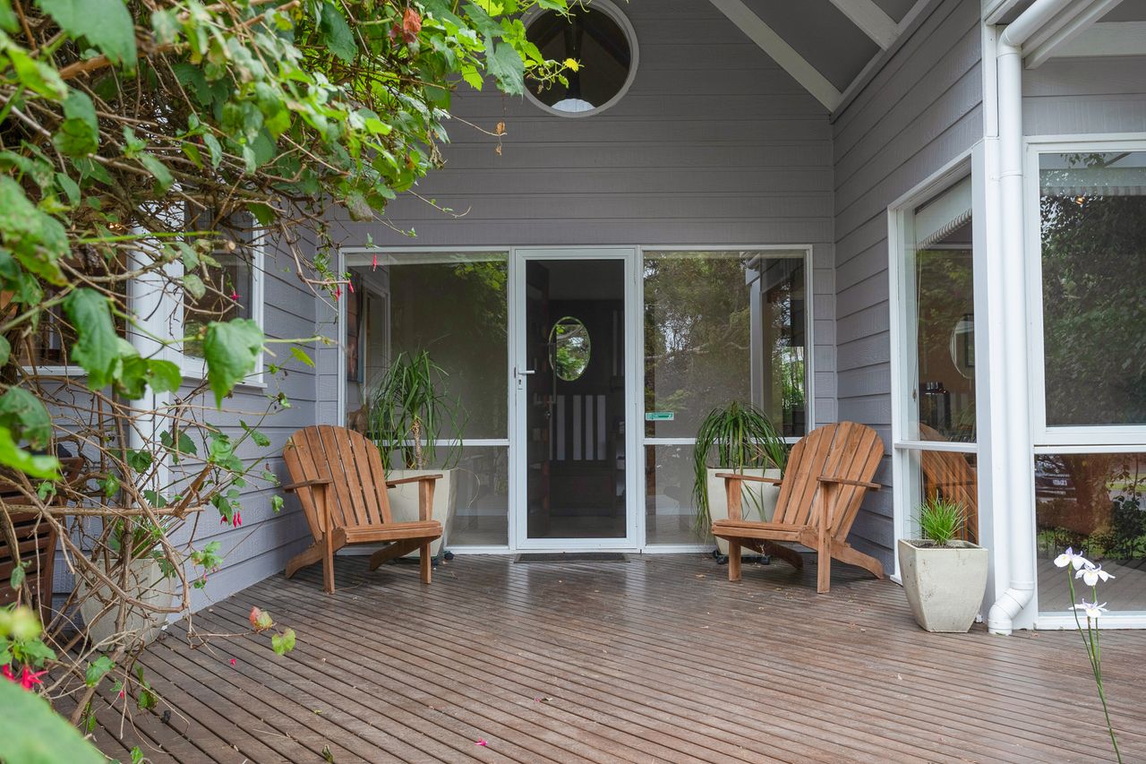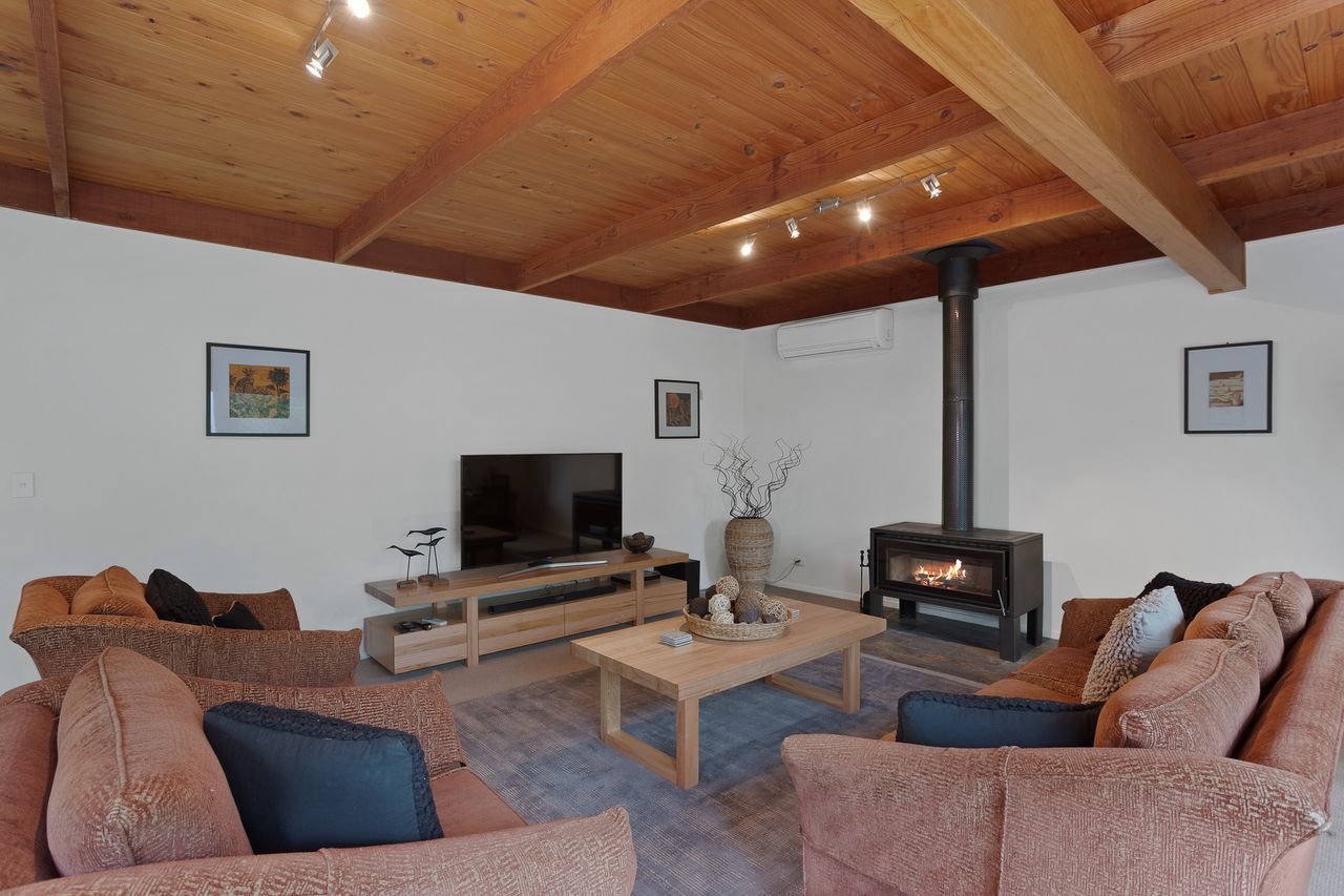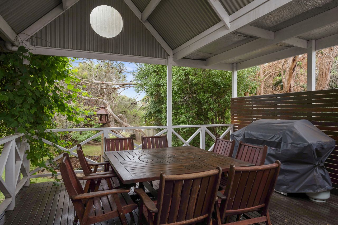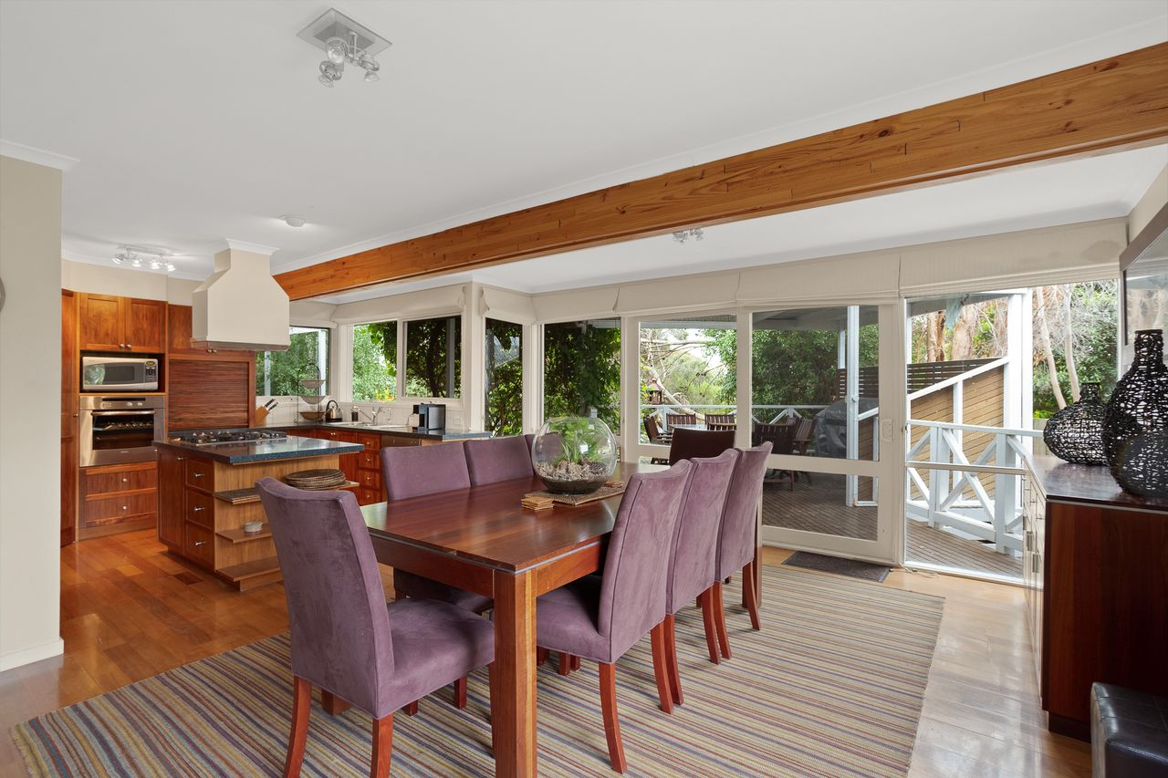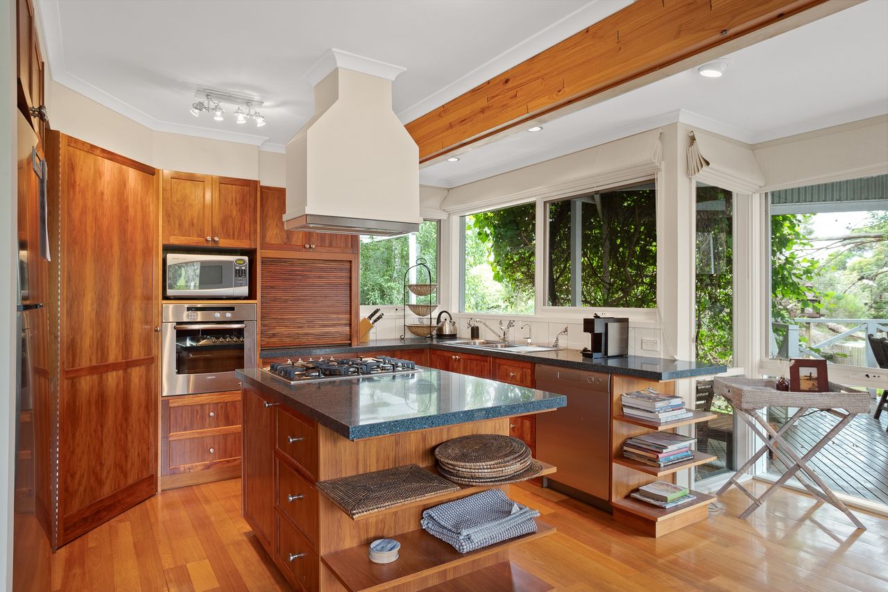 With a second split system and a wood heater in the main lounge room with its comfortable sofas Smart Tv, DvD and stereo cd player your year-round comfort is guaranteed. The house is set in a lovely established garden with a huge outdoor entertaining deck, covered and sheltered, perfect for alfresco dining. The deck is accessed directly from the kitchen dining area.