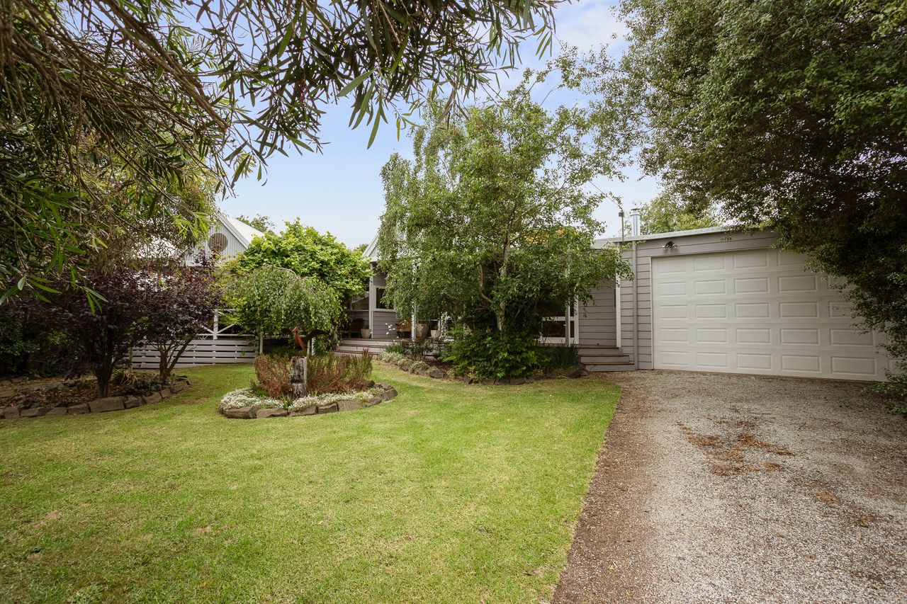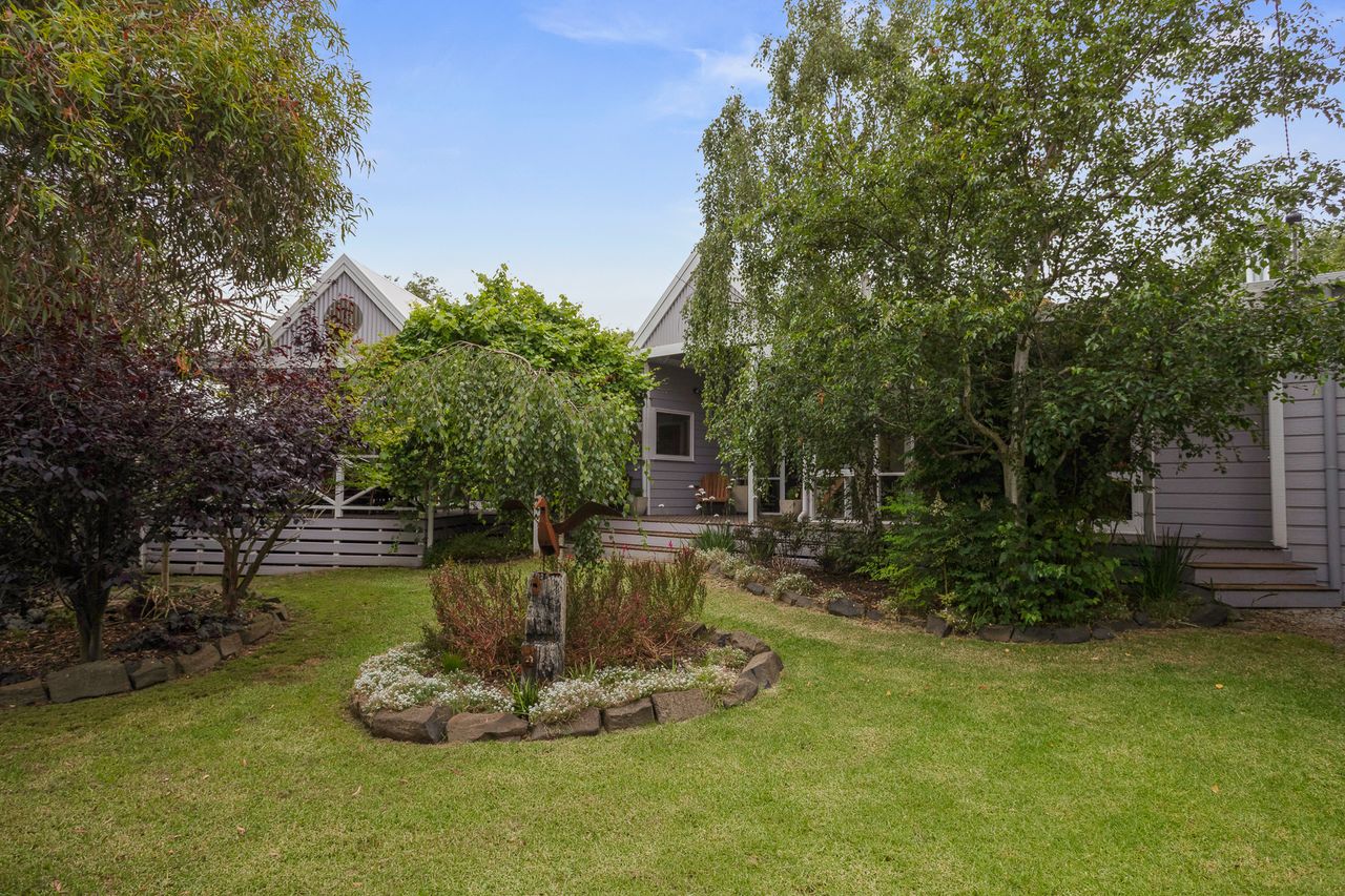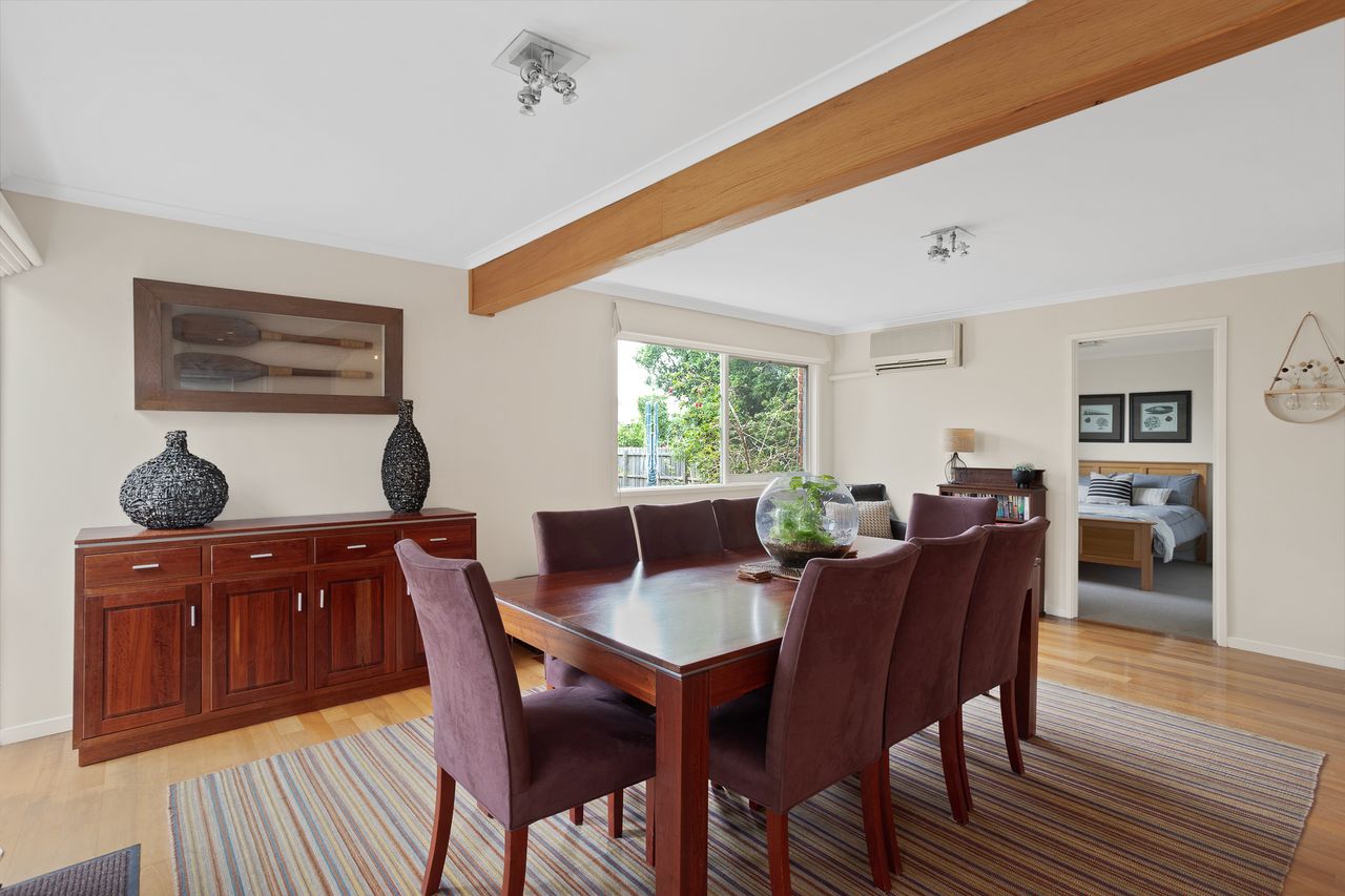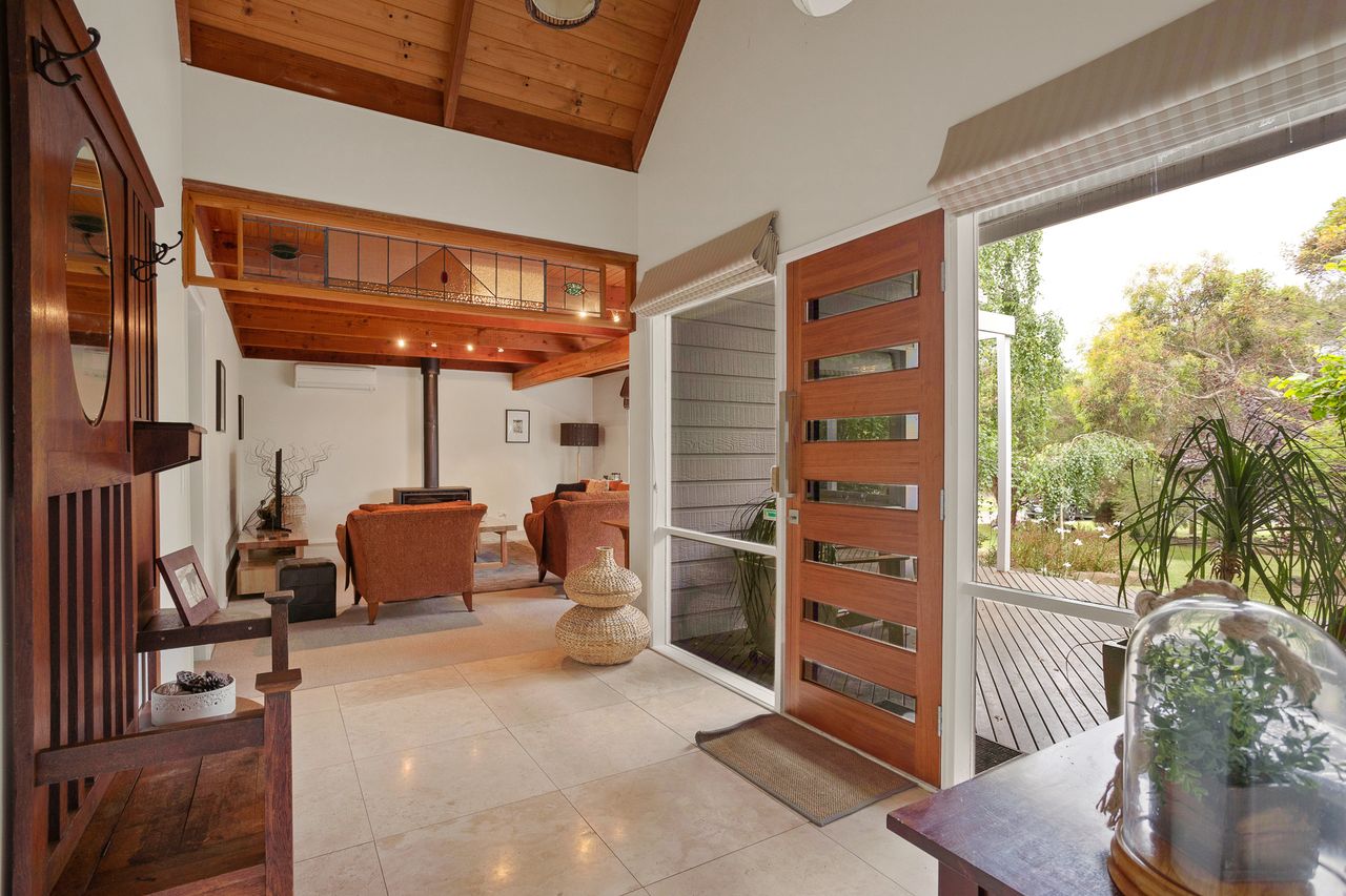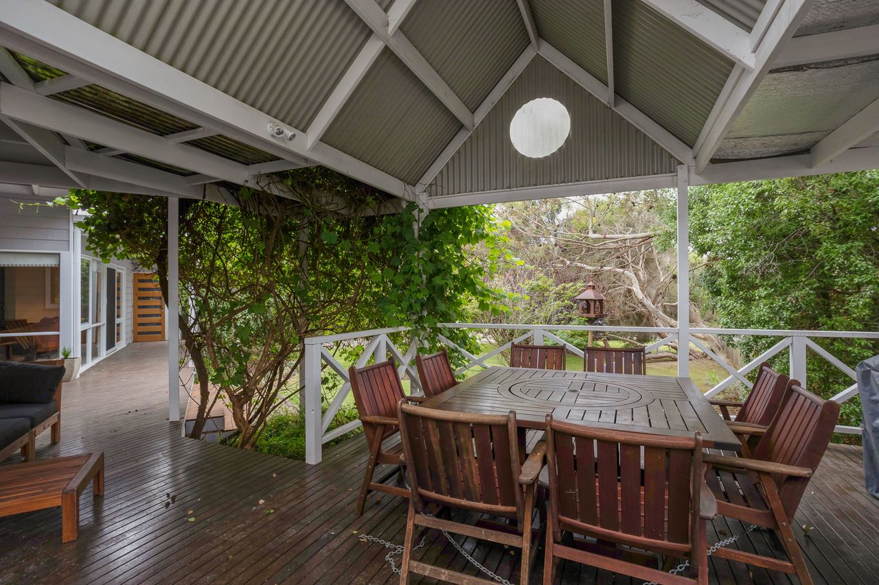 With a second split system and a wood heater in the main lounge room with its comfortable sofas Smart Tv, DvD and stereo cd player your year-round comfort is guaranteed. The house is set in a lovely established garden with a huge outdoor entertaining deck, covered and sheltered, perfect for alfresco dining. The deck is accessed directly from the kitchen dining area.
