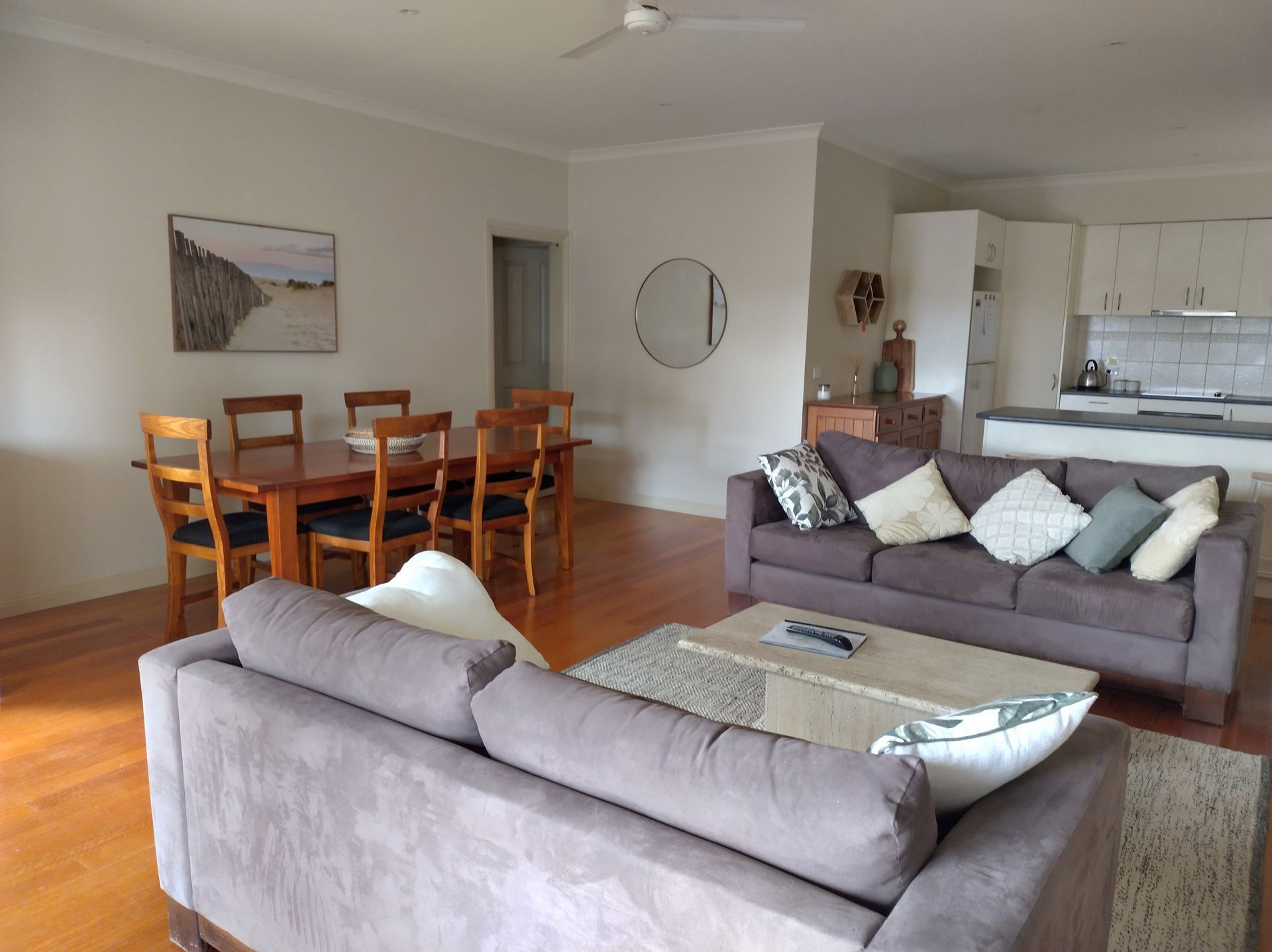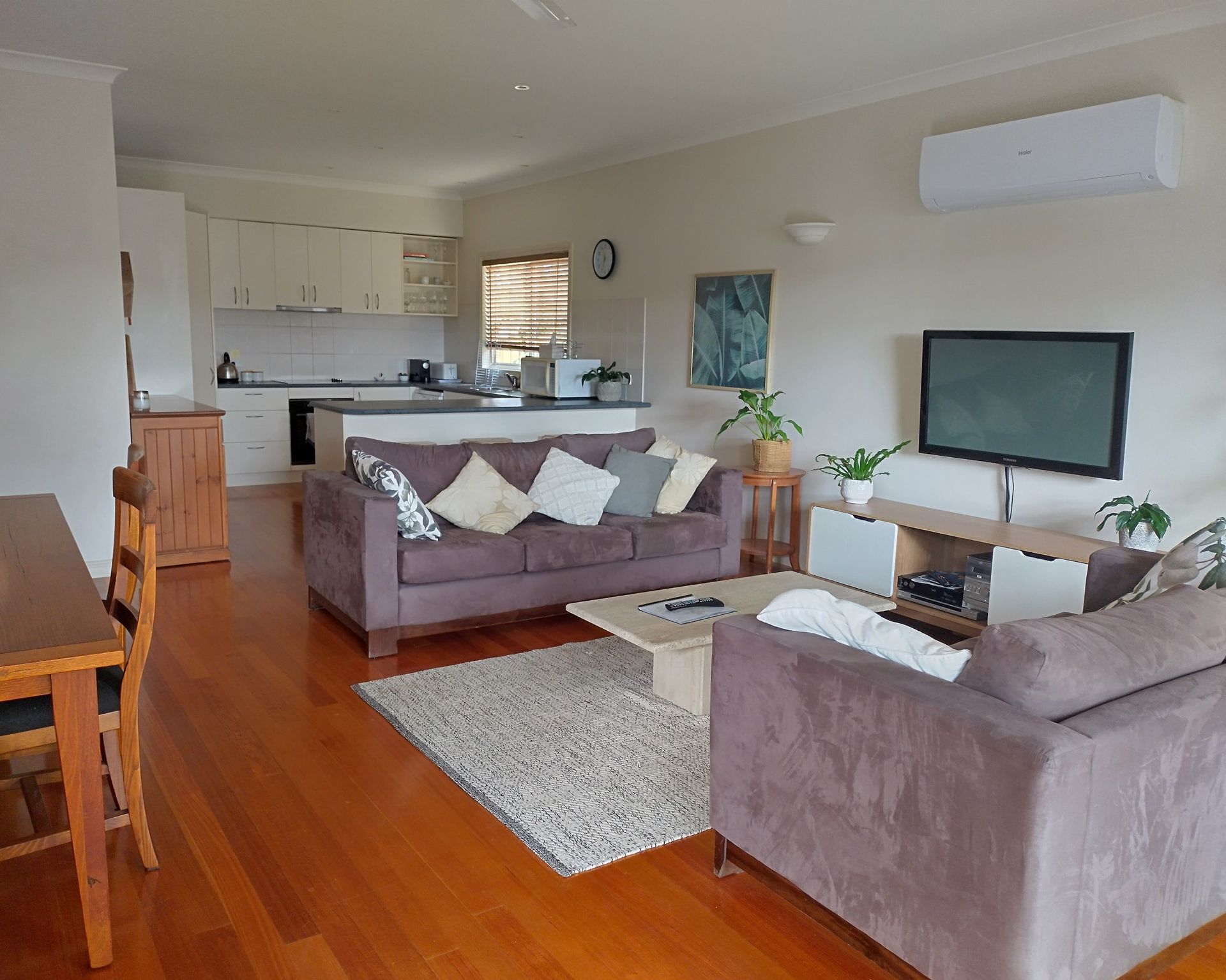 Inside, the open-plan living, dining, and kitchen area is bright and spacious, with access to a lovely courtyard. The kitchen is fully equipped with electric cooking, a dishwasher, and a microwave. Relax on the comfy couches or enjoy meals around the six-seater dining table. The modern furnishings and fixtures create a welcoming atmosphere, making it feel like a home away from home.