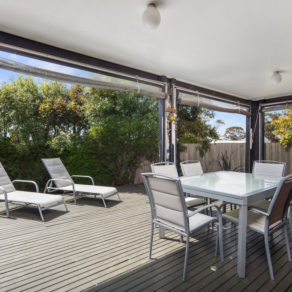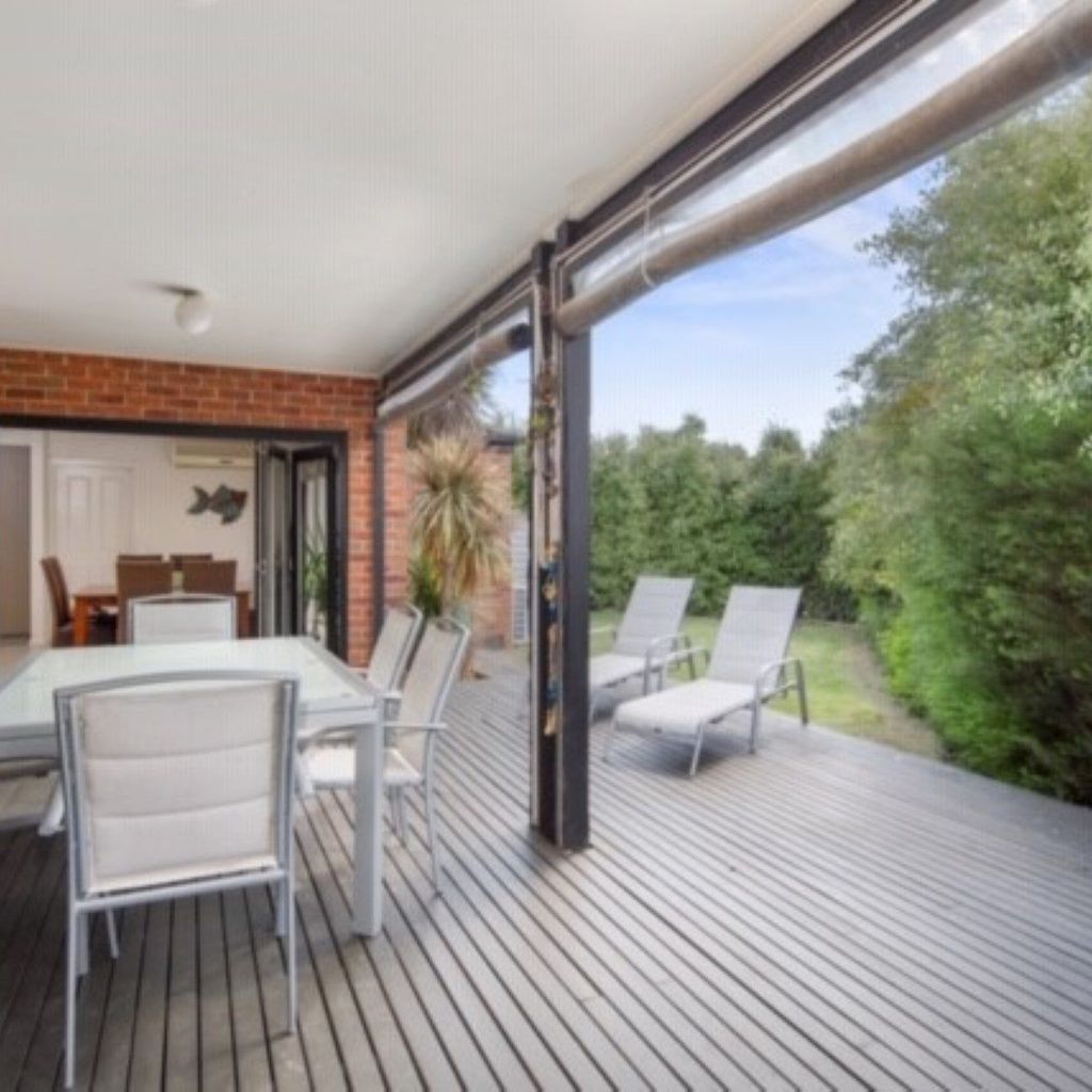 Extend the living area by opening up the stacked glass doors to the outdoor decked area with dining setting, sun lounges and bistro blinds.