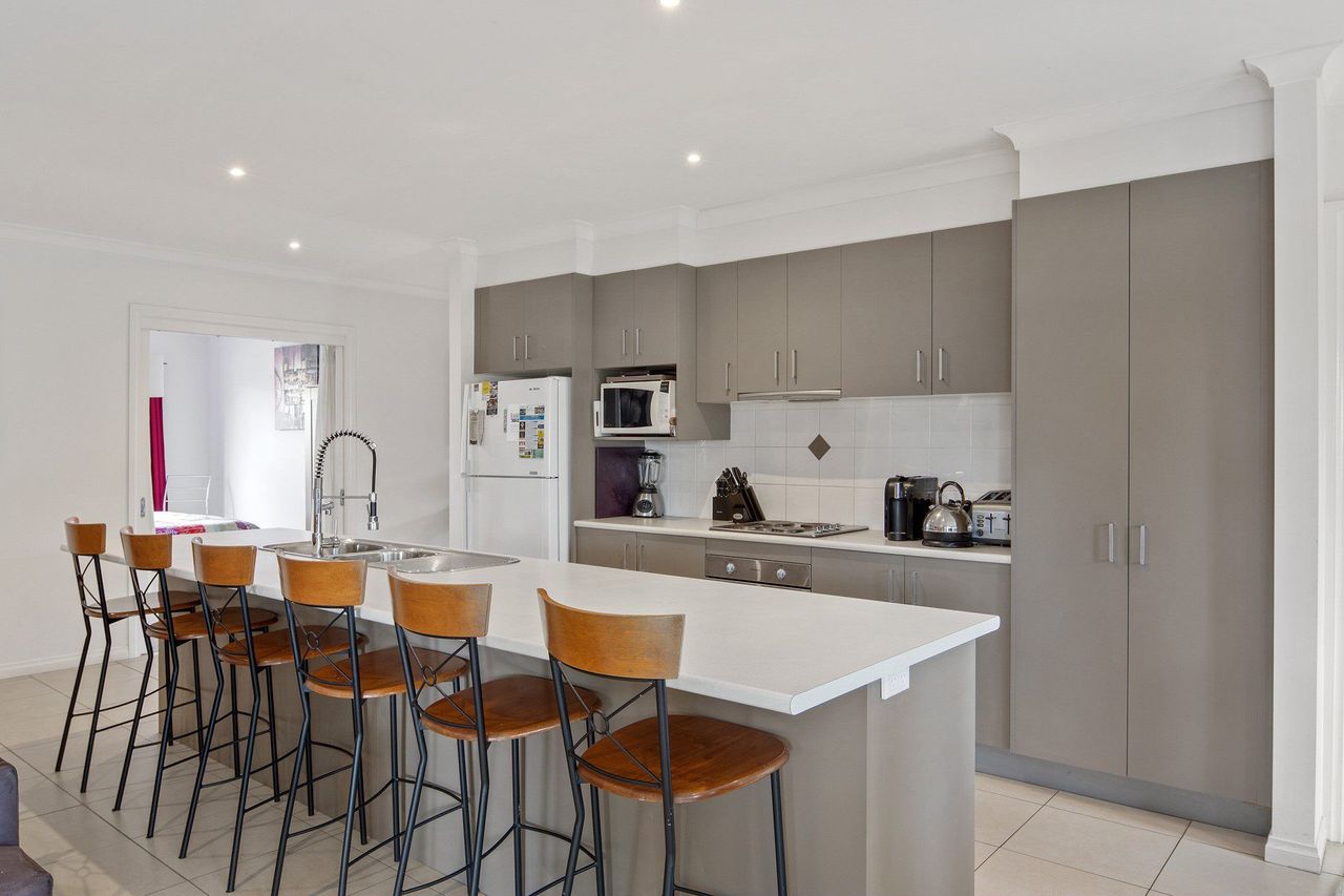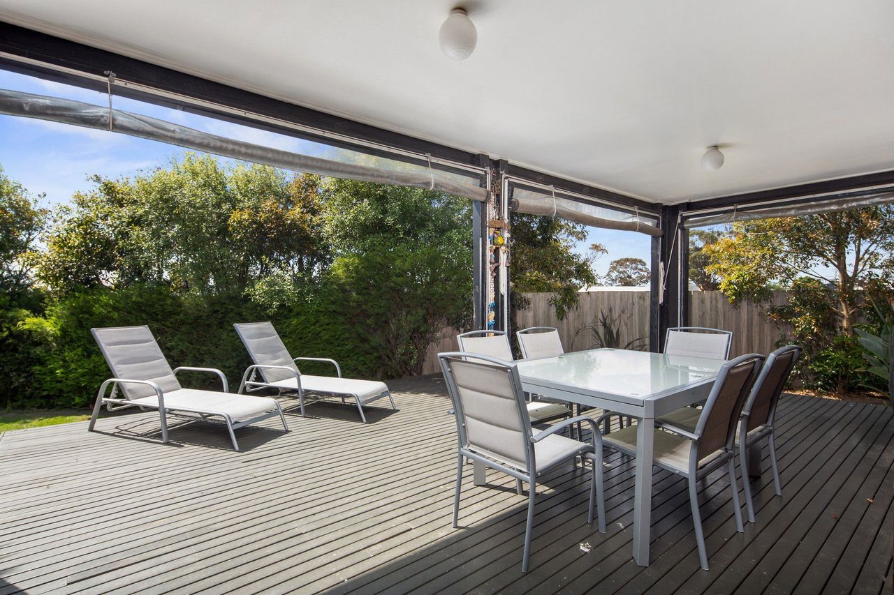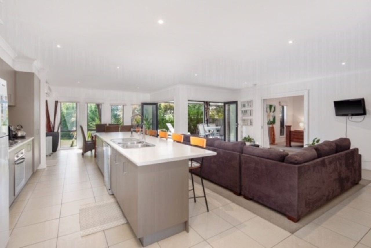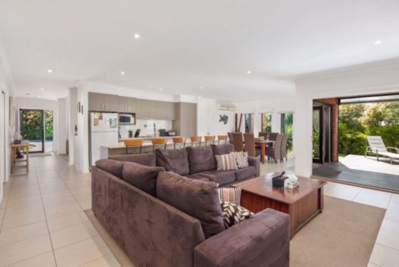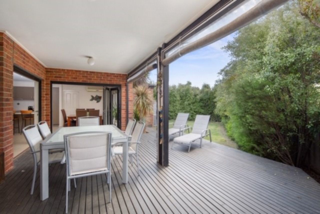 Extend the living area by opening up the stacked glass doors to the outdoor decked area with dining setting, sun lounges and bistro blinds.