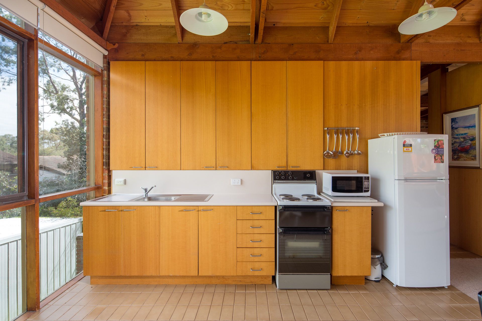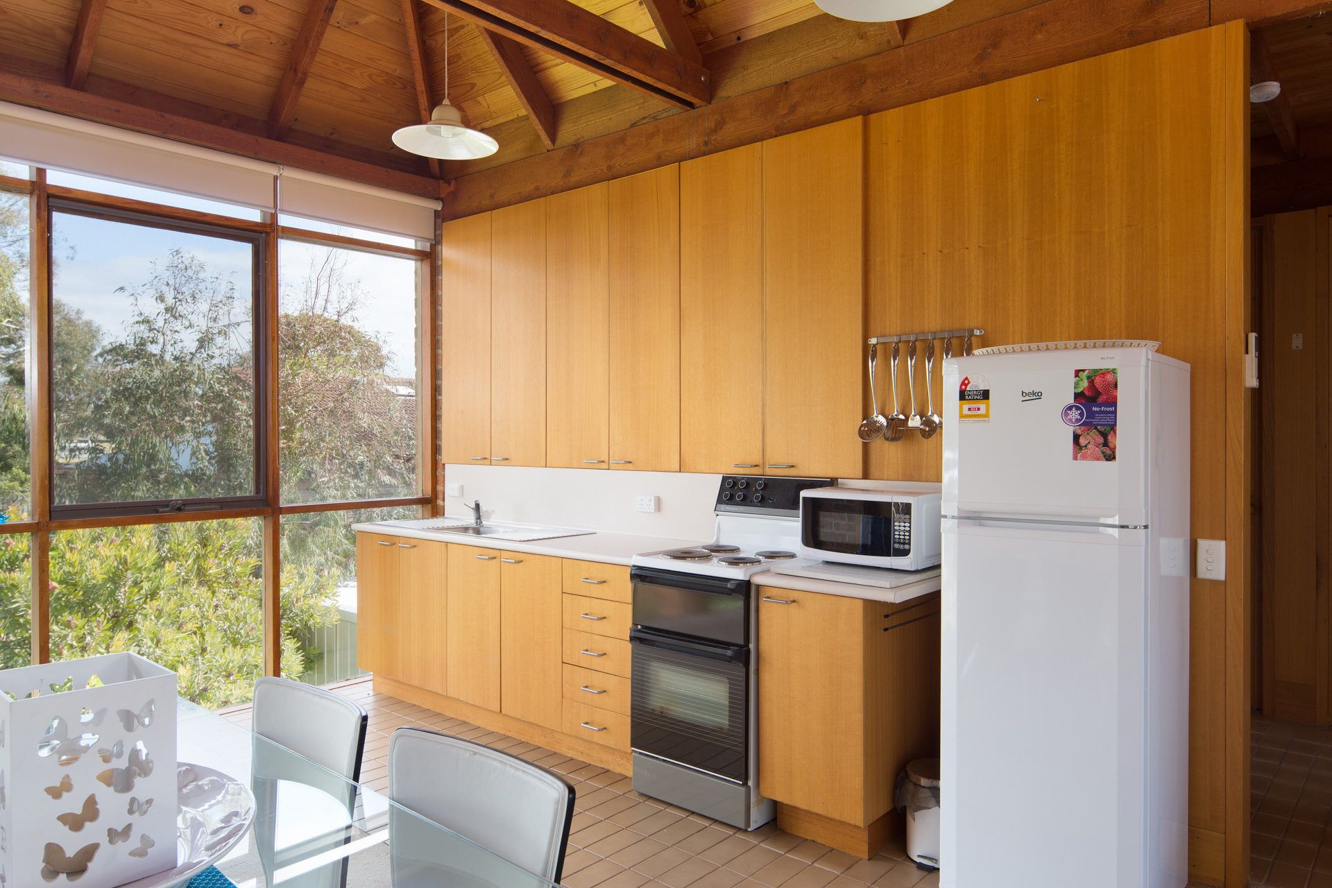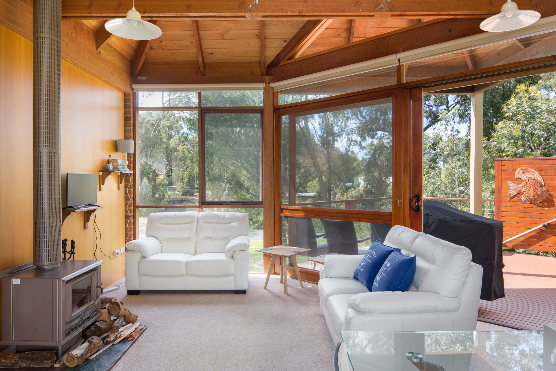 This property presents a style that one does not find very often on Phillip Island. Soaring timber lined cathedral ceilings and floor to ceiling windows allow the northern sun fill the house from above; as well as from the large glass north facing doors leading out to a private deck with BBQ and seating. The ambience is completed as you sit by the log combustion fire looking out to the trees and abundant birdlife.