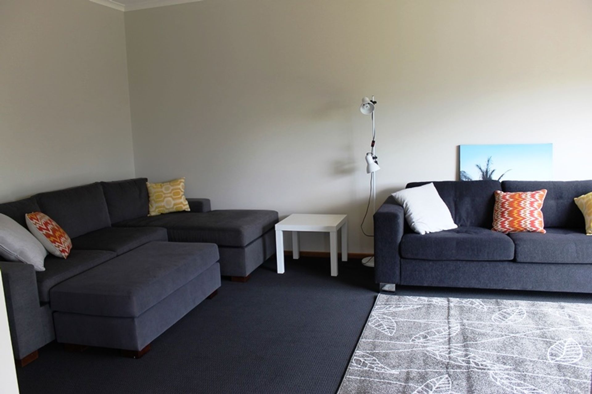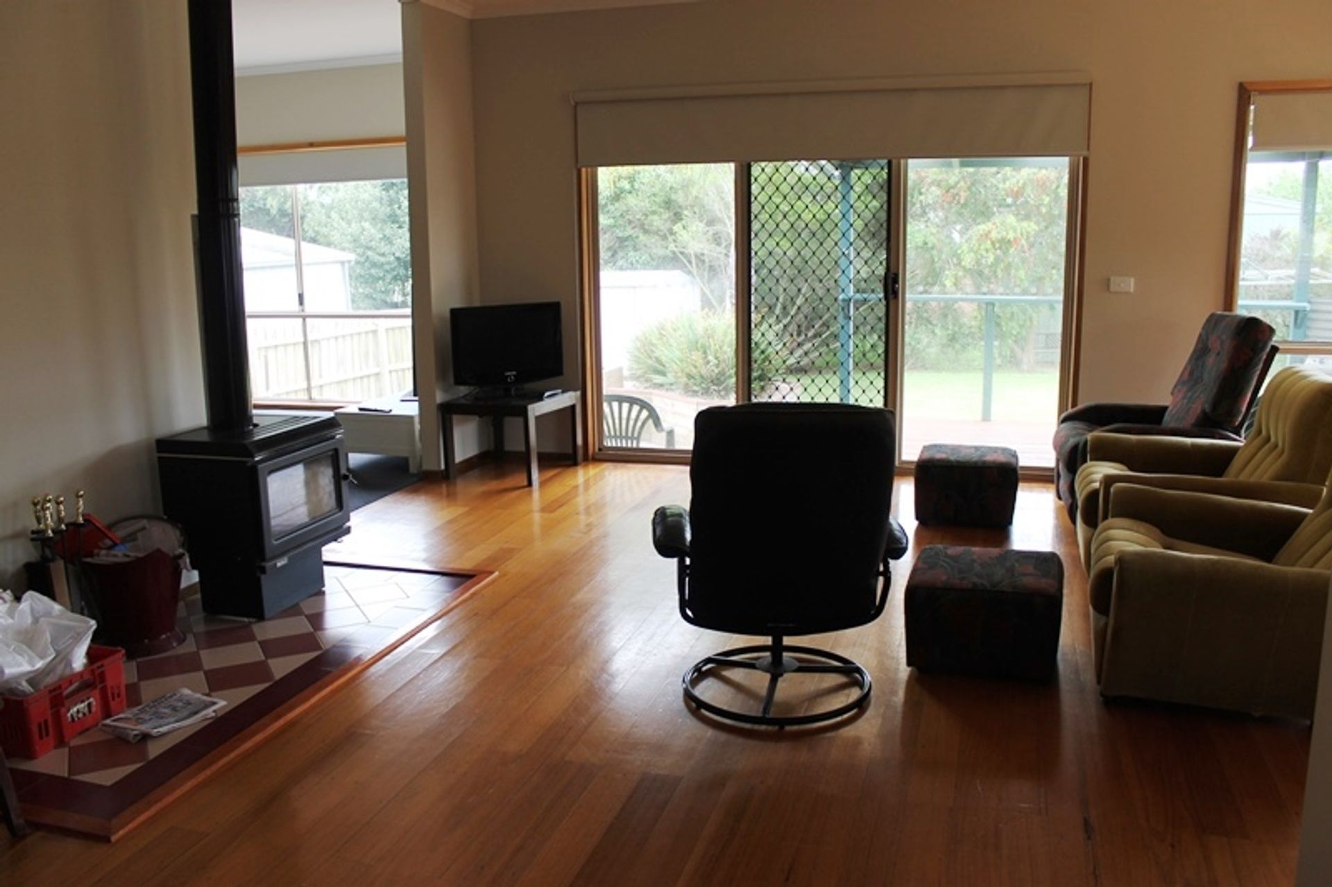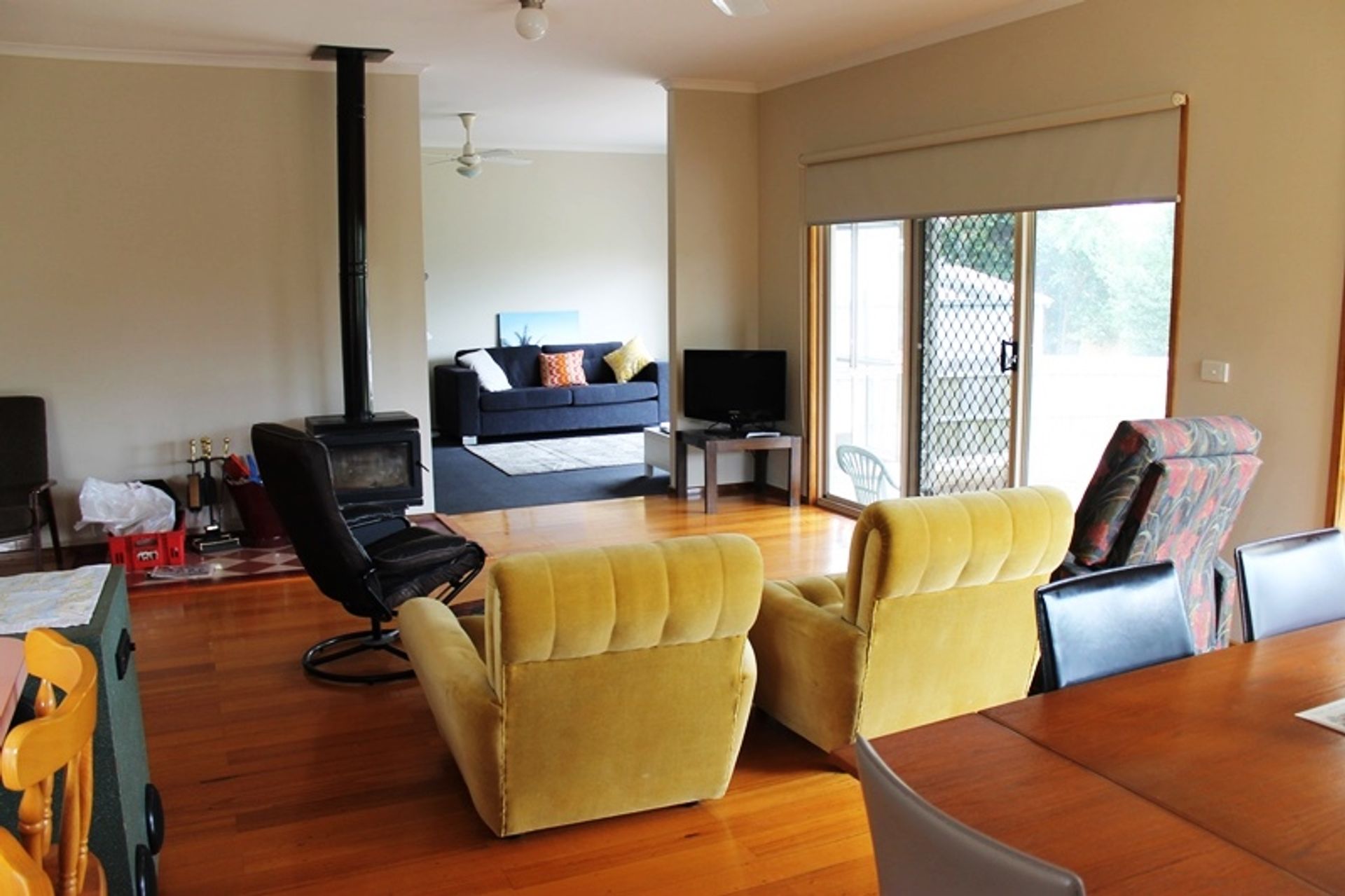 This single level home is open and sunny and very clean, there are two living areas, the main living is open plan with a small flat screen TV, comfortable chairs, two with footstools, polished timber floor, a split system as well as an enclosed wood heater, the full length windows let in lots of sunlight. This room has the central dining table and a well equipped kitchen with gas cooking and a microwave. There are lots of platters and salad bowls, perfect for alfresco dining out on the deck. The second living area has a modular sofa and a large flat screen tv.