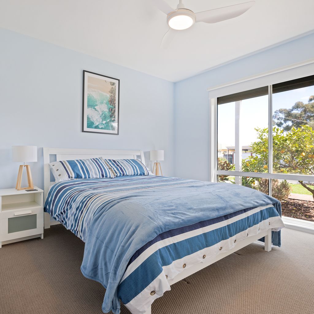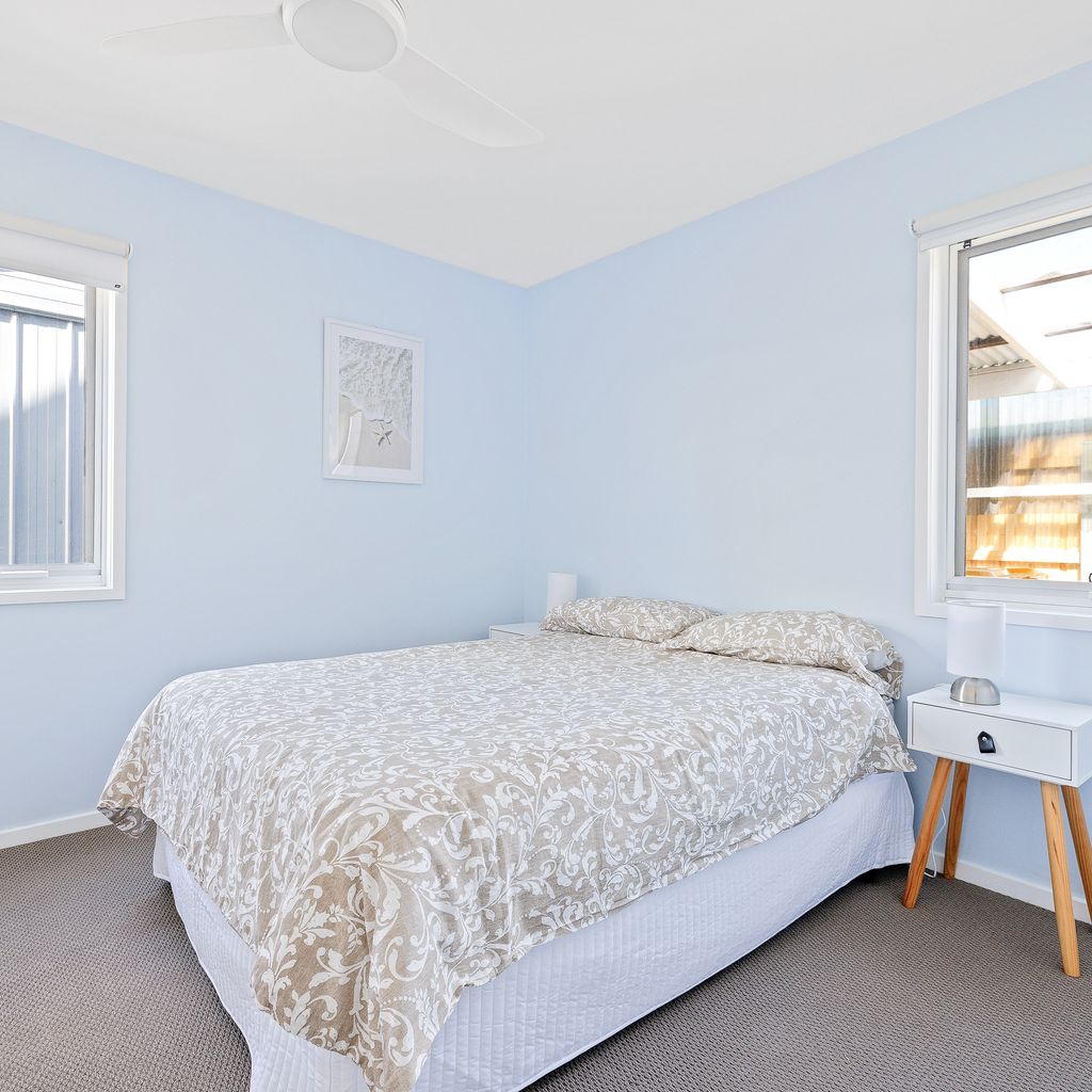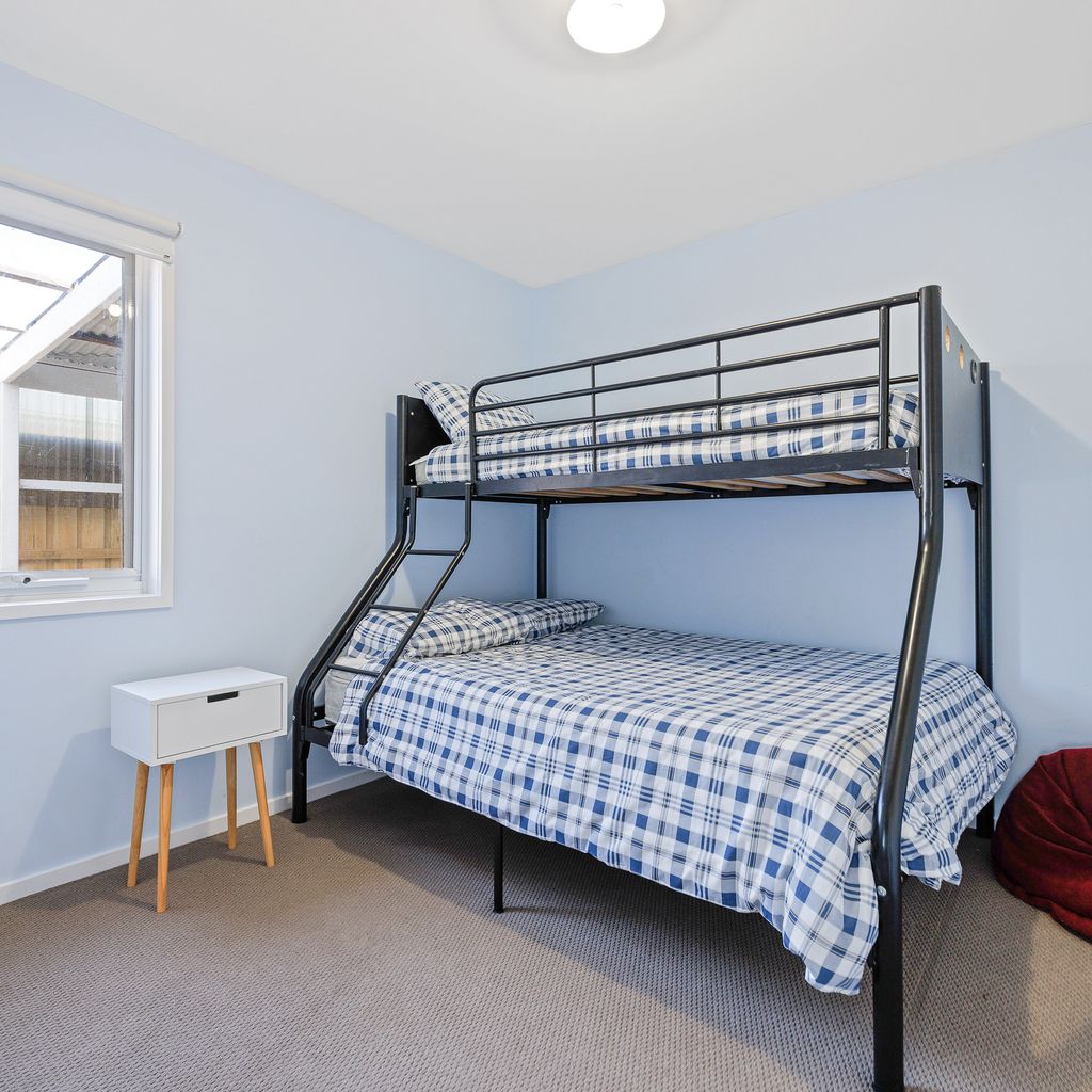 The 2nd bedroom consists of a tri-bunk (double on bottom, single on top) and the 3rd bedroom has a double bed as well as a ceiling fan. The main bathroom includes a bath and the toilet is separate. The laundry is complete with washing machine for your convenience.