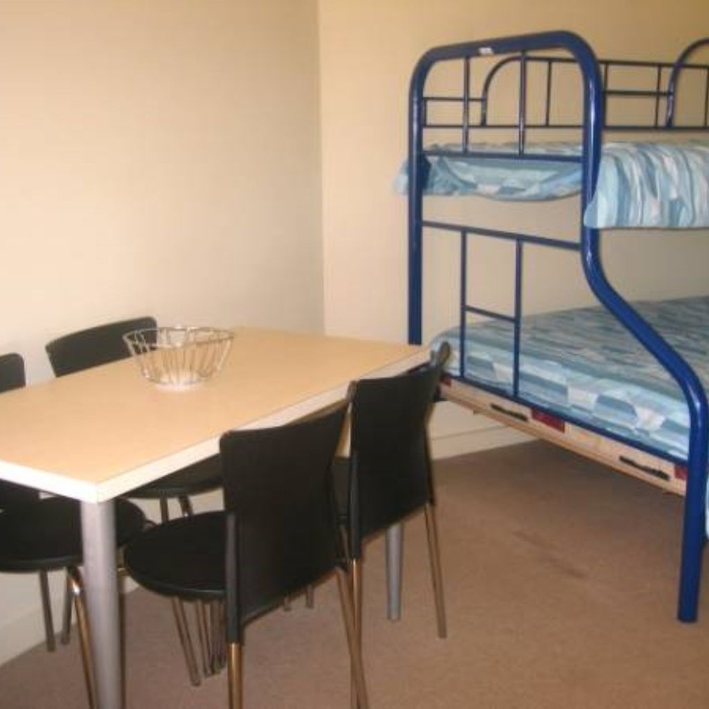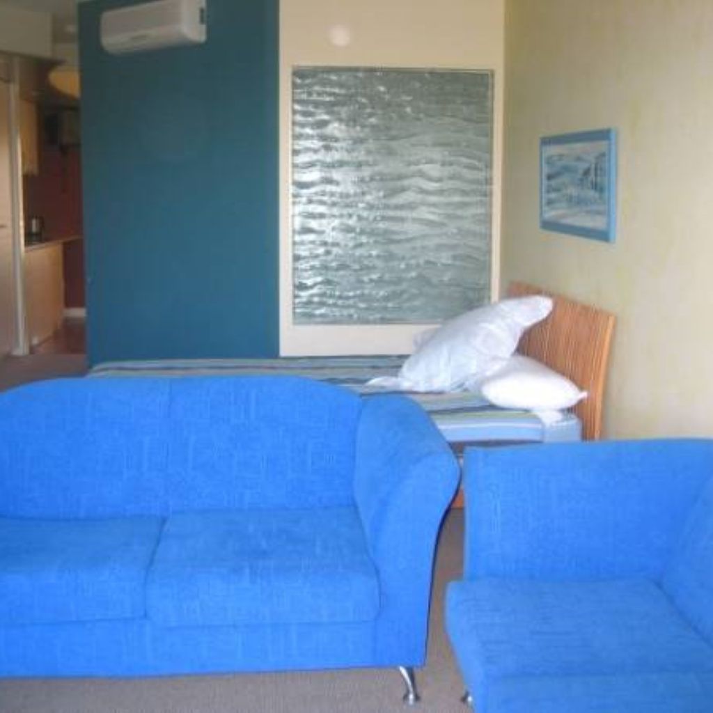 The main living has 2 sofas, a large flat screen tv and a dvd player, large sliding glass doors that open on to the balcony that has a breakfast setting. The queen bed is also part of this living area and the unit is carpeted and beautifully furnished. The second part of the apartment has the modern kitchen and dining setting for 4 and 2 single beds.