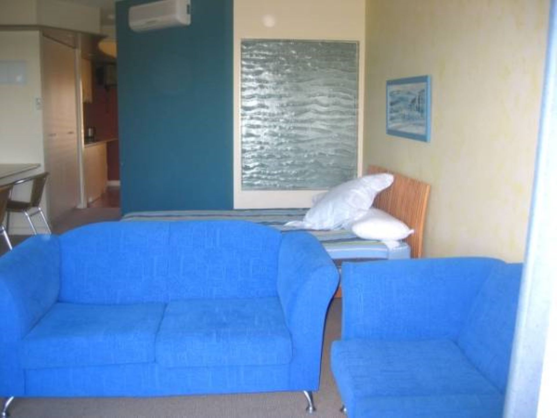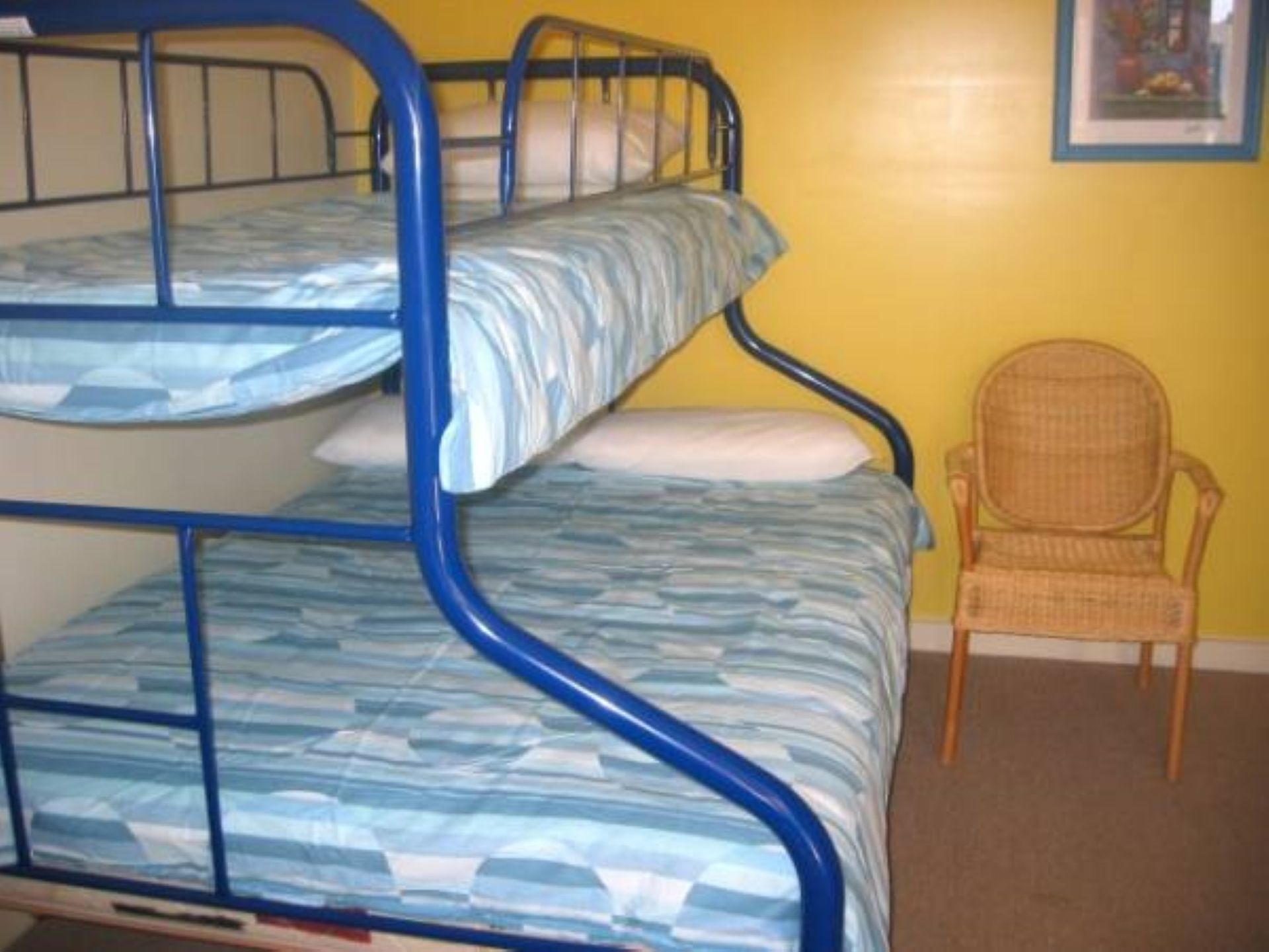 The main living has 2 sofas, a large flat screen tv and a dvd player, large sliding glass doors that open on to the balcony that has a breakfast setting. The queen bed is also part of this living area and the unit is carpeted and beautifully furnished. The second part of the apartment has the modern kitchen and dining setting for 4 and 2 single beds.
