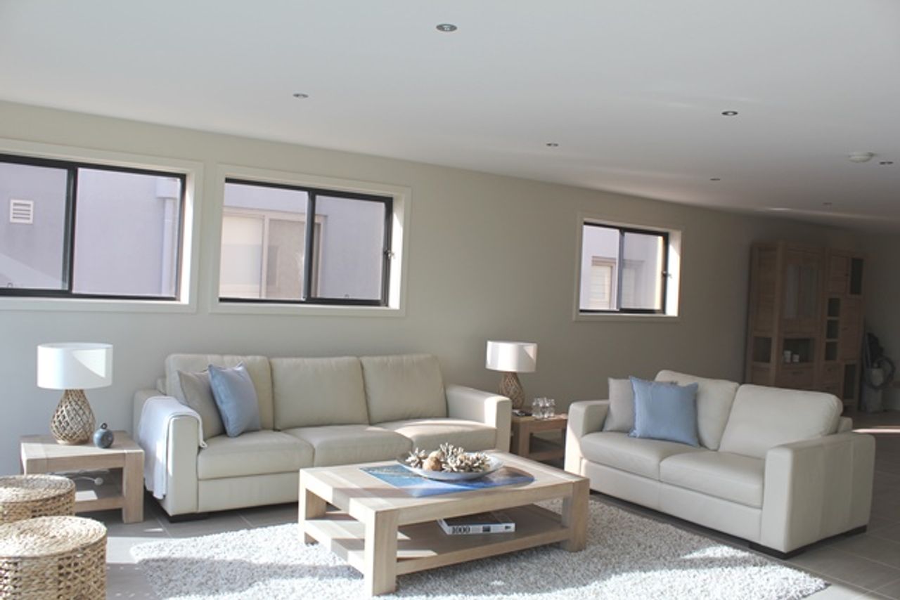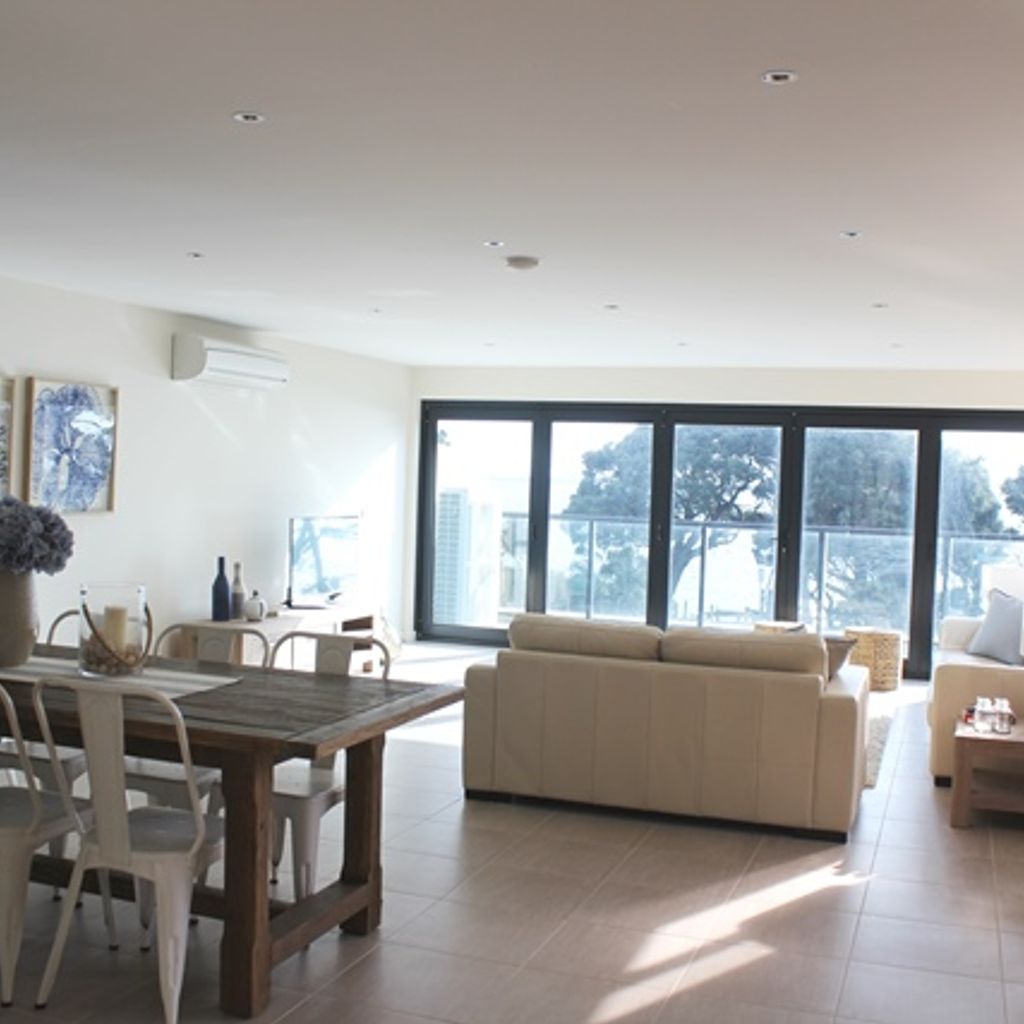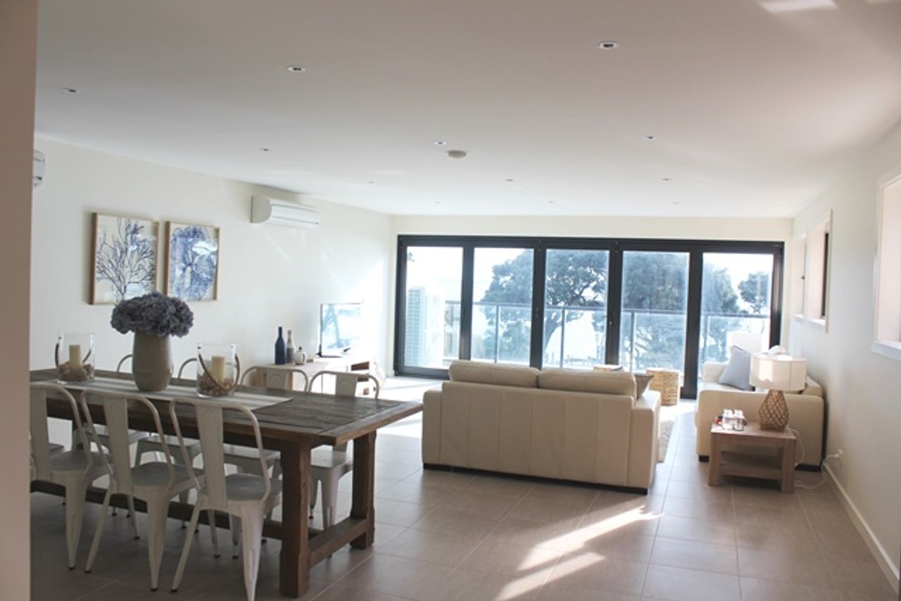 A north facing lounge provides a sunny environment. And, with comfortable leather sofas, flat screen Tv and dvd player, and a split system in the main living area all the seasons are covered. Enjoy the spacious feel of the living, dining and kitchen area. The kitchen has electric cooking appliances, microwave, dishwasher and all you need to prepare and serve the family meals. Sit at the 8 seater dining table or open up the glass doors to the undercover balcony with bbq and take in the stunning sea views.