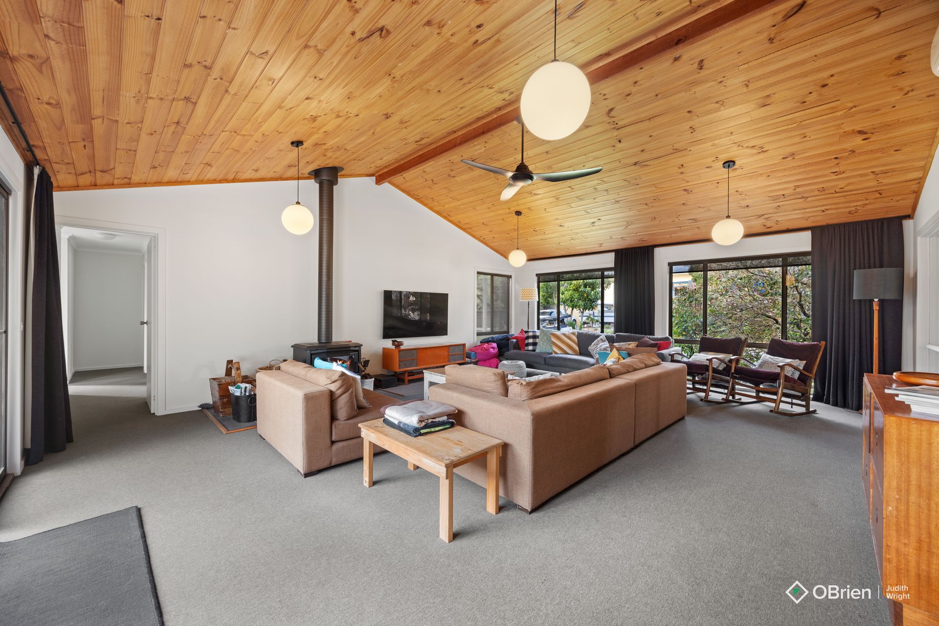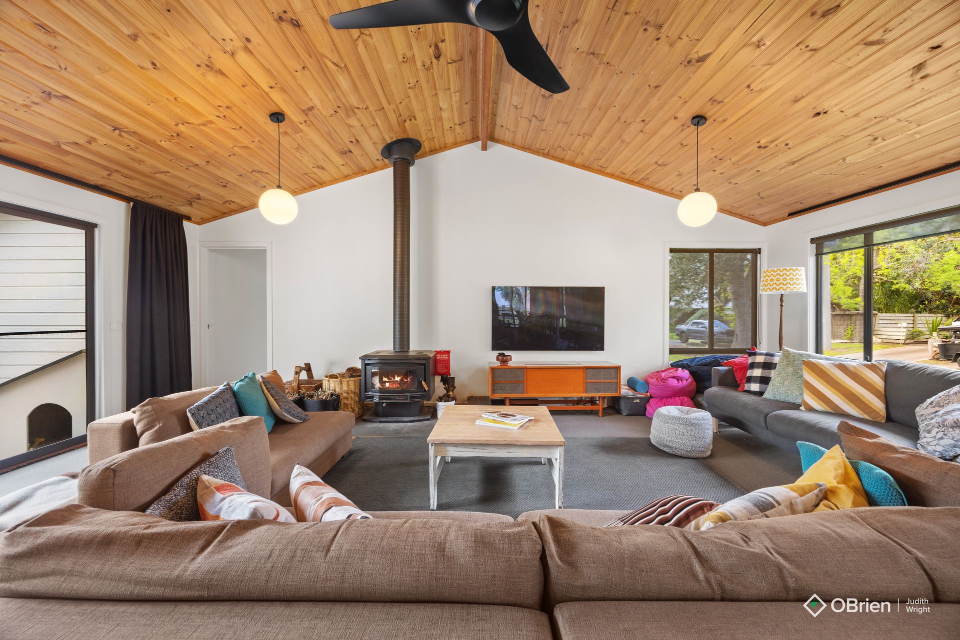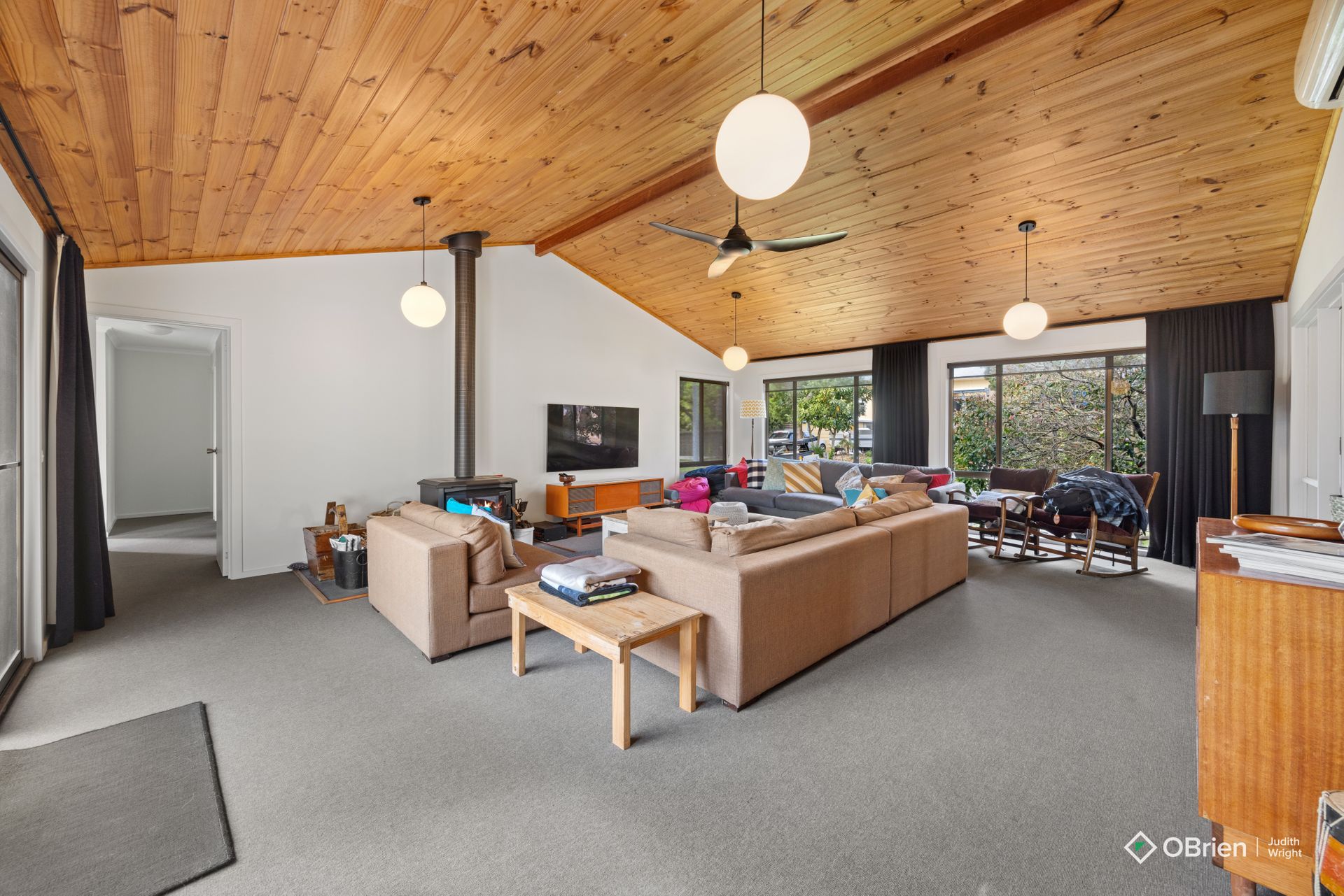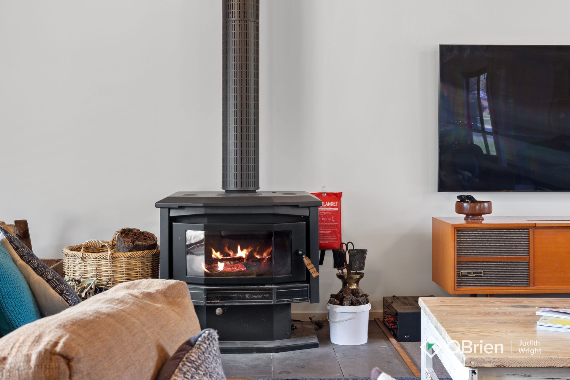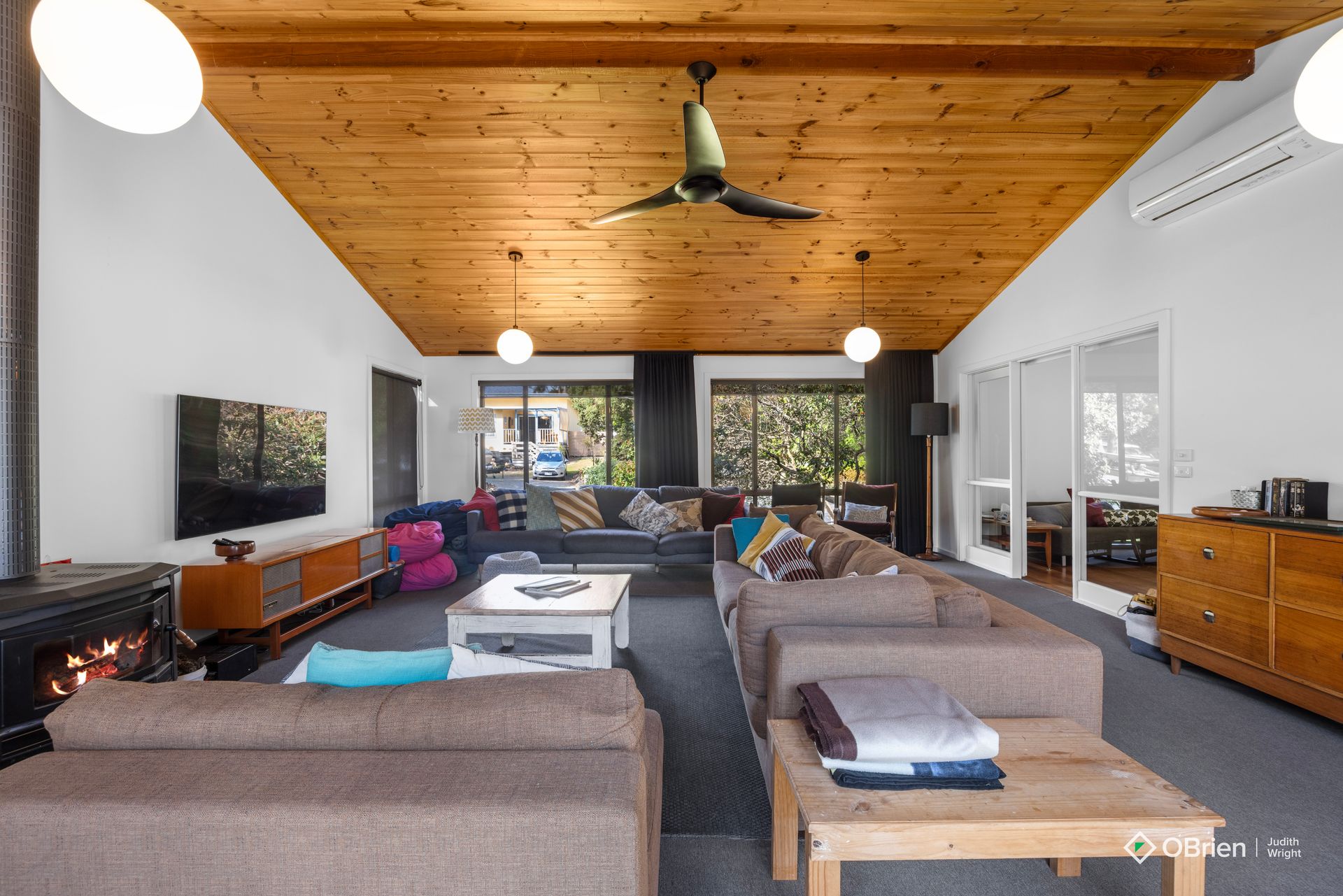 Living Area: Cozy up by the Combustion Wood Fireplace on cooler evenings or enjoy the comfort of the air-conditioned space.
