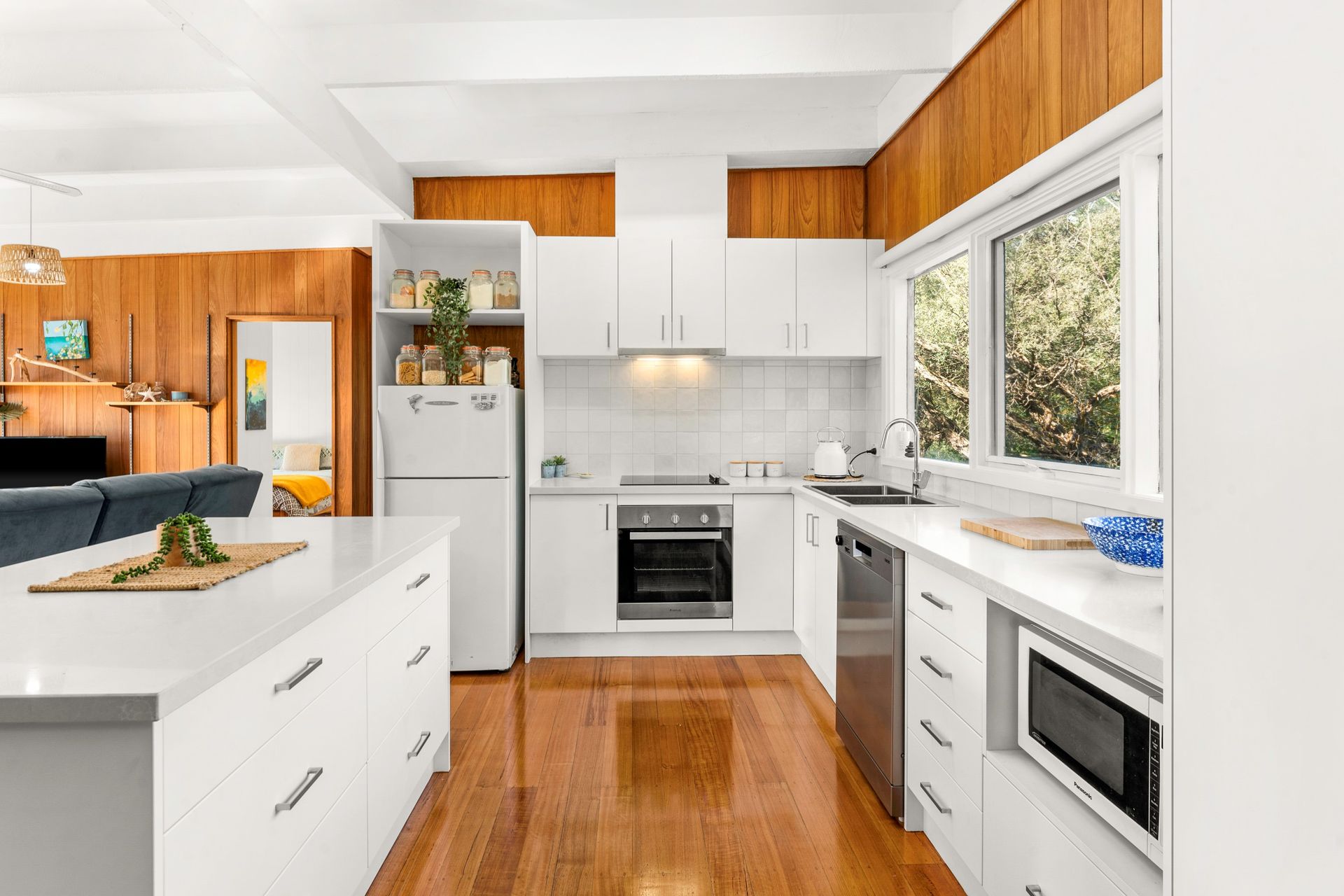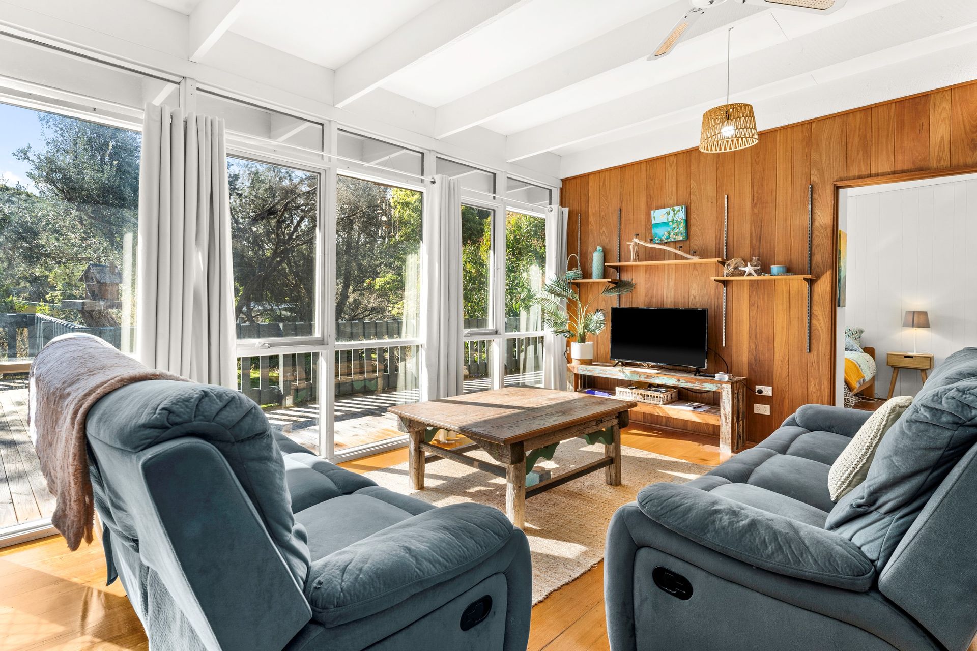 Upon entering, you'll be welcomed into an inviting open-plan layout that seamlessly connects the lounge, kitchen, and dining areas. The bright and airy space, adorned with beachy-themed decor, sets the stage for relaxed gatherings and cherished moments with loved ones. Whip up delicious meals in the fully equipped kitchen or savor the outdoors with a Weber BBQ on the deck, where the joys of alfresco dining await.