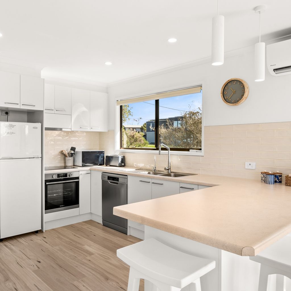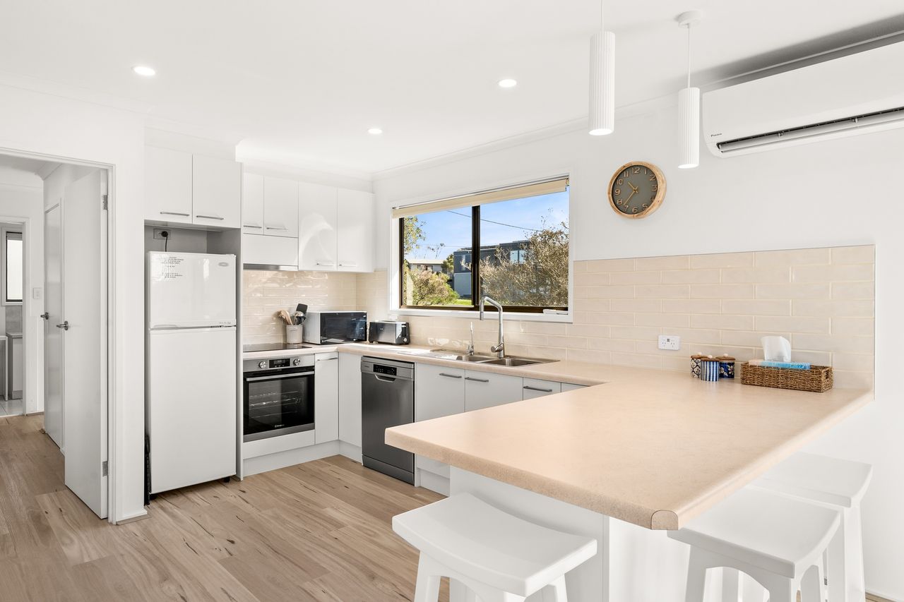 The fully equipped kitchen includes electric oven and cooktop, microwave and dishwasher along with all the essentials for up to 6 guests. Downstairs is the laundry with washing machine and clothes line.