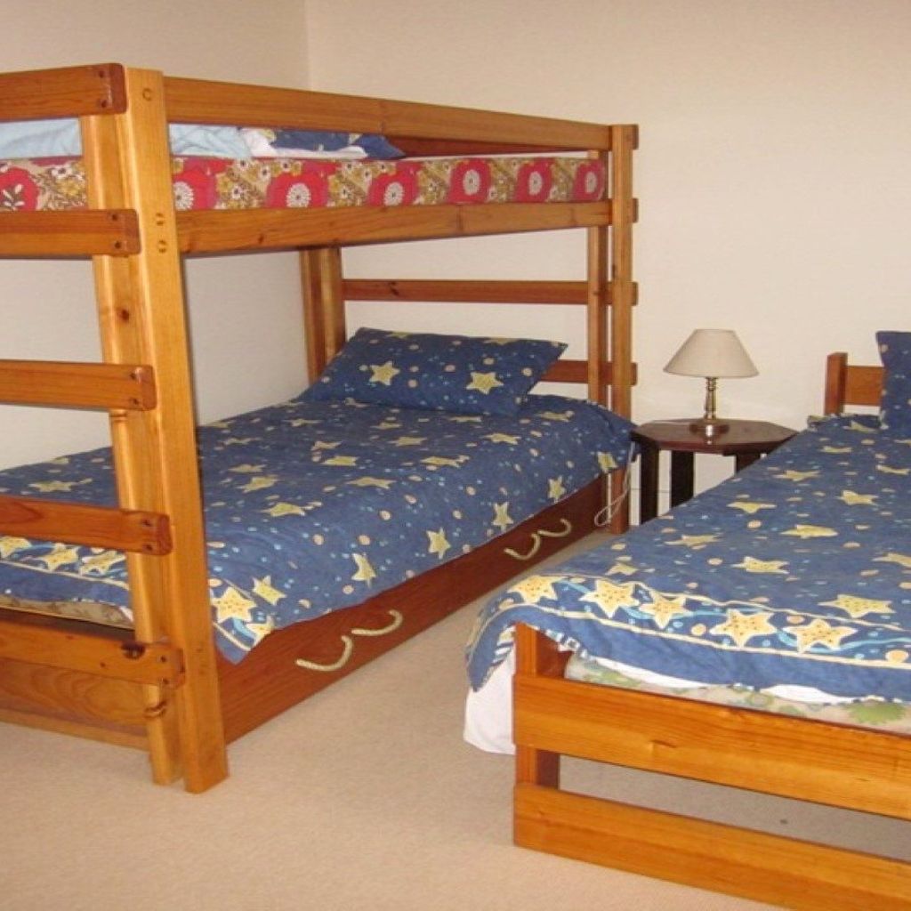 Bedroom 1 has a queen size bed, side table and lamps. Bedroom 2 has a queen size bed with bedside table and lamps. Bedroom 3 offers a bunk bed and extra single bed.