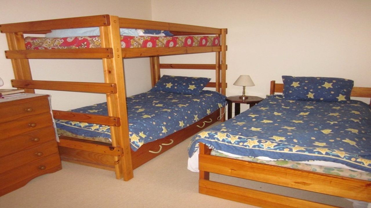 Bedroom 1 has a queen size bed, side table and lamps. Bedroom 2 has a queen size bed with bedside table and lamps. Bedroom 3 offers a bunk bed and extra single bed.