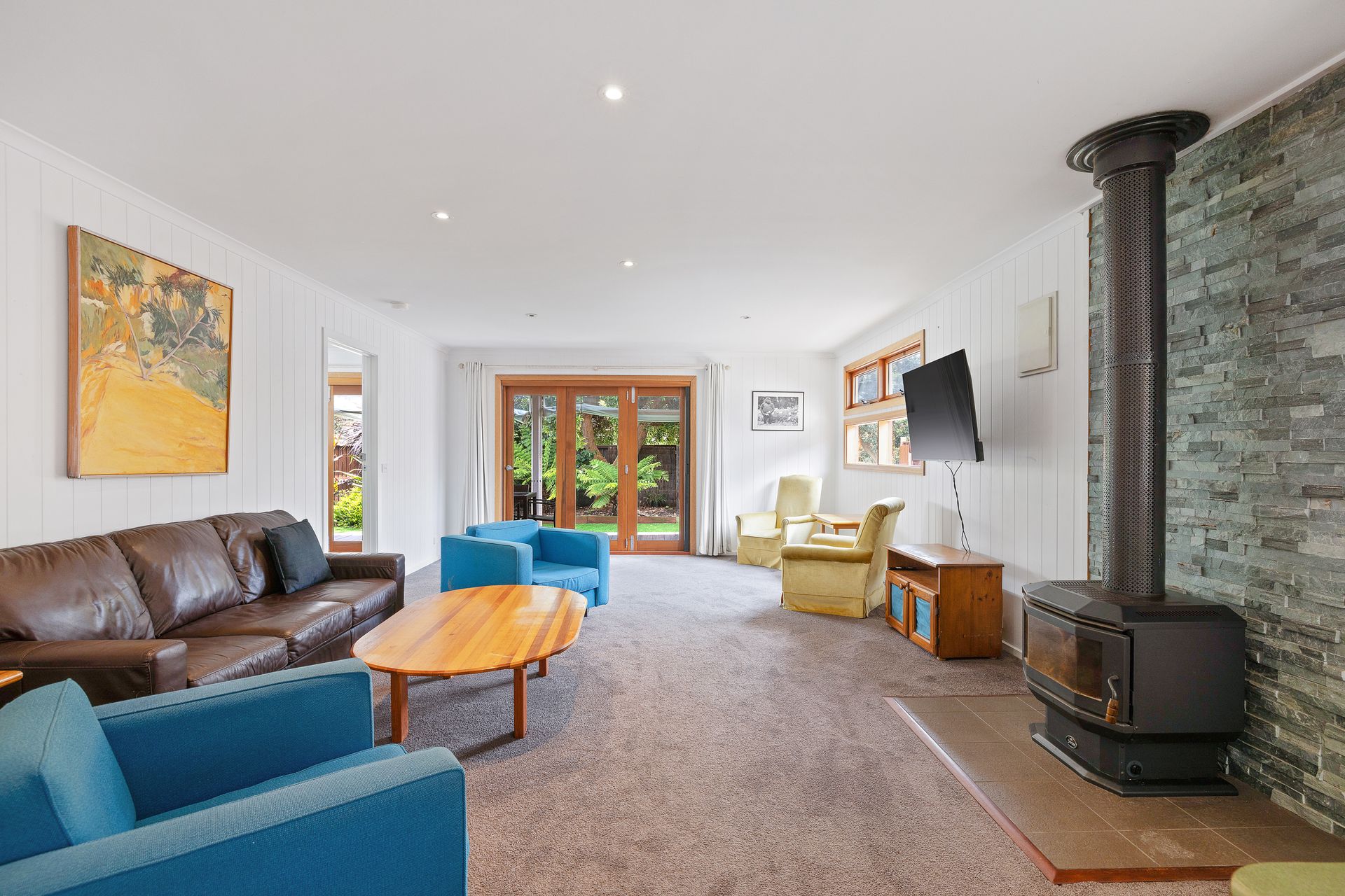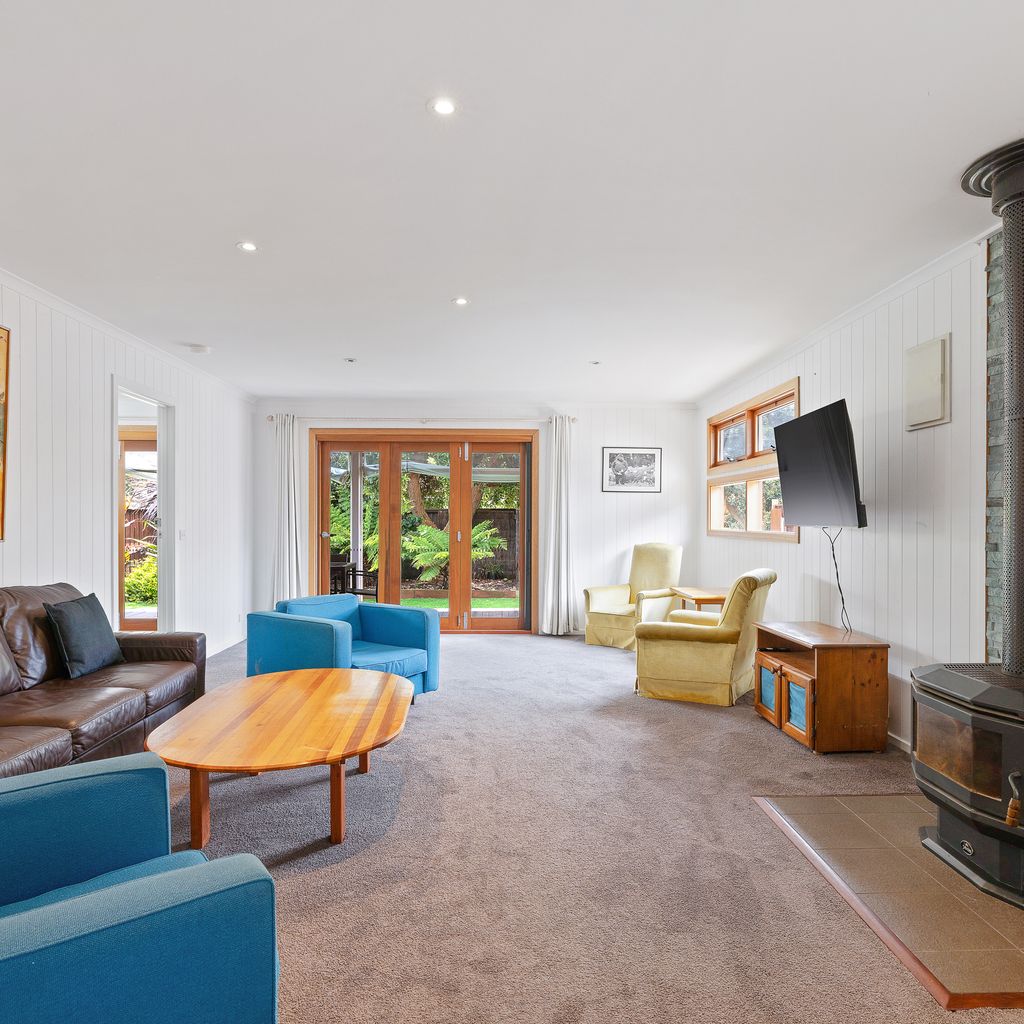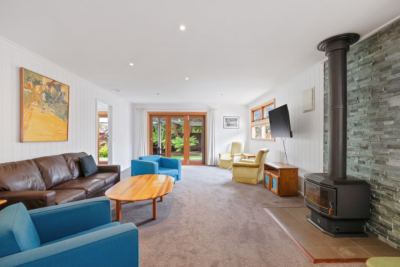 Bright open plan living and dining area, with reverse cycle air conditioning, flat screen Smart T.V, and free WIFI. A wood fire surrounded by a comfy couch and chairs to seat 7 guests for those cosy winter nights. Kitchen is fully equipped with filtered drinking water, a gas stove top, fridge, oven, microwave, toasty and all the kitchen amenities you would require.