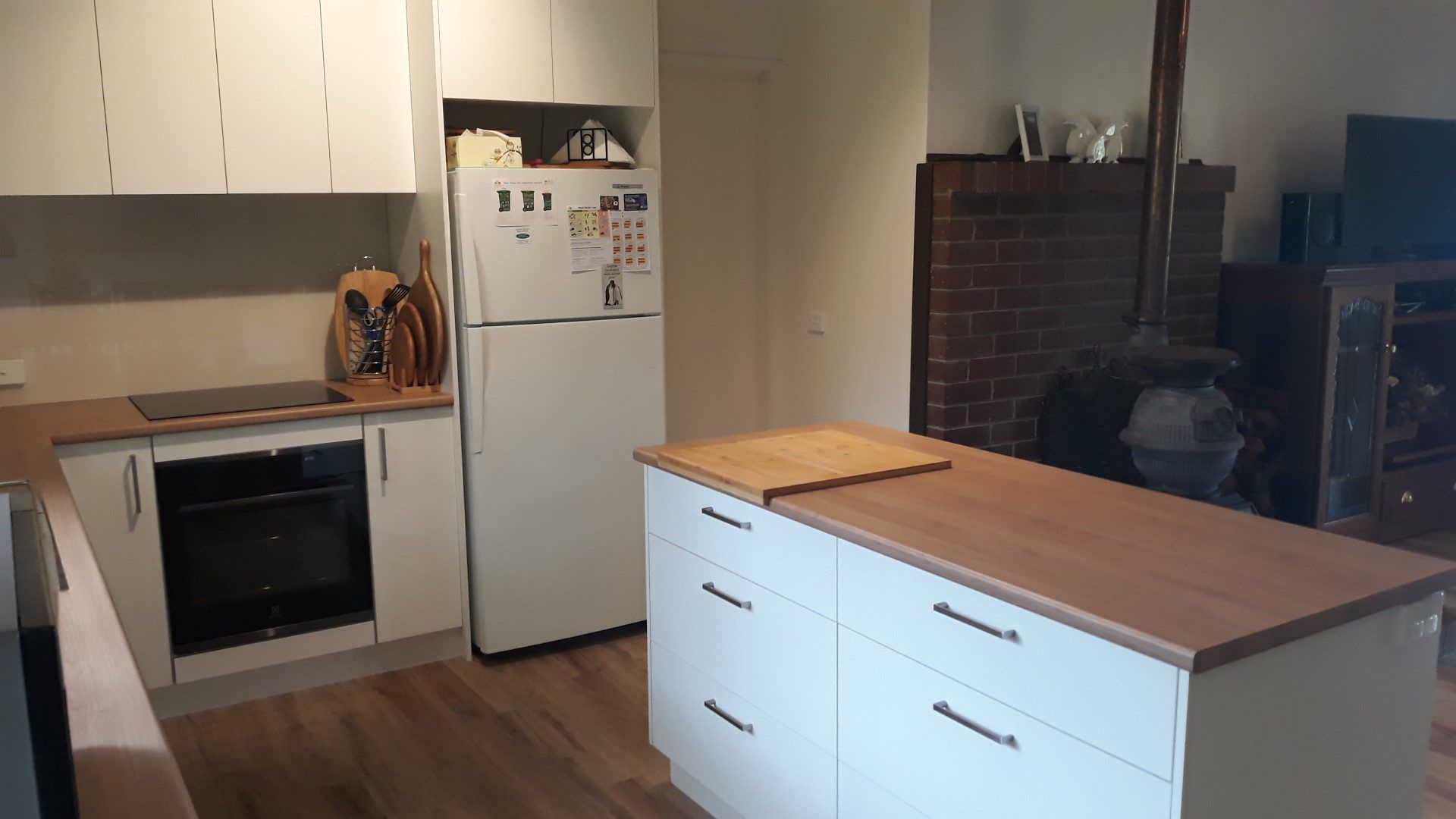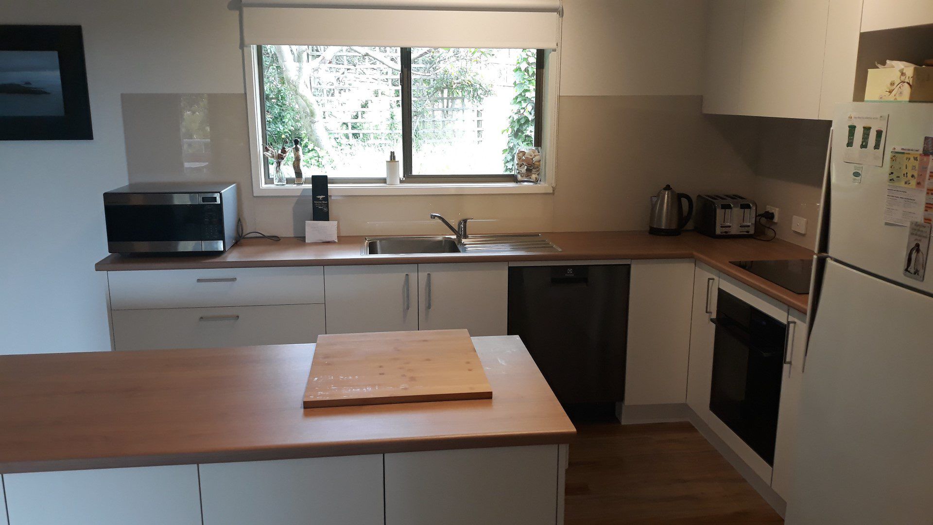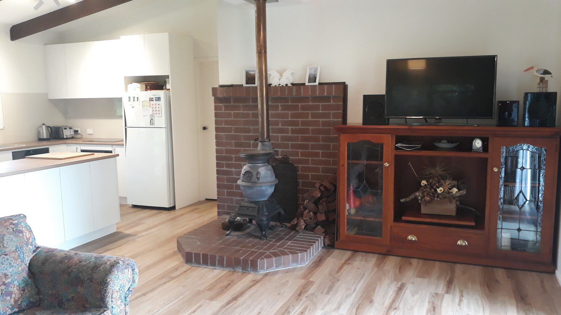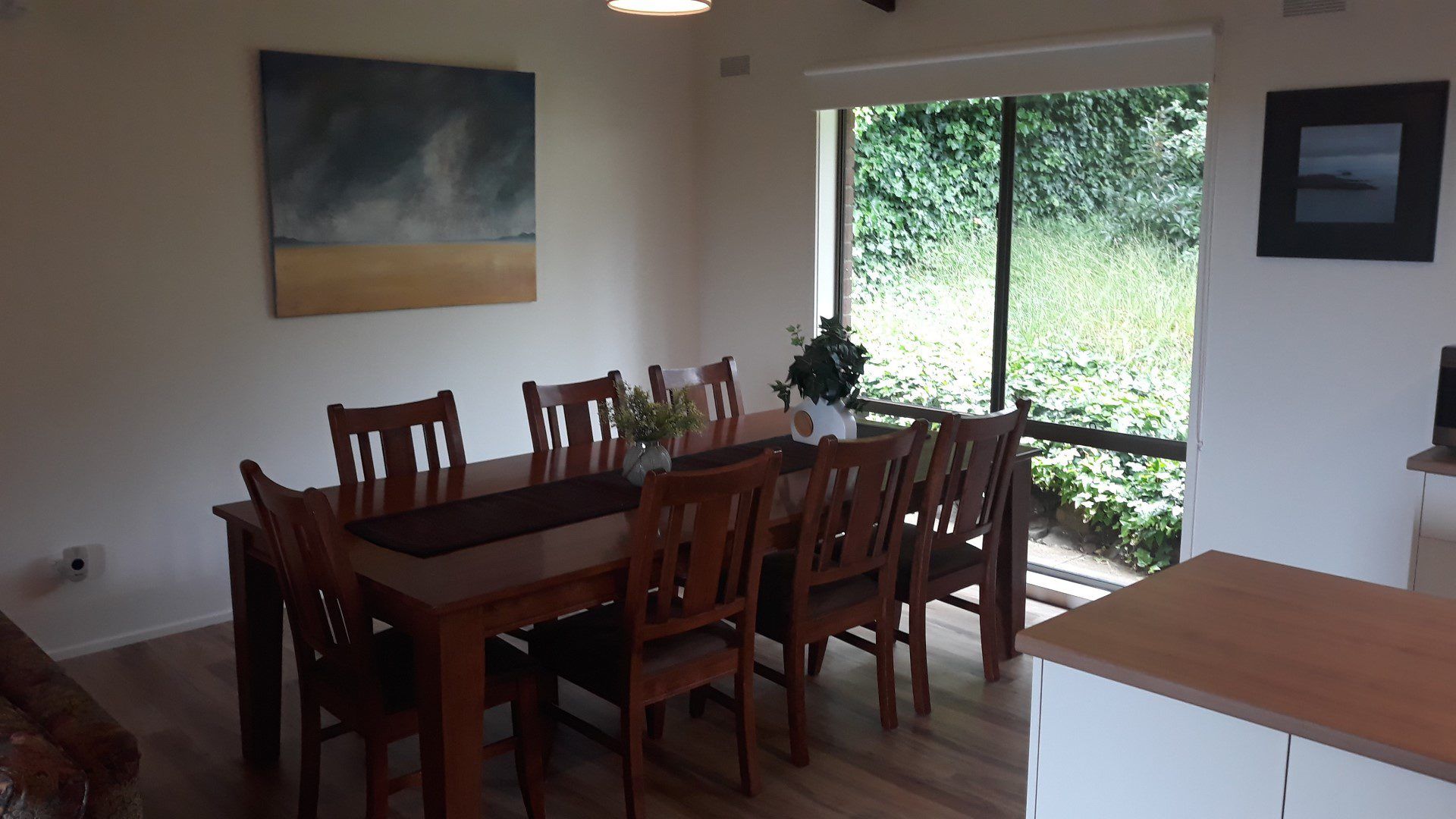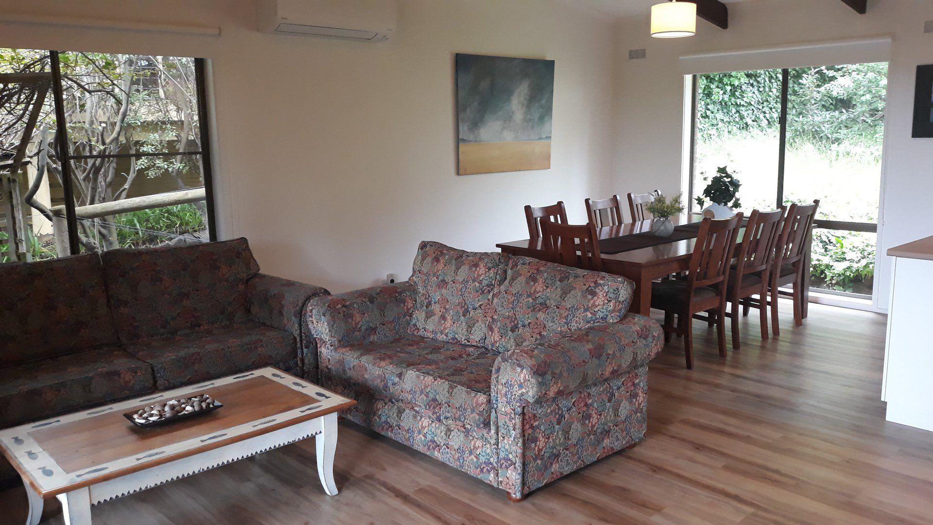 Inside the home is lovely and sunny with a very comfortable lounge area including tv and dvd. There is a large dining table and a well equipped kitchen. The kitchen has electric cooking, microwave and dishwasher. Heating is provided by a pot belly stove and a split system heating and cooling unit in the lounge.