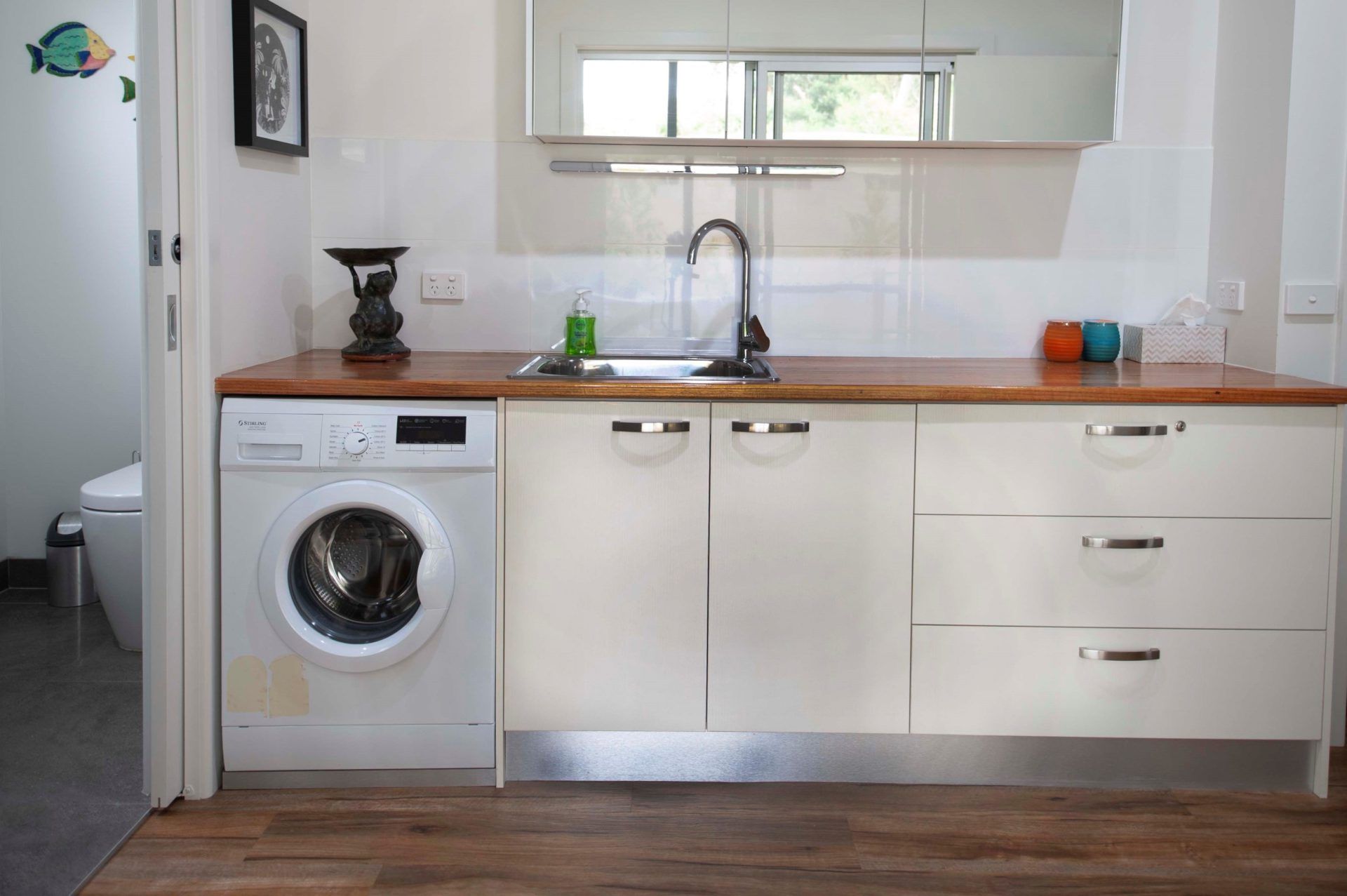The bathroom has a walk in shower and a full sized bath and there is an extra shower and toilet off from the laundry which makes it perfect for 2 families. A washing machine is provided for your convenience.