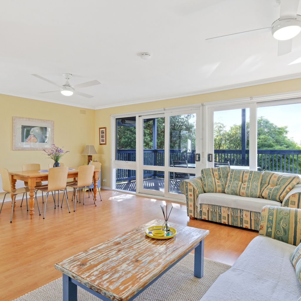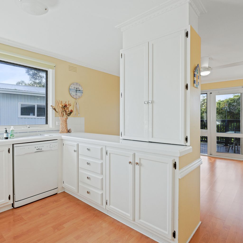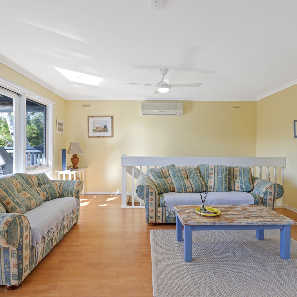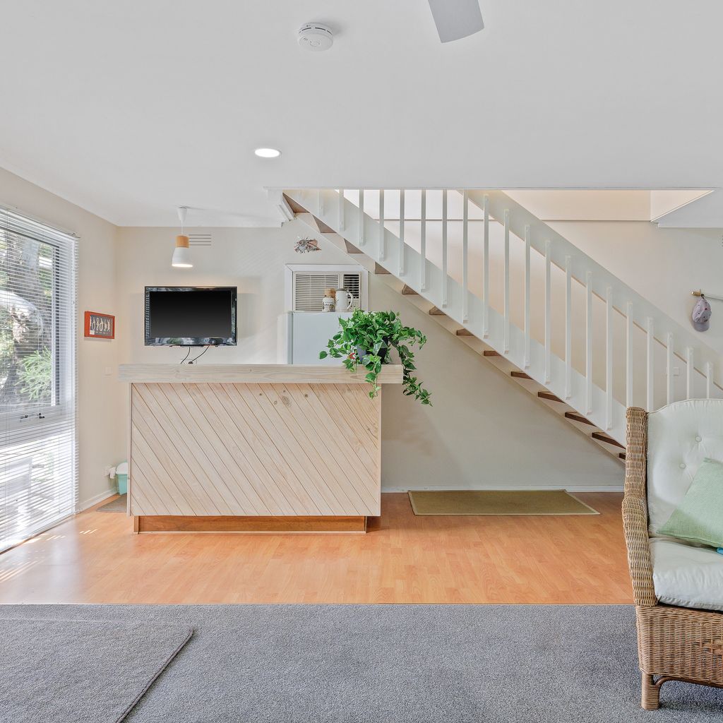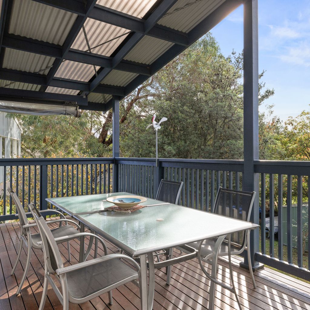 Upstairs is comprised of open plan kitchen, dining and lounge with tv & air conditioner / heater (split system). The kitchen has electric cooking, microwave and dishwasher. The dining table seats six. Open up the doors and step out onto a new deck with Bbq and outdoor setting and zip down plastic walls to enclose the area on a windy day. The 3 bedrooms and family bathroom are on this level.
