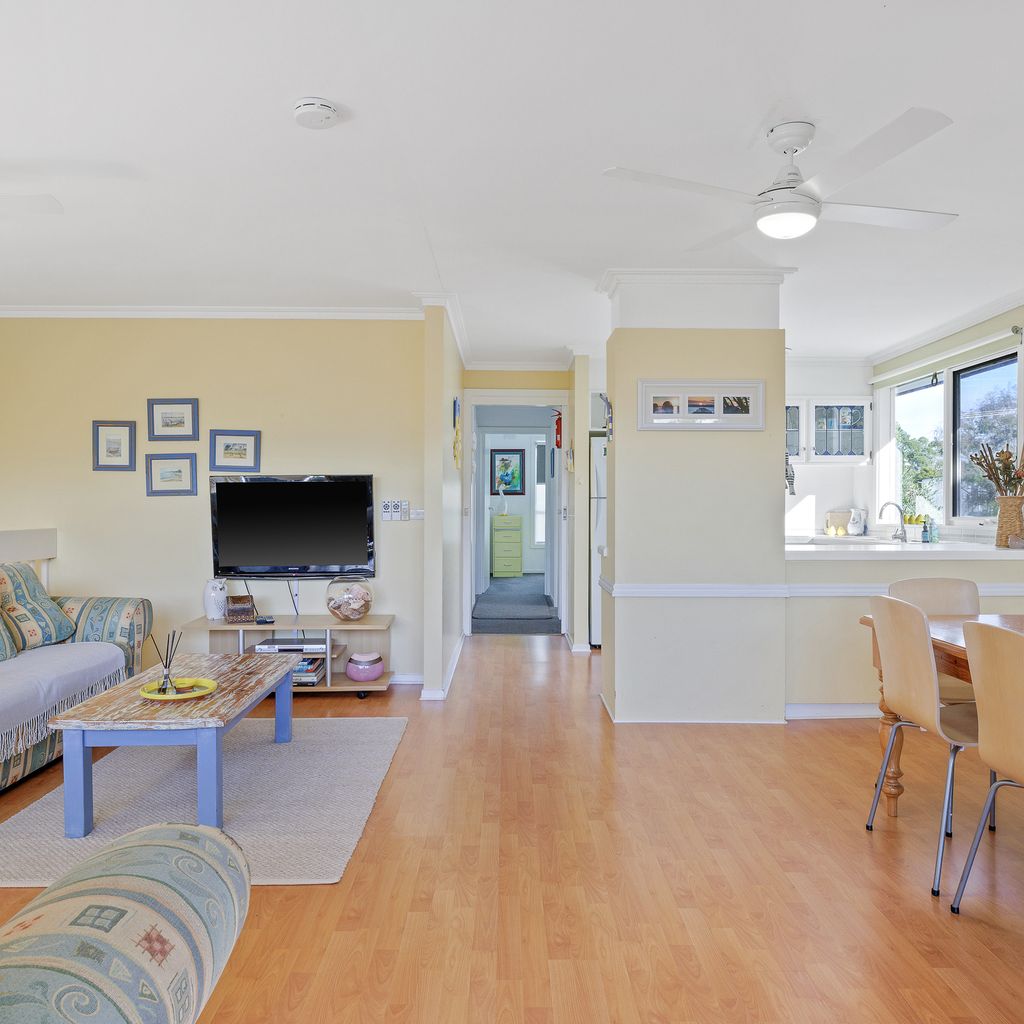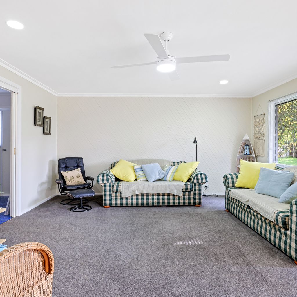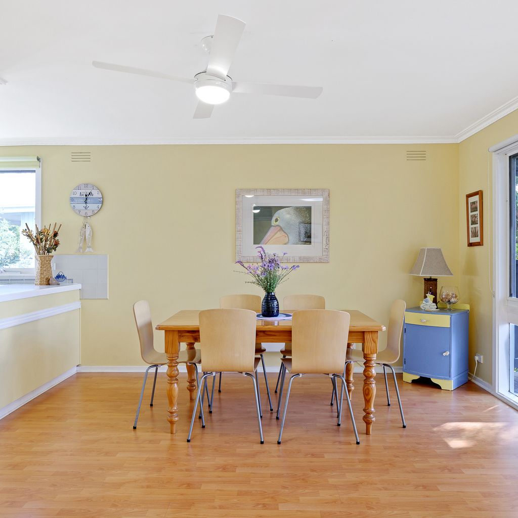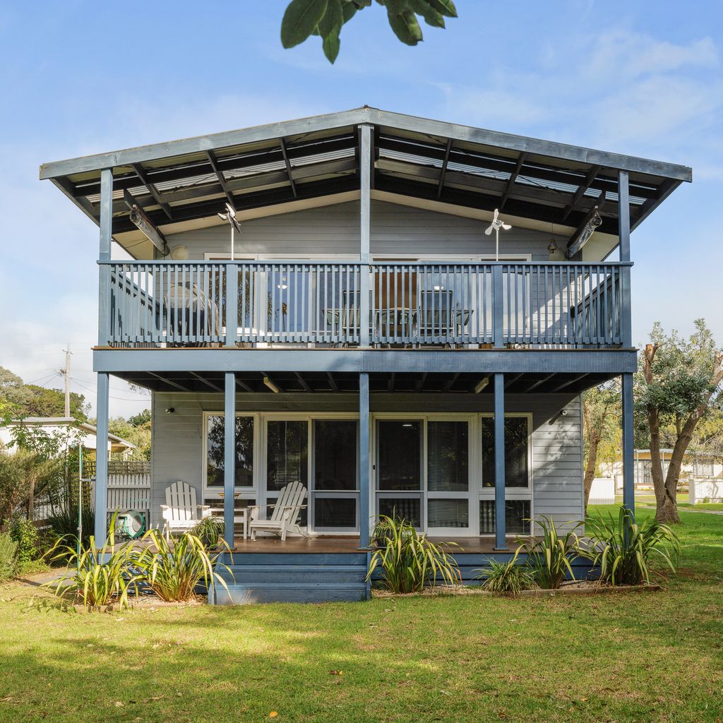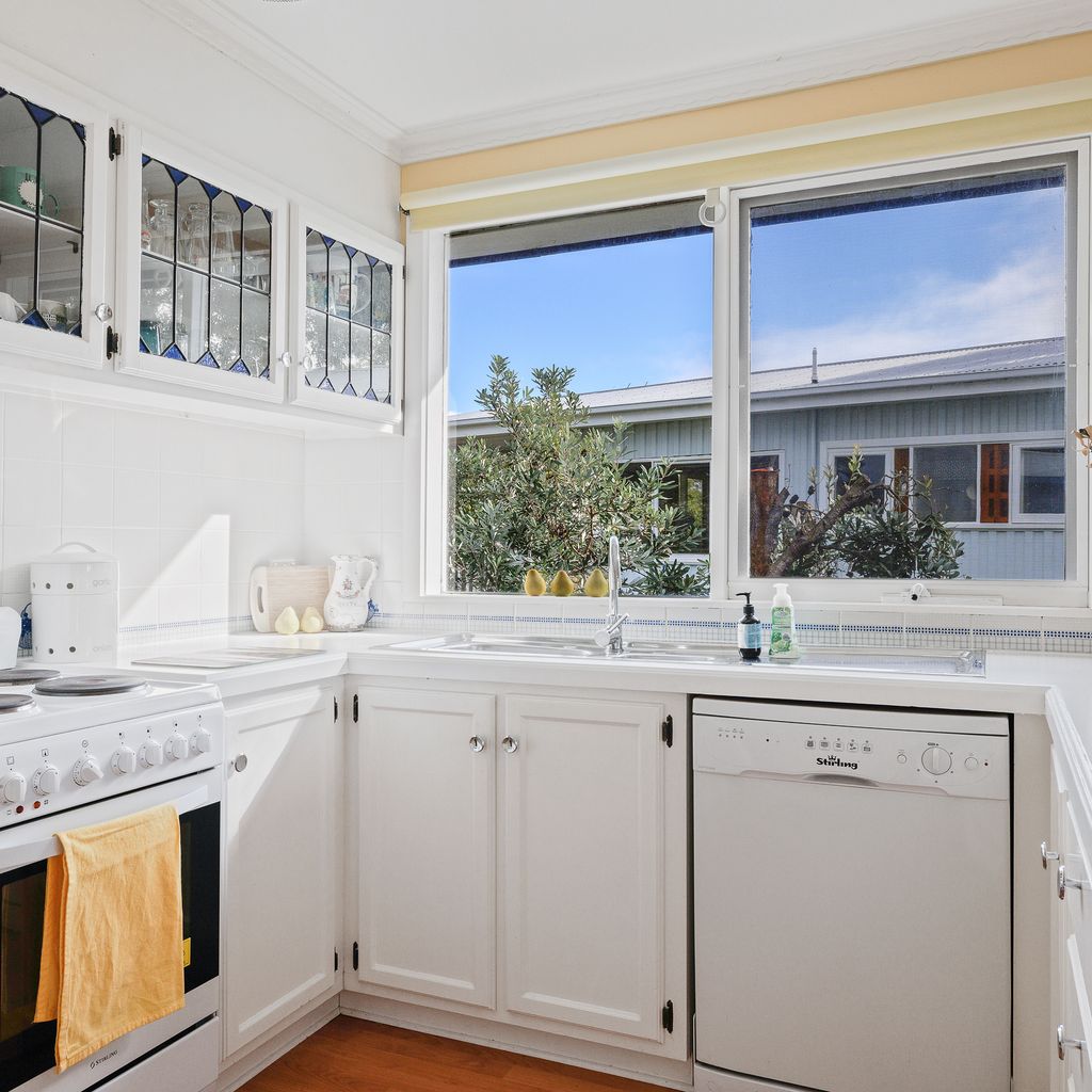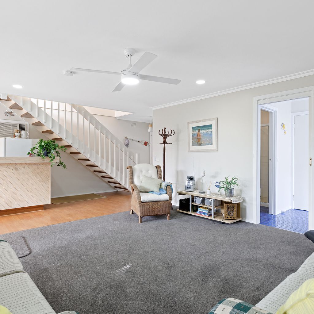 Upstairs is comprised of open plan kitchen, dining and lounge with tv & air conditioner / heater (split system). The kitchen has electric cooking, microwave and dishwasher. The dining table seats six. Open up the doors and step out onto a new deck with Bbq and outdoor setting and zip down plastic walls to enclose the area on a windy day. The 3 bedrooms and family bathroom are on this level.