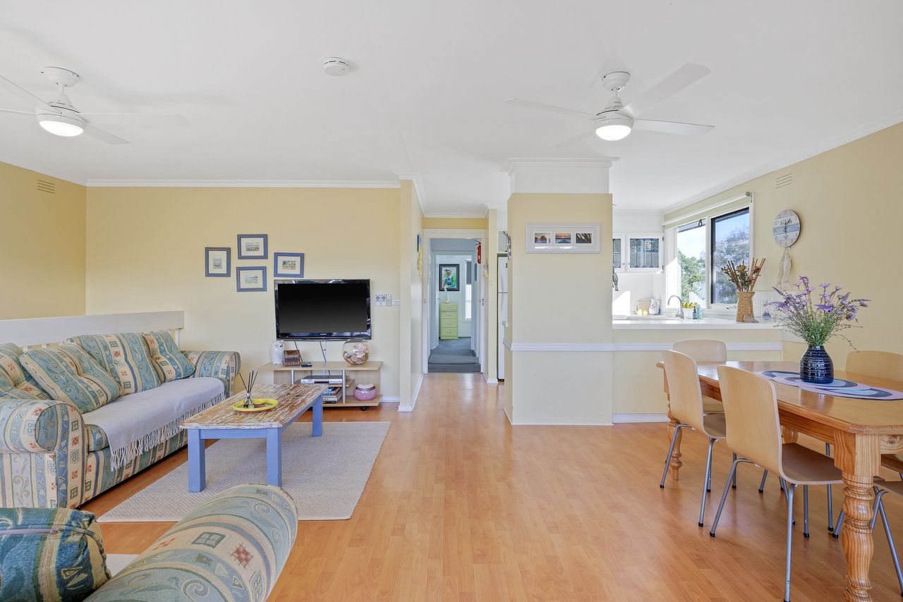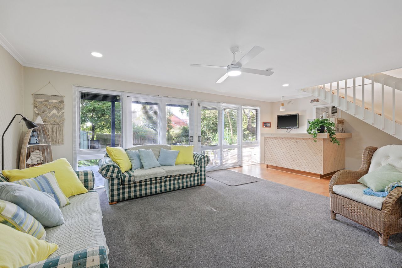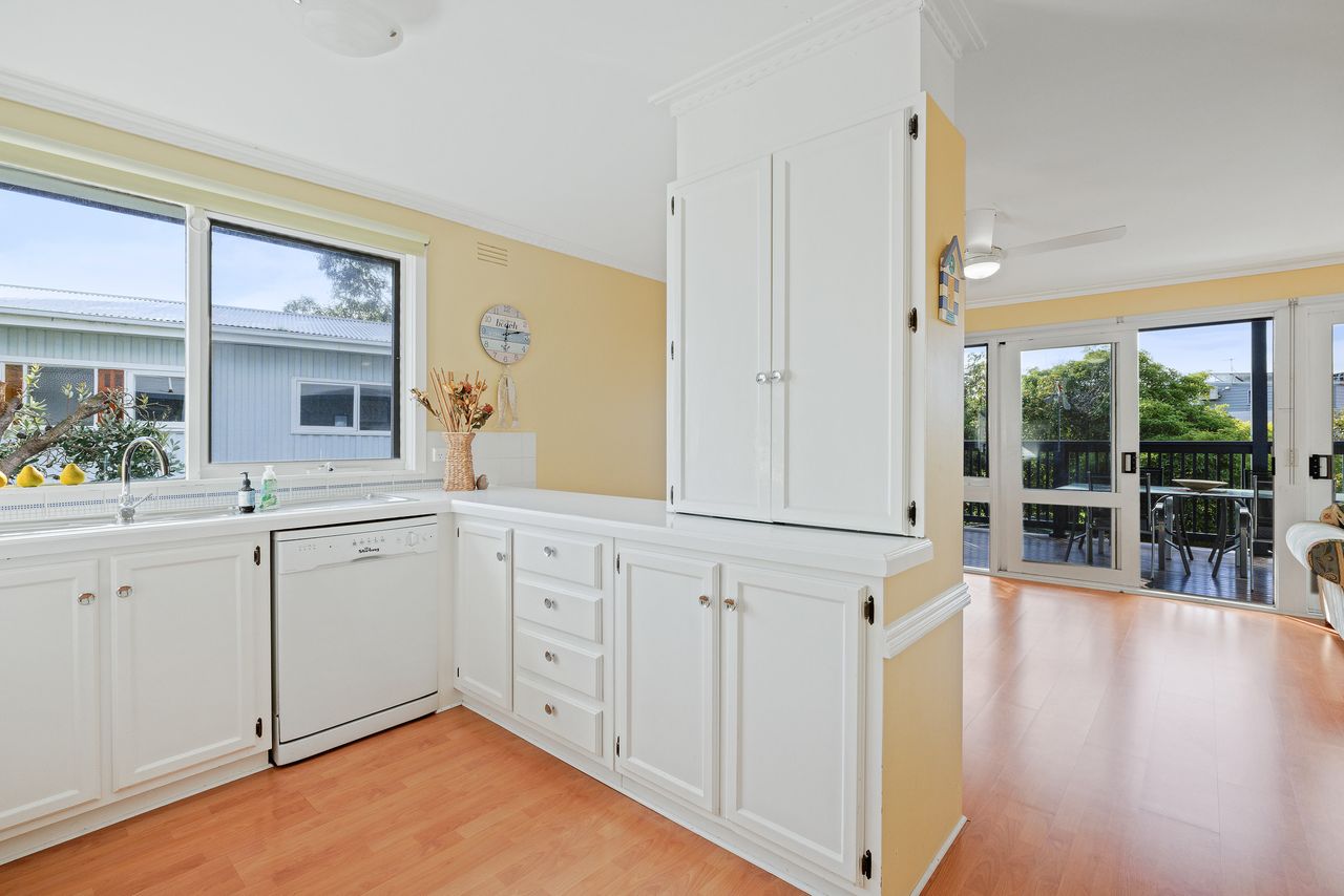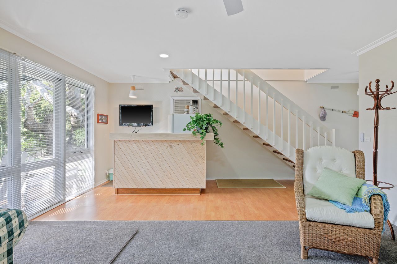 Upstairs is comprised of open plan kitchen, dining and lounge with tv & air conditioner / heater (split system). The kitchen has electric cooking, microwave and dishwasher. The dining table seats six. Open up the doors and step out onto a new deck with Bbq and outdoor setting and zip down plastic walls to enclose the area on a windy day. The 3 bedrooms and family bathroom are on this level.
