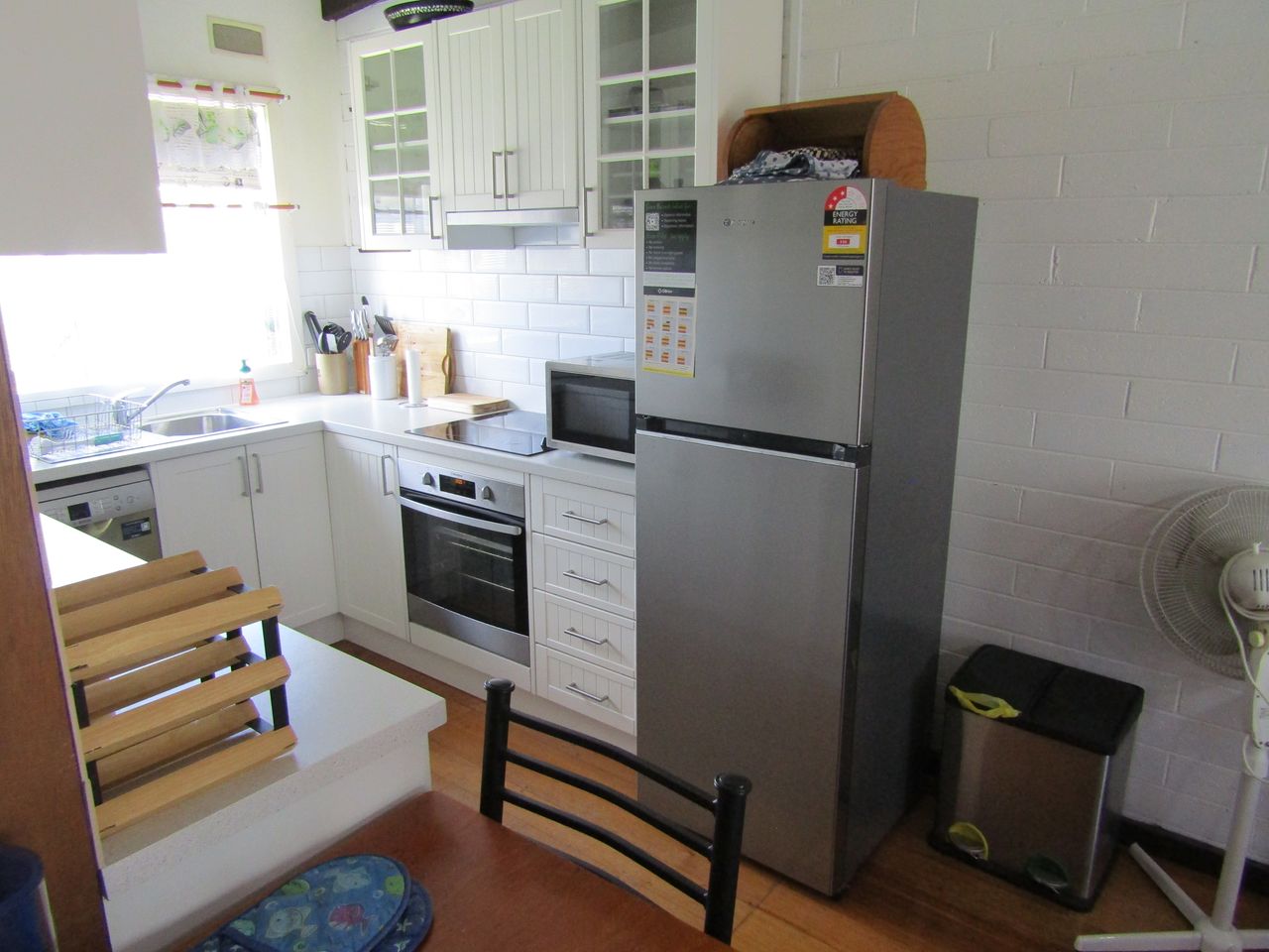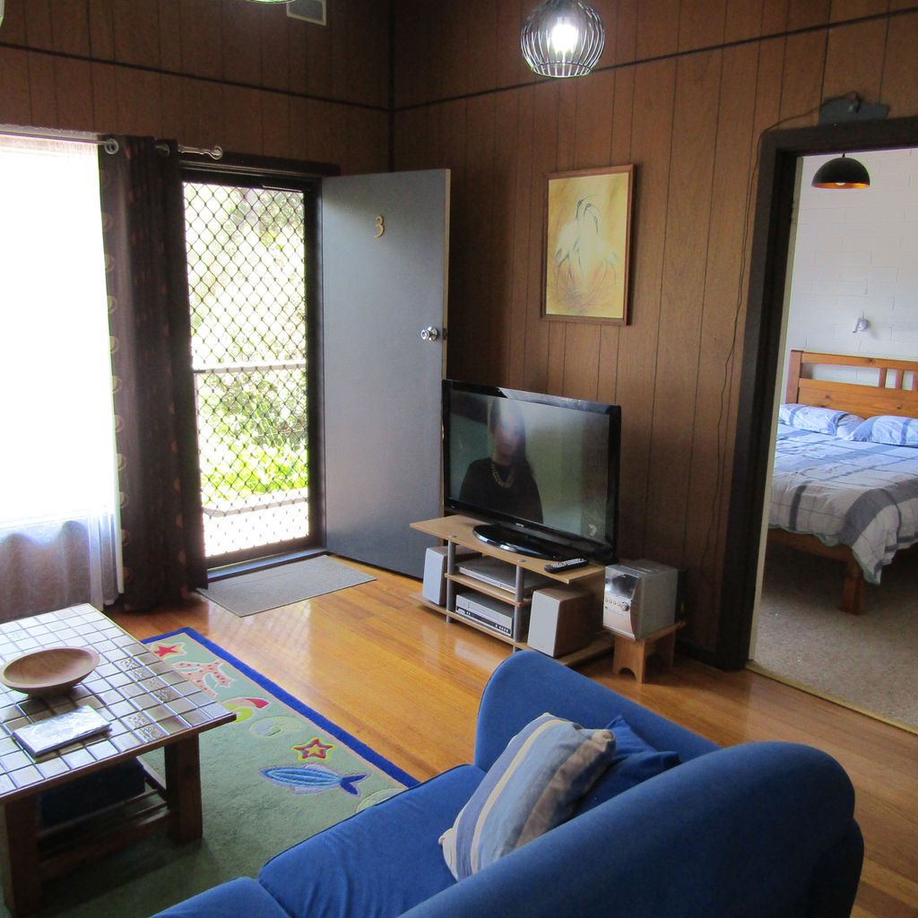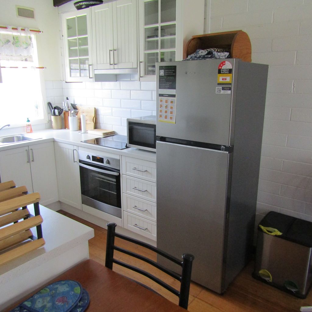 Inside the unit is snug with comfortable sofas, flat screen tv and dvd player and a reverse cycle split system in the main living area. The kitchen is brand new with a new electric oven and hotplates and dishwasher. There is a medium sized fridge and a microwave. The kitchen is fully self-contained with ample pots and pans, cutlery and crockery.