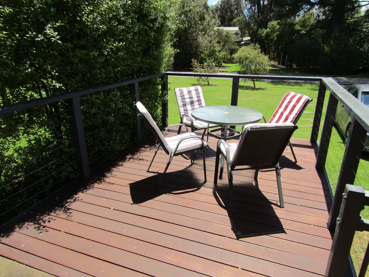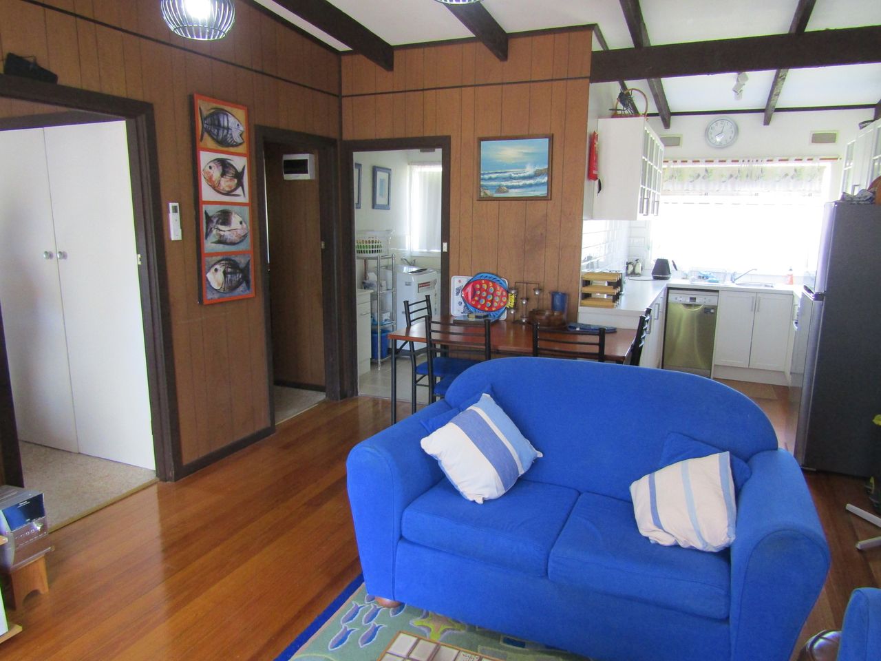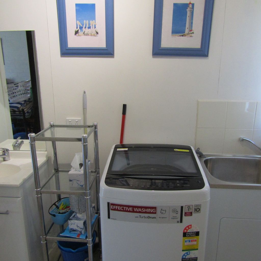 A central dining table completes the living area. There are two bedrooms and the bathroom is combined with the laundry where there is a washing machine, iron and ironing board, laundry trough, wash basin, shower and toilet. There is a lovely deck at the front of the property with room to sit in the sun and relax.