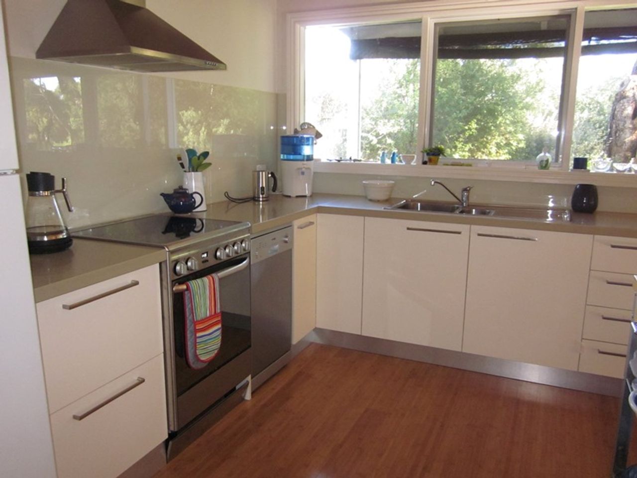 The main lounge has flat screen TV and DVD player, comfortable sofas, polished boards, a large wood heater, along with gas heating. The kitchen is well equipped with electric cooking, a microwave and a large fridge. You will find plenty of platters and salad bowls perfect for bbqs on the deck. There is also a central dining table.