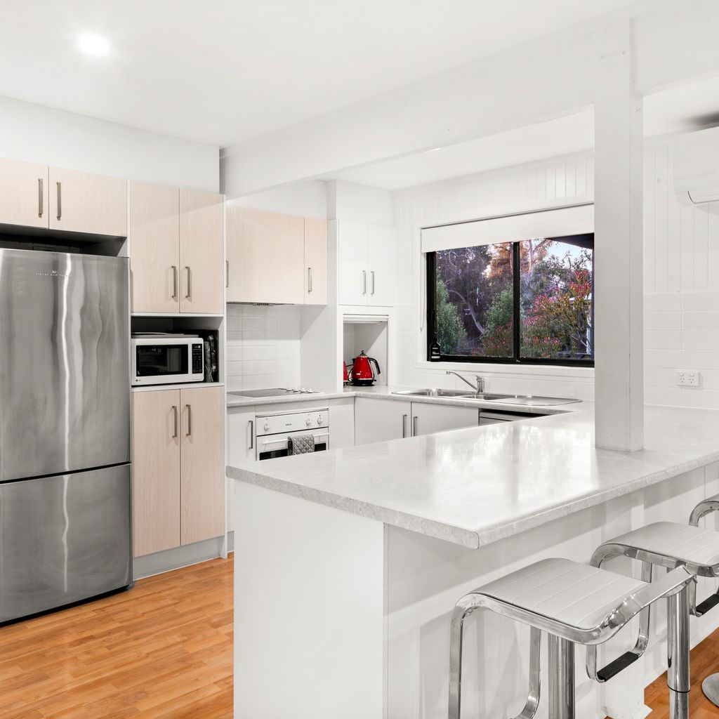 Inside, you’ll find a light-filled open plan living, kitchen, and dining area on the ground floor. There’s a wood fire to keep you warm in winter, along with ceiling fans and reverse cycle air-conditioning for year-round comfort. The kitchen is fully equipped with a dishwasher, microwave, electric oven and stovetop, and plenty of bench space for preparing family meals. Glass doors open onto a deck that overlooks the garden, perfect for morning coffee or evening drinks.