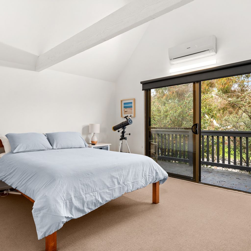 Upstairs, the master bedroom features a queen bed, reverse cycle air-conditioning, and a private balcony where you can enjoy the peaceful surroundings. There’s also a telescope for stargazing, and a study nook with a monitor and printer if you need to check in with work during your stay. The main bathroom includes a shower over a full-sized bath. A fourth bedroom upstairs offers a tri-bunk (double bed below and single above) and its own air-conditioning.