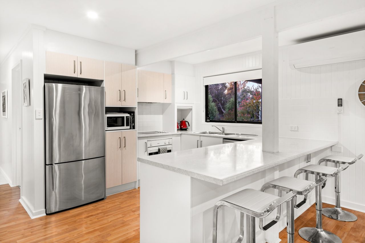 Inside, you’ll find a light-filled open plan living, kitchen, and dining area on the ground floor. There’s a wood fire to keep you warm in winter, along with ceiling fans and reverse cycle air-conditioning for year-round comfort. The kitchen is fully equipped with a dishwasher, microwave, electric oven and stovetop, and plenty of bench space for preparing family meals. Glass doors open onto a deck that overlooks the garden, perfect for morning coffee or evening drinks.