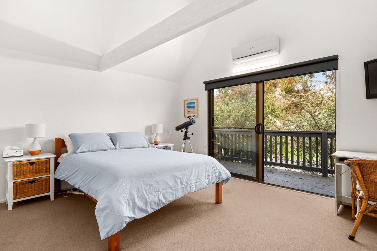 Upstairs, the master bedroom features a queen bed, reverse cycle air-conditioning, and a private balcony where you can enjoy the peaceful surroundings. There’s also a telescope for stargazing, and a study nook with a monitor and printer if you need to check in with work during your stay. The main bathroom includes a shower over a full-sized bath. A fourth bedroom upstairs offers a tri-bunk (double bed below and single above) and its own air-conditioning.
