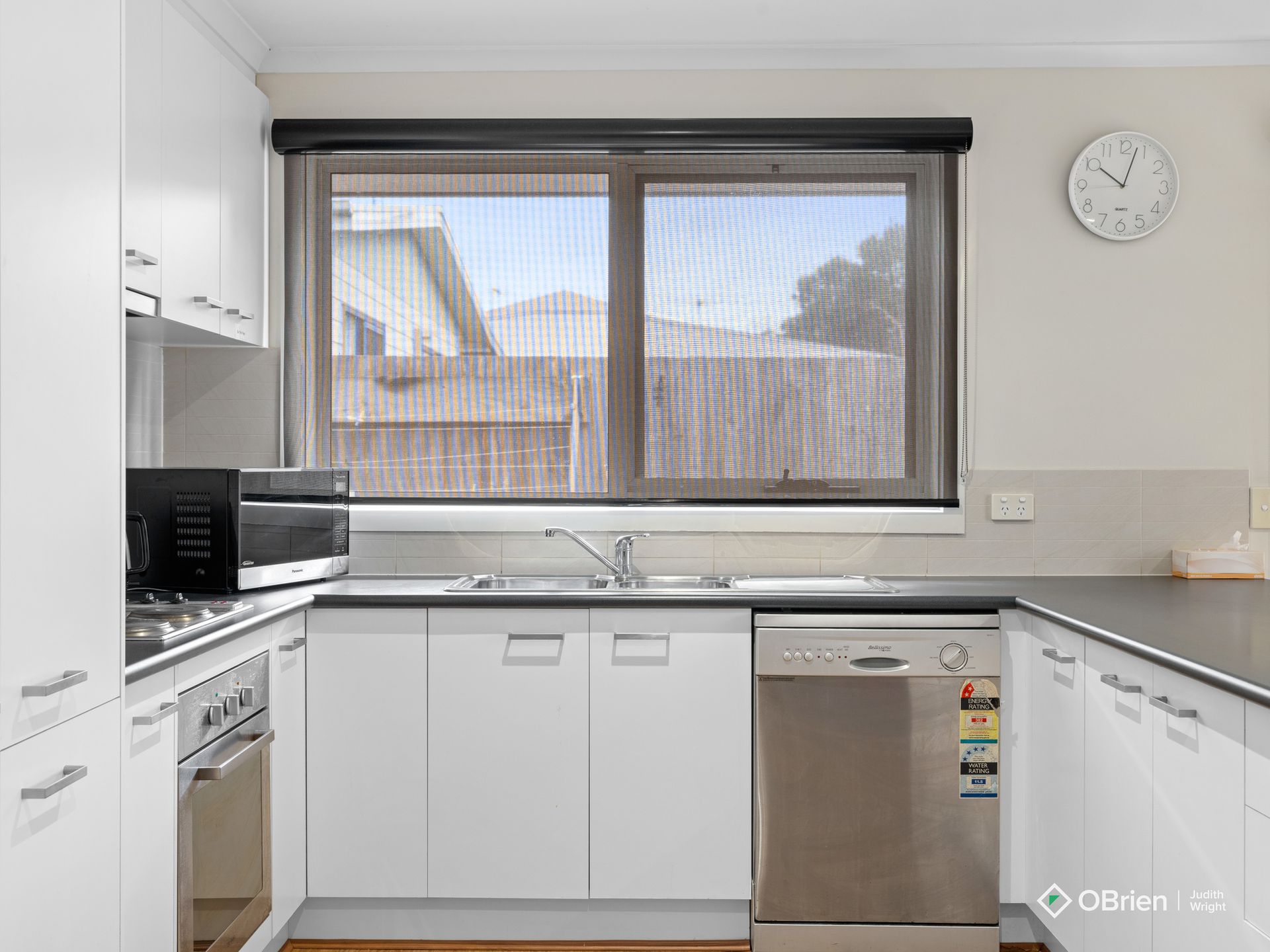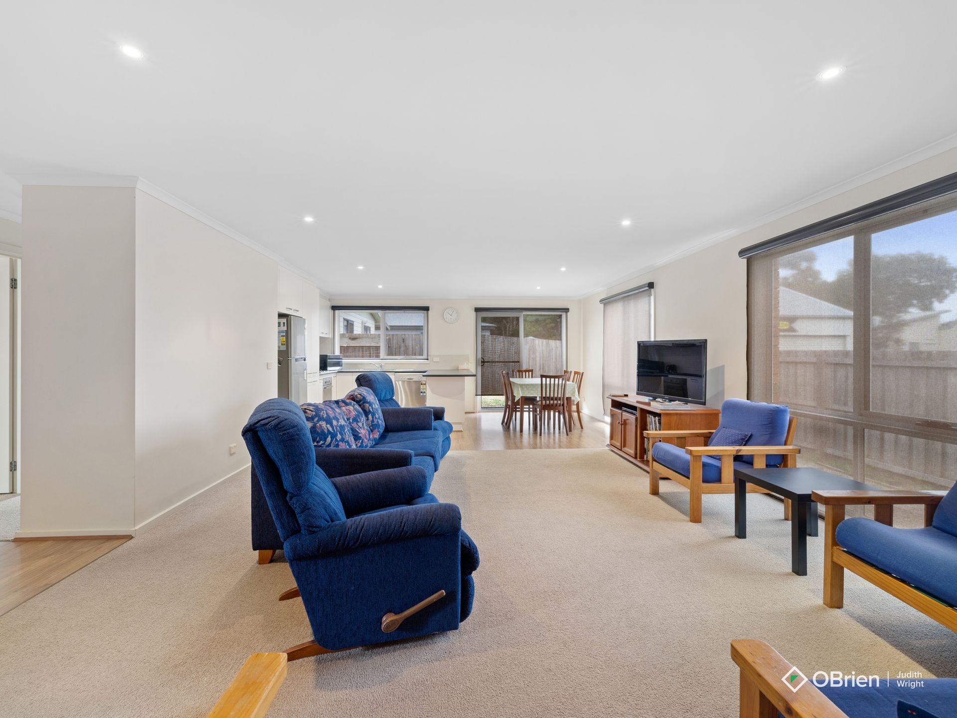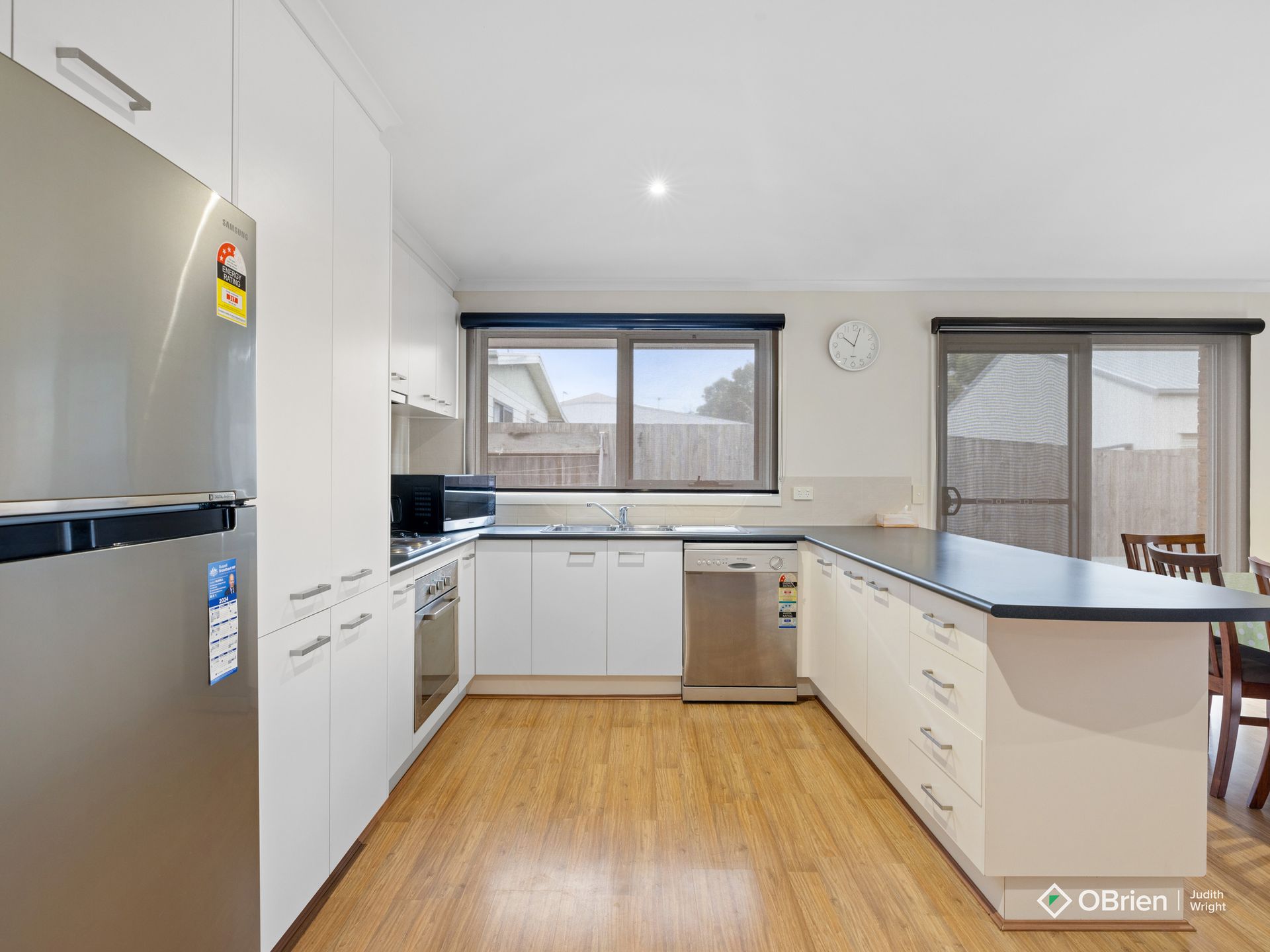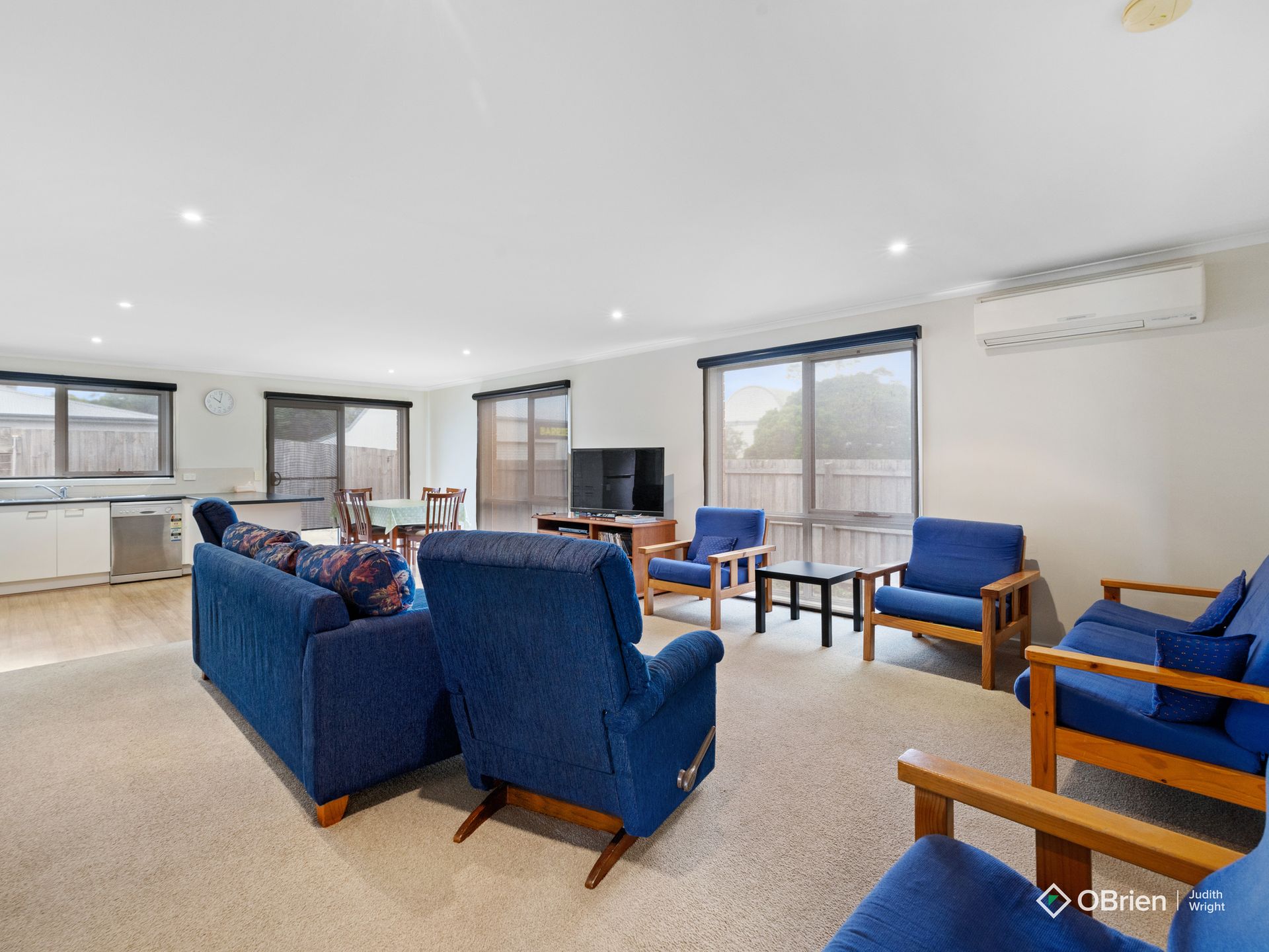 Loads of windows make this holiday unit bright and sunny. The lounge area has flat screen tv and dvd player, comfortable sofas (2 chairs are recliners) and heating is provided by a split system unit. The kitchen is fully self contained with electric cooking, a dishwasher and microwave. The dining table seats 6 and the dining area opens up to the courtyard.