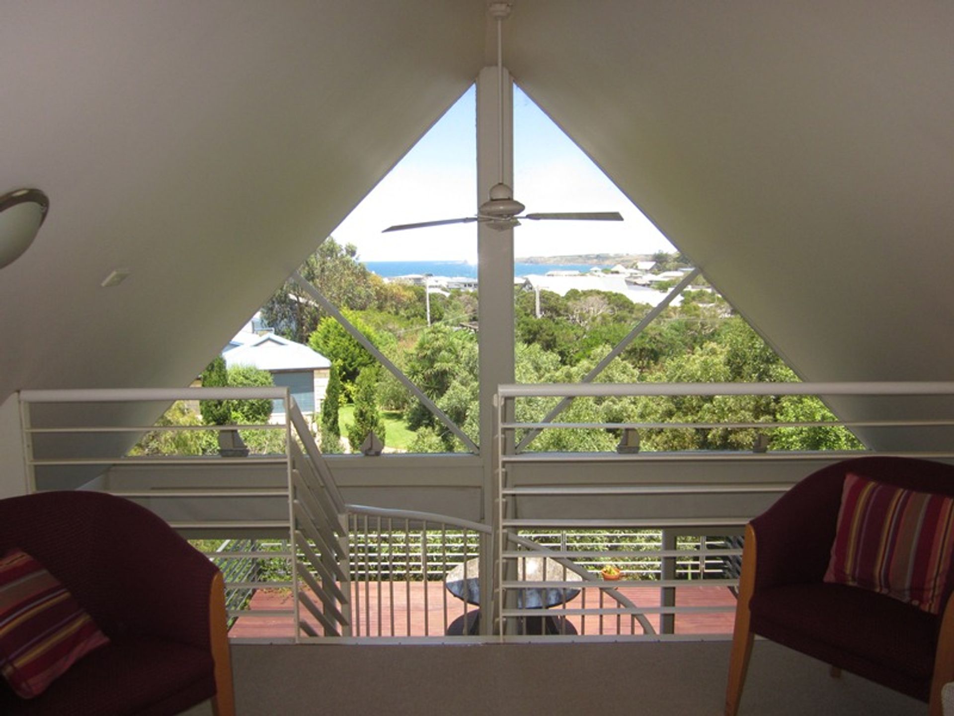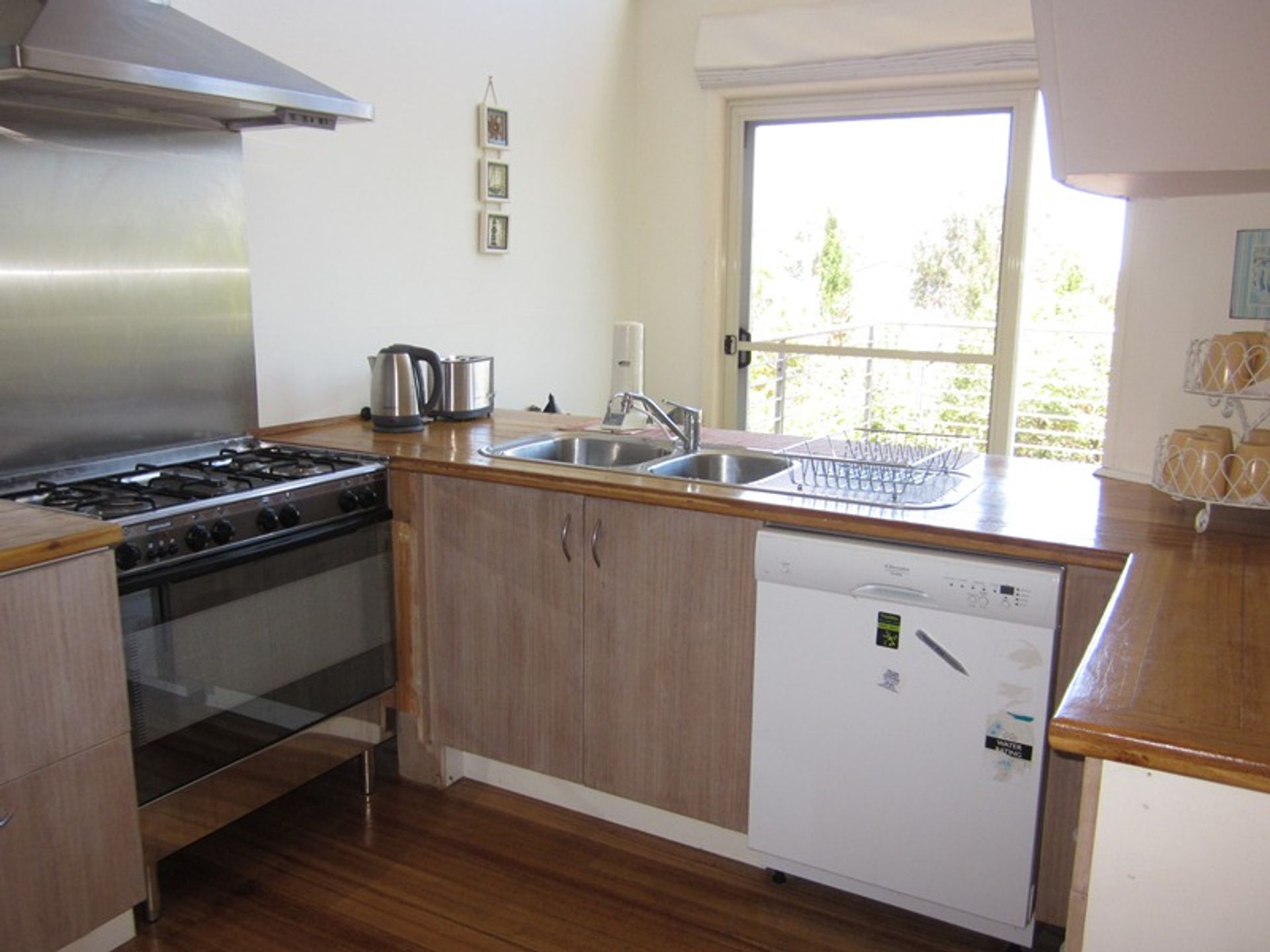 Featuring a stunning living room accessed by stairs from the middle level of the home this area has a flat screen tv and dvd player, comfortable sofas and amazing views. Down the stairs again and there is a lovely dining area and kitchen. The kitchen is modern and well equipped, with a large gas stove, a microwave and dishwasher, with plenty of salad bowls and platters perfect for summer bbqs out on the deck. The main deck is accessed through sliding doors off the kitchen and it has a gas bbq and outdoor setting and a large dining setting with seating for 8.