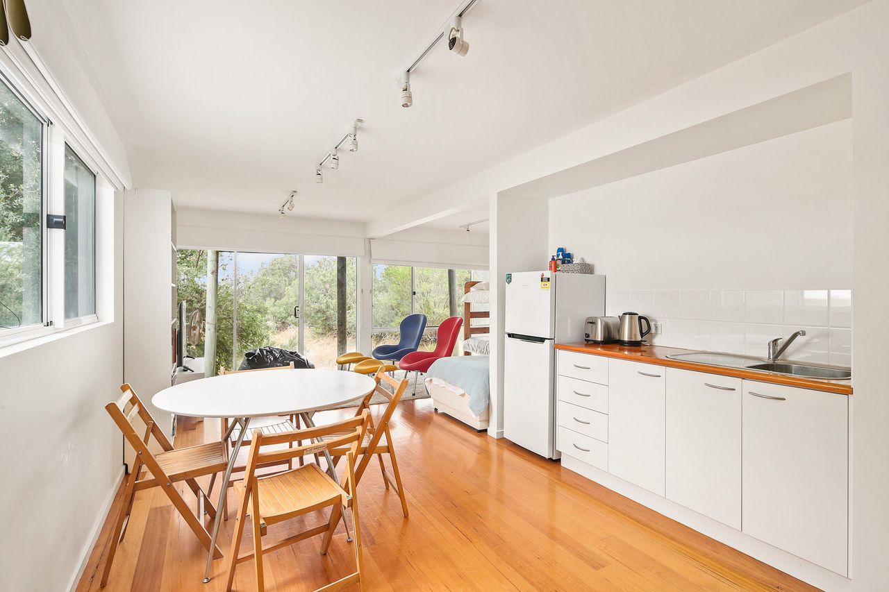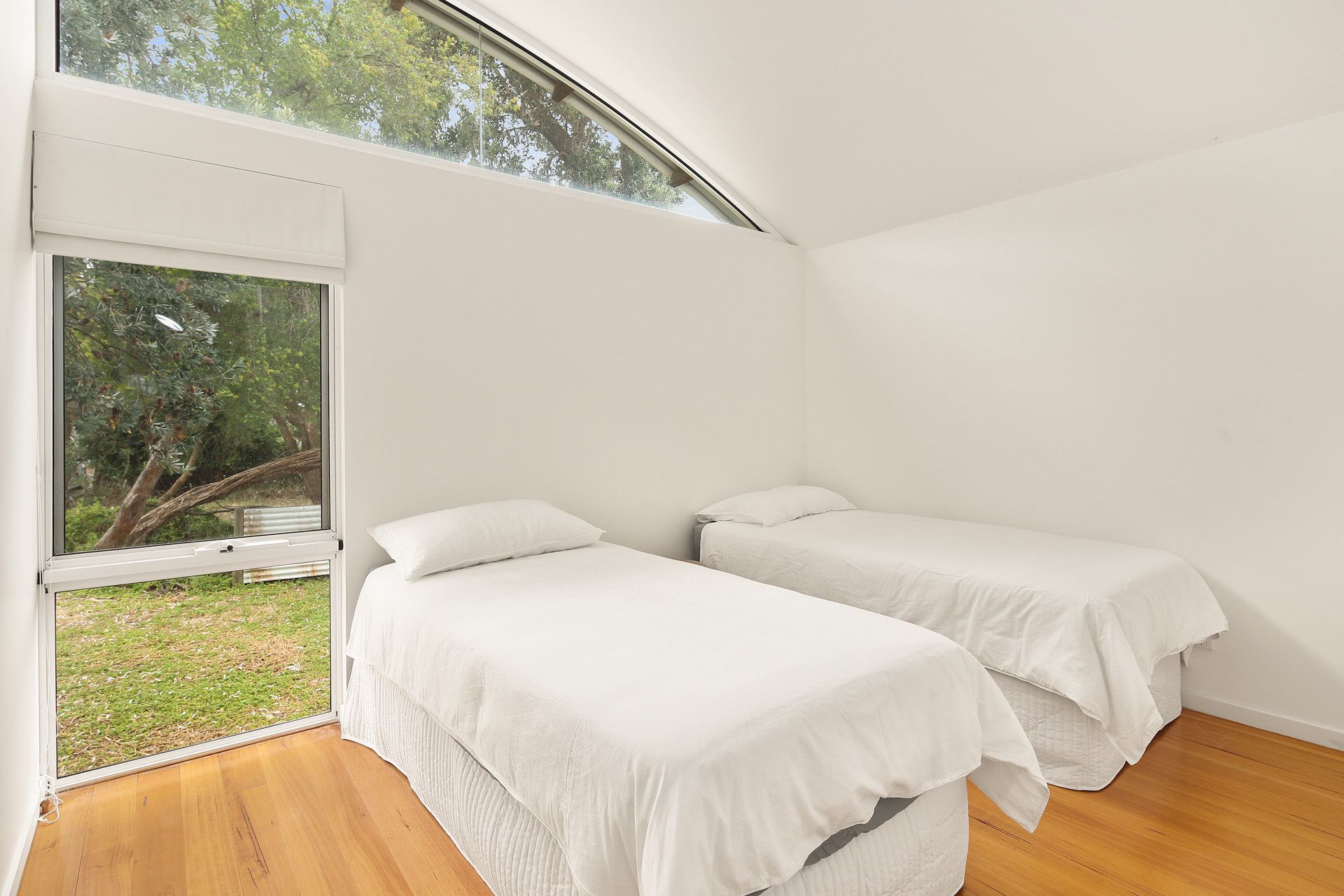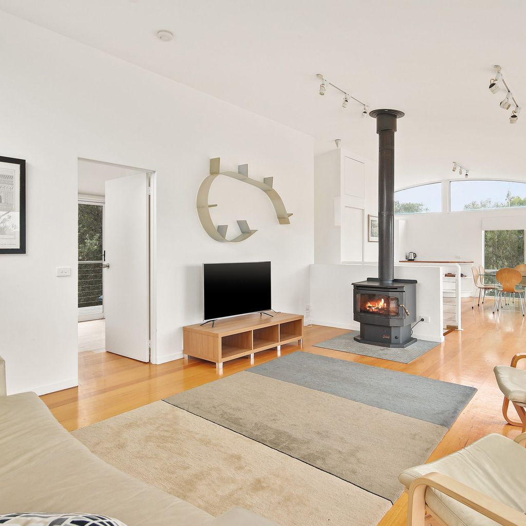 Upstairs find the perfectly appointed kitchen with gas hotplates and electric oven, dishwasher and microwave. The open plan dining and family room open onto a large deck with outdoor seating and Bbq, perfect for enjoying a wine and taking in the beautiful scenery and wildlife. The wall of windows provides a stunning view of the reserve. There is a wood heater to keep you snug during the cooler months.