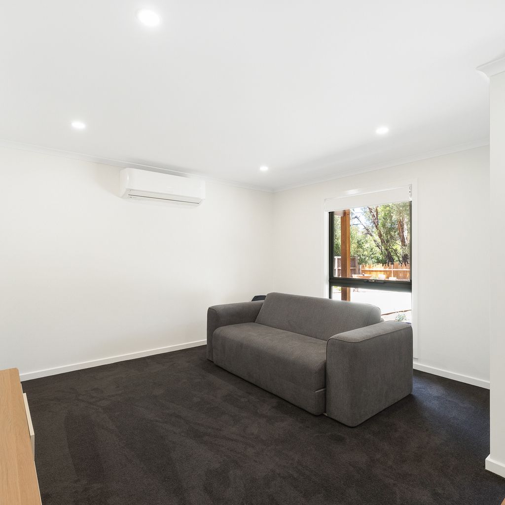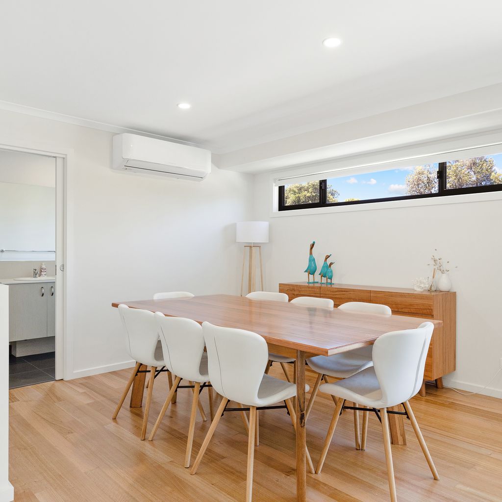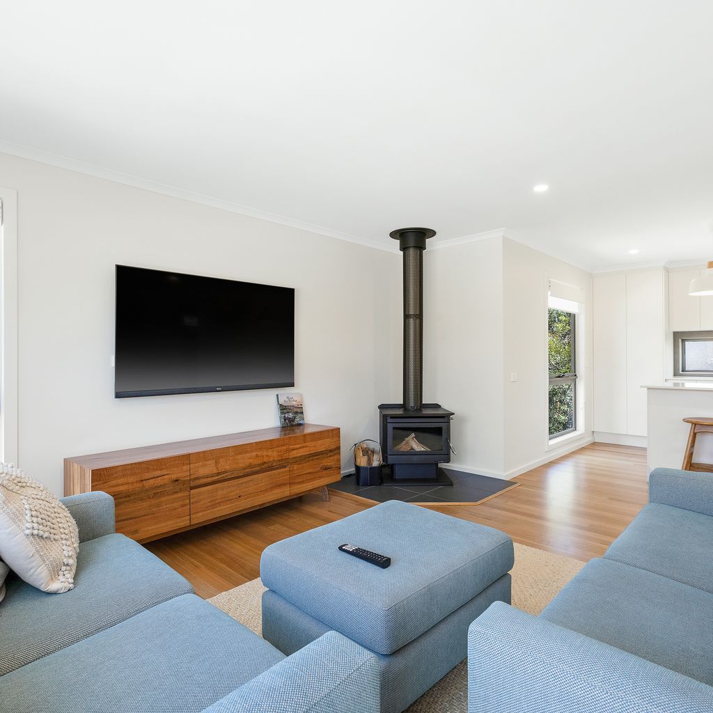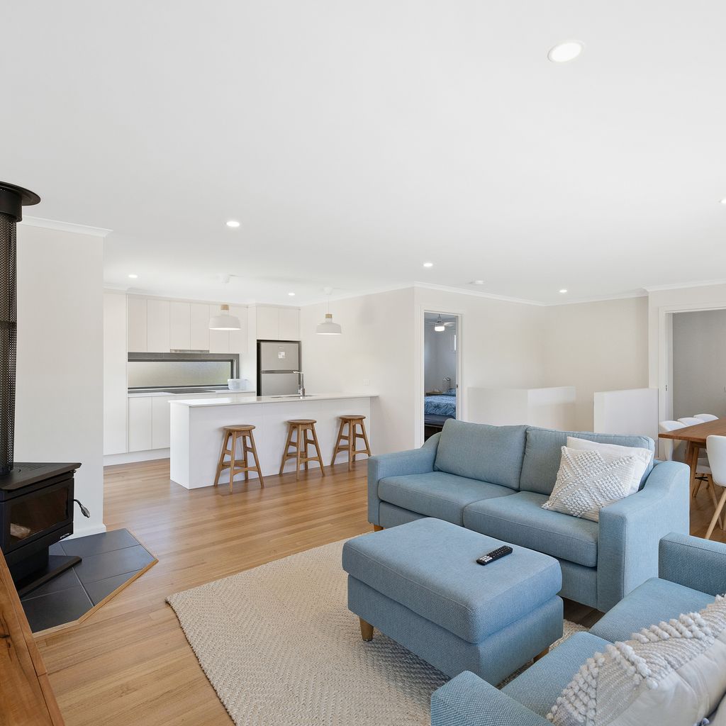 The centerpiece of the living area is a cozy indoor fireplace, perfect for chilly evenings and intimate gatherings. Adjacent to the living area is a stylish open-plan kitchen, complete with sleek appliances, ample storage, and a chic island countertop ideal for culinary endeavors. The kitchen seamlessly flows into the dining area, creating a harmonious space for entertaining guests and creating lasting memories. The living area then leads out directly to a balcony, providing a peaceful retreat to enjoy your morning coffee or unwind in the evening and enjoy a BBQ. Completing the upstairs amenities is an additional split system and a spacious elegantly appointed bathroom.