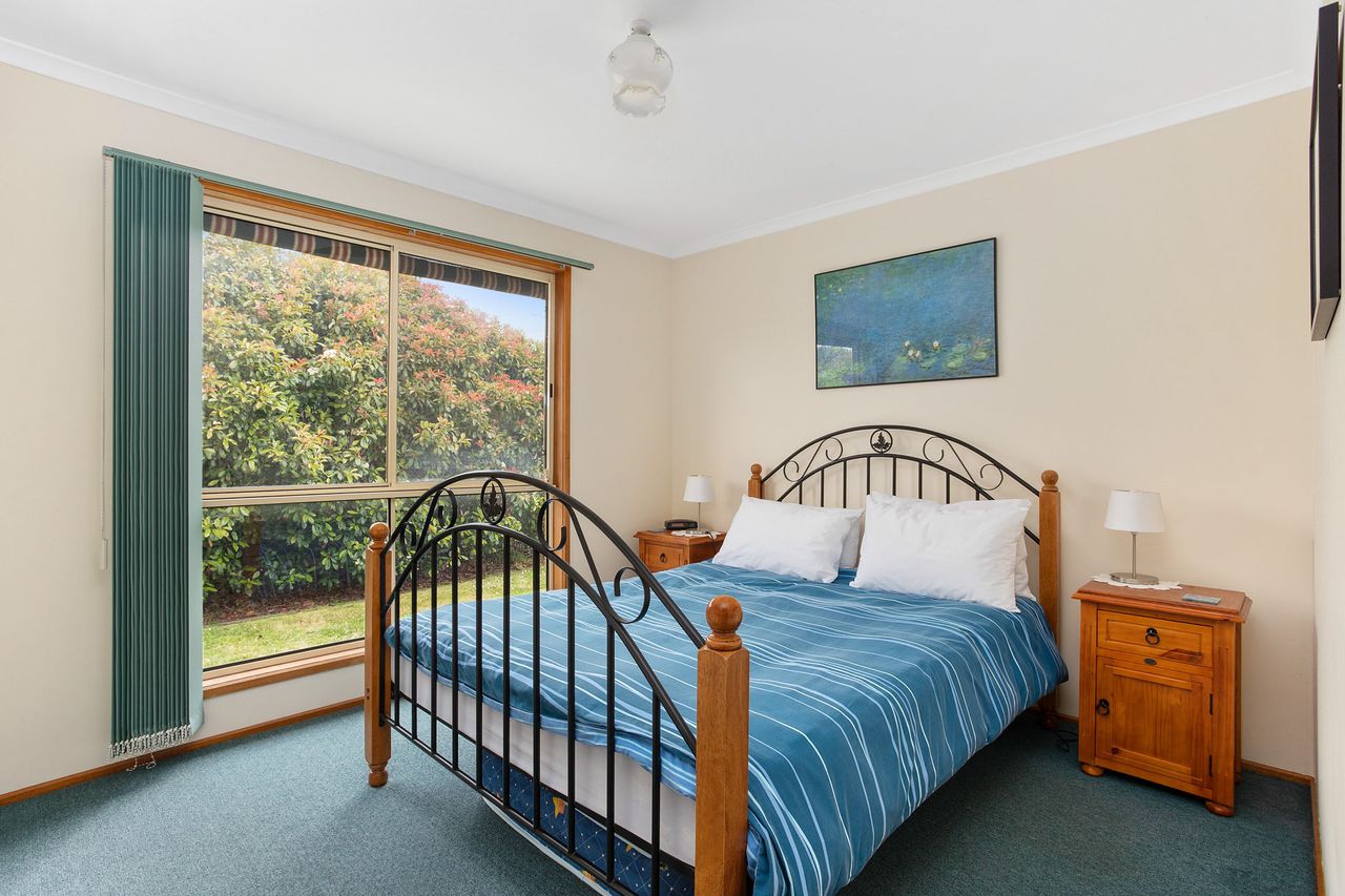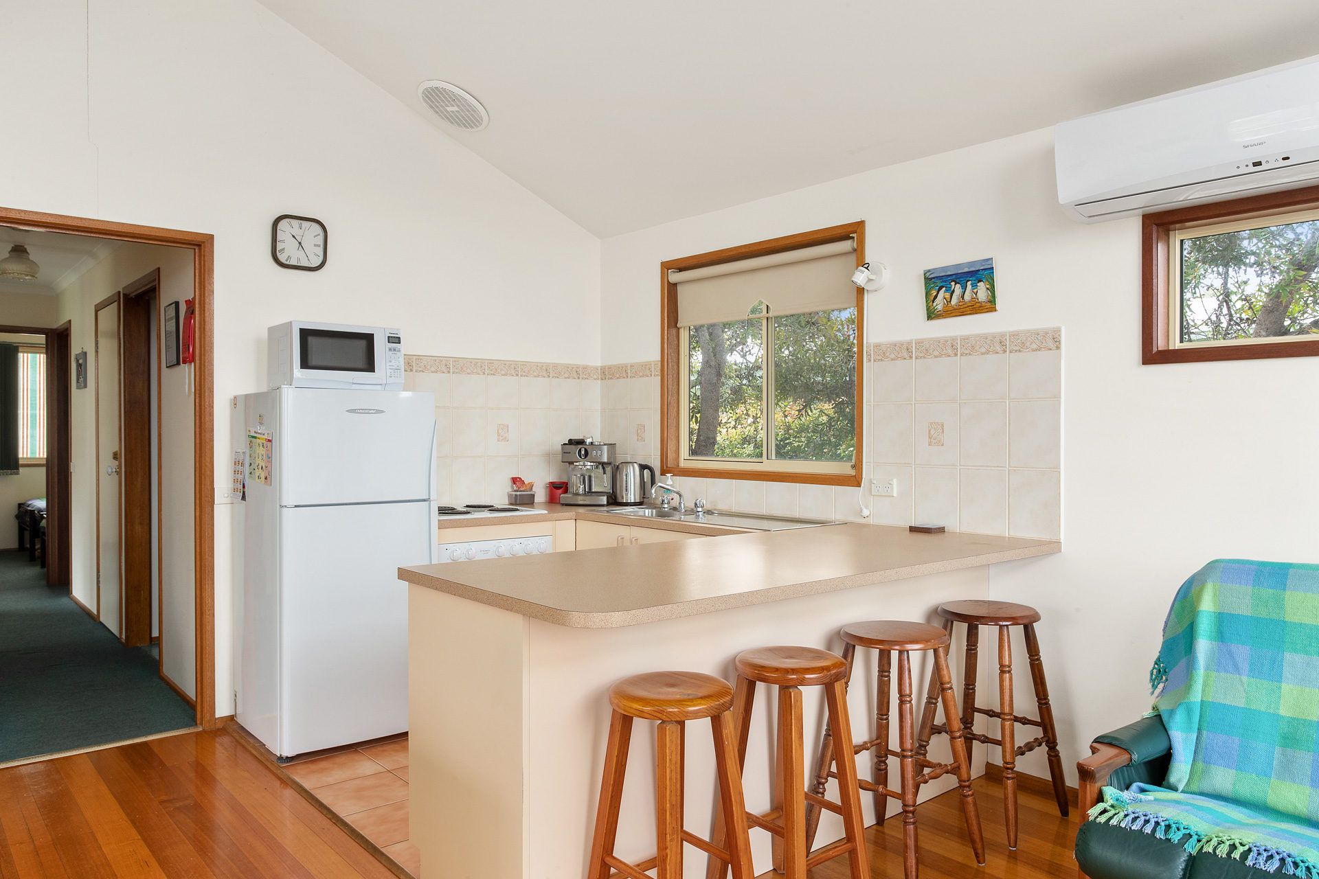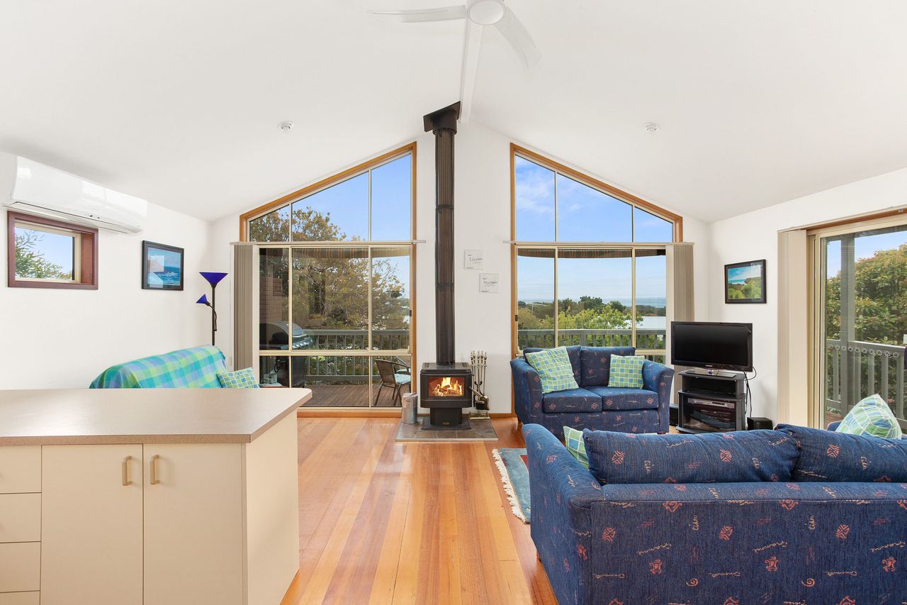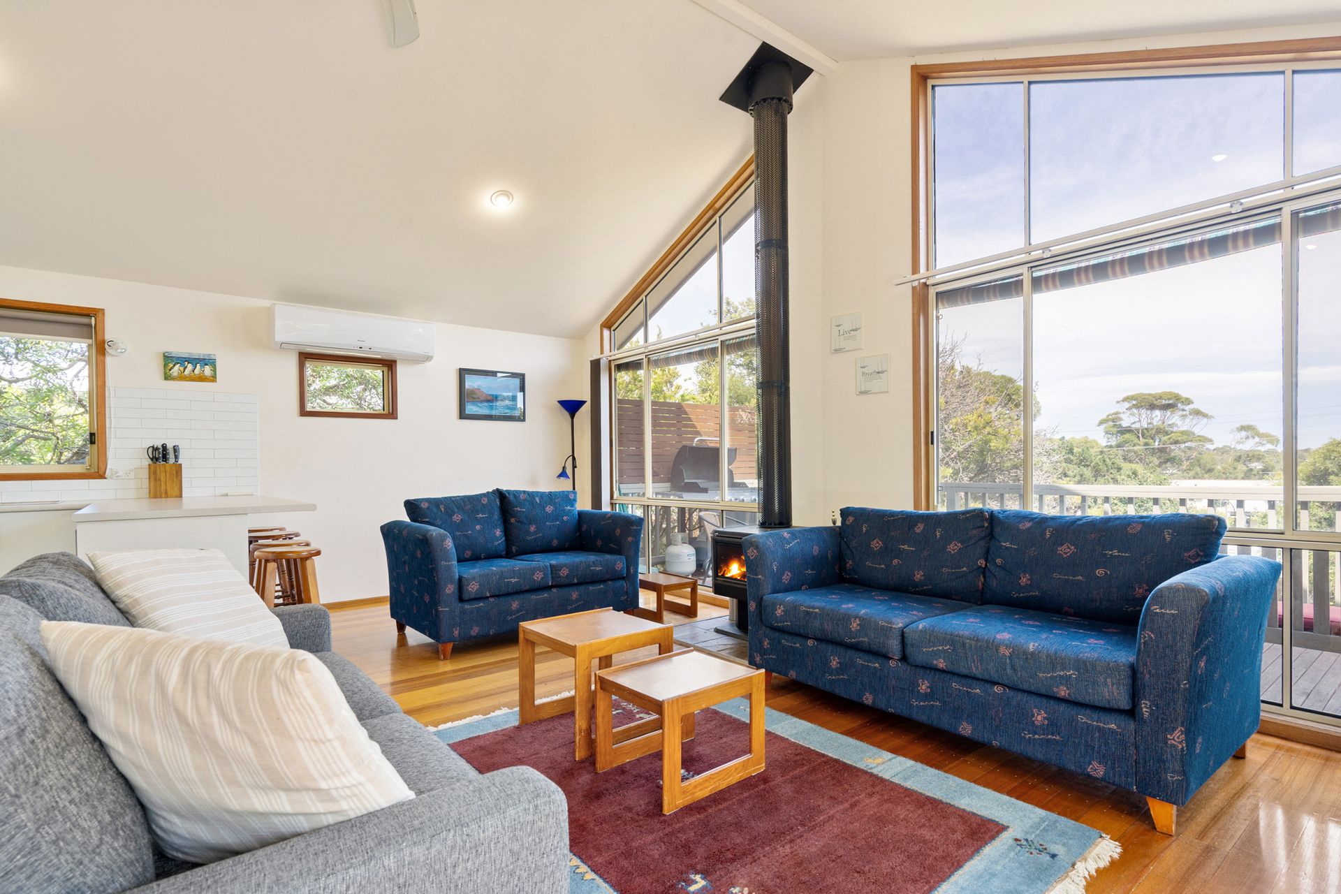 The sunny open-plan living, dining, and kitchen area features polished timber floors, a wood fire, split-system heating/cooling, flat-screen TV, and DVD player. The self-contained kitchen includes electric cooking, microwave, and plenty of platters for alfresco BBQs.