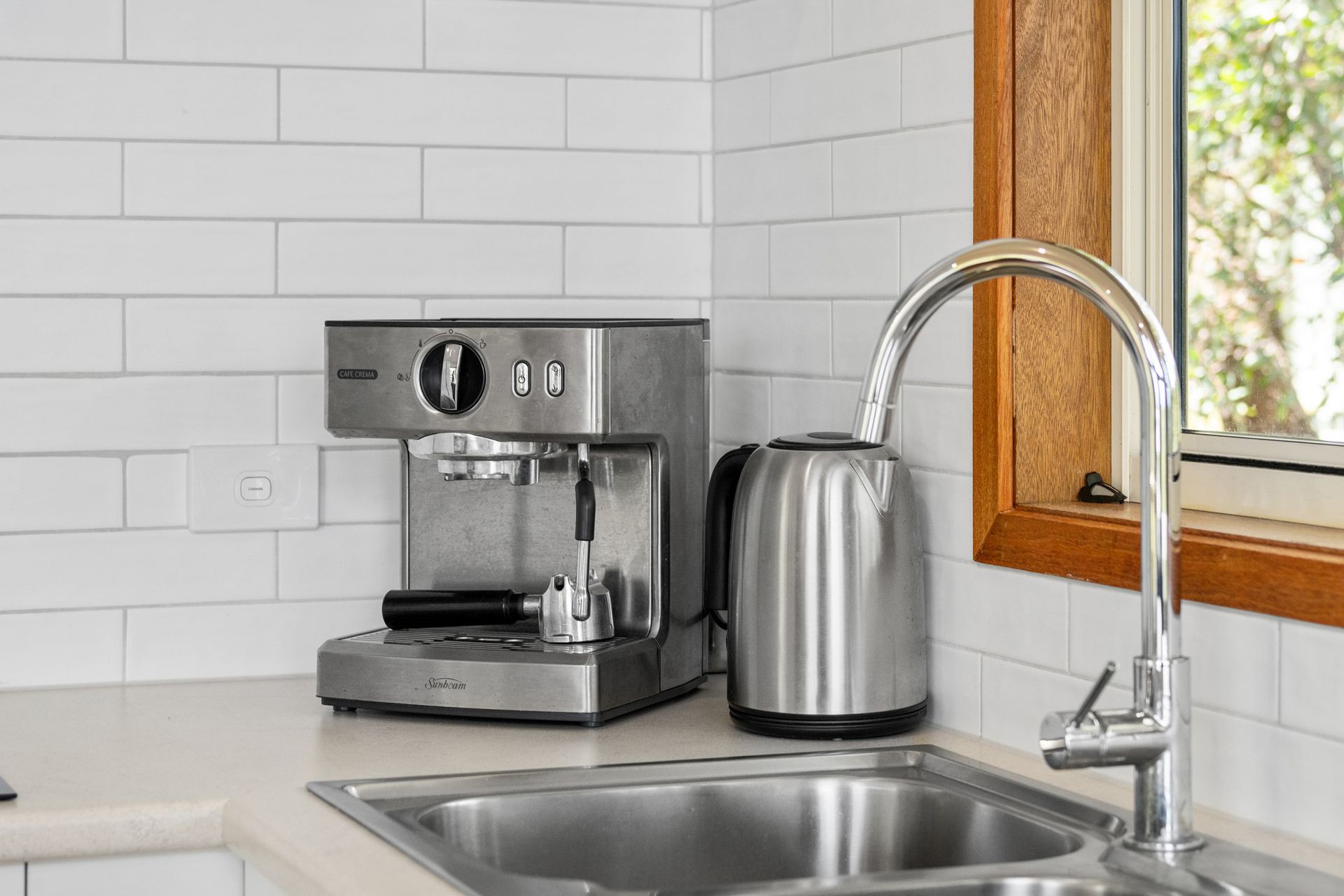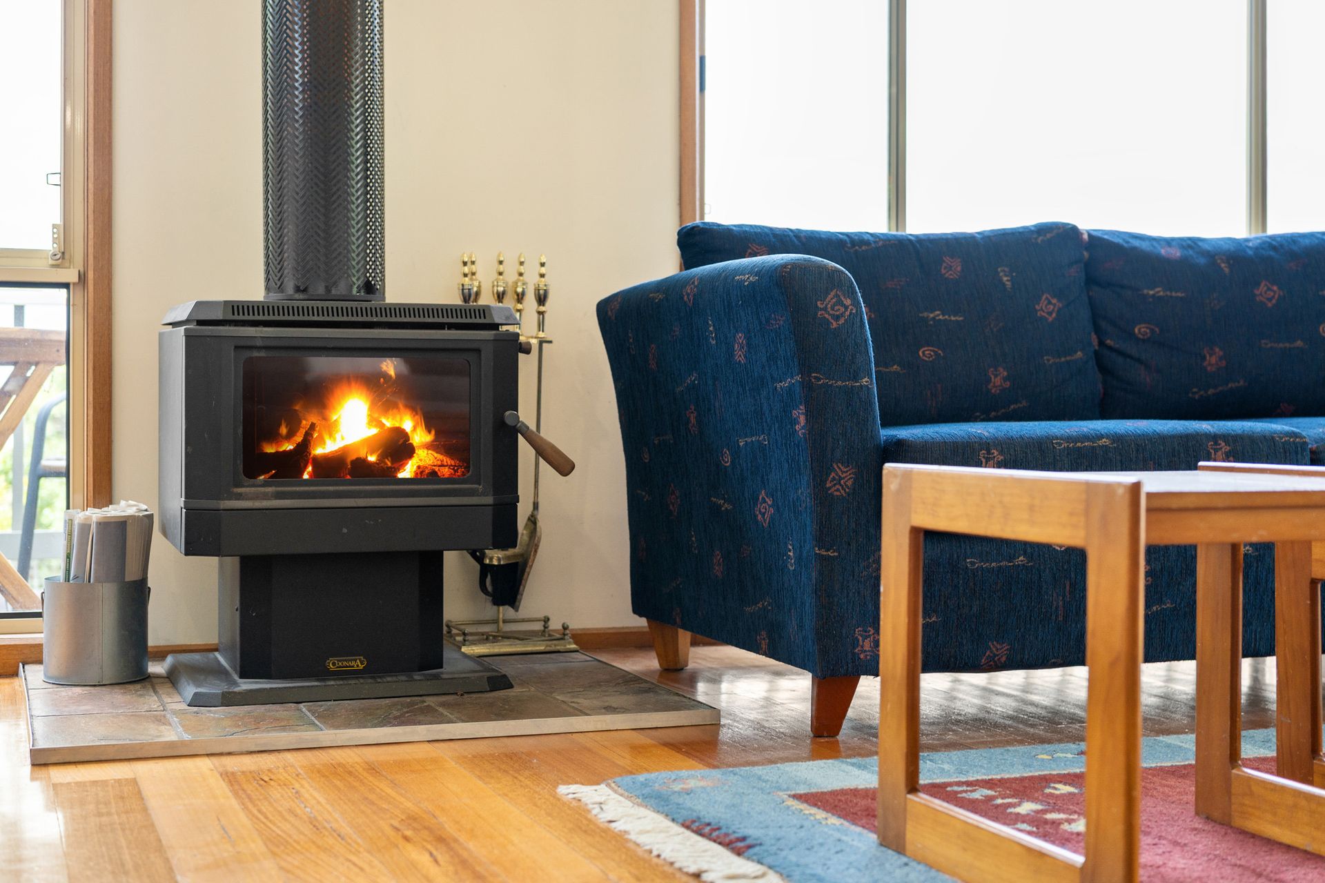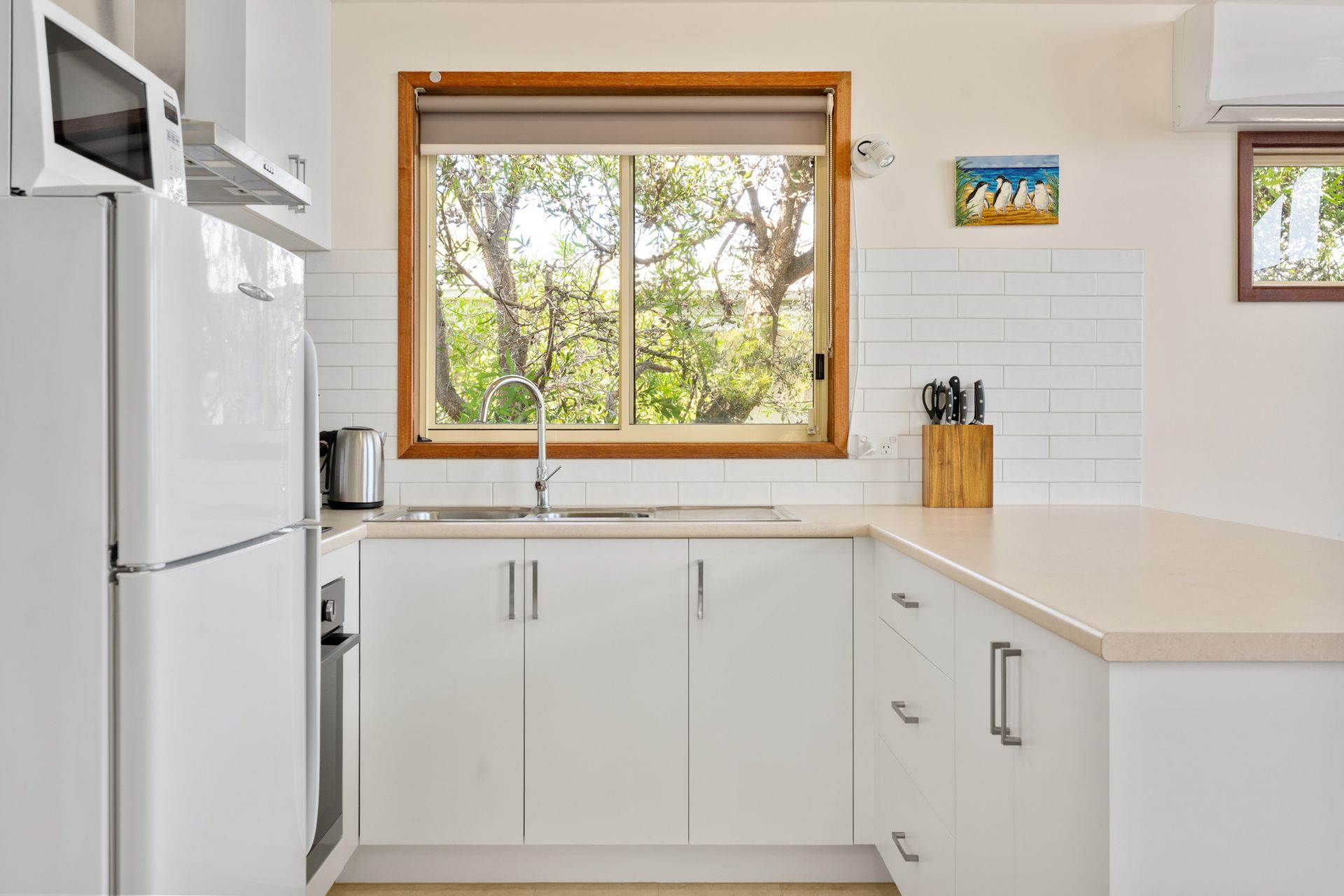 The sunny open-plan living, dining, and kitchen area features polished timber floors, a wood fire, split-system heating/cooling, flat-screen TV, and DVD player. The self-contained kitchen includes electric cooking, microwave, and plenty of platters for alfresco BBQs.