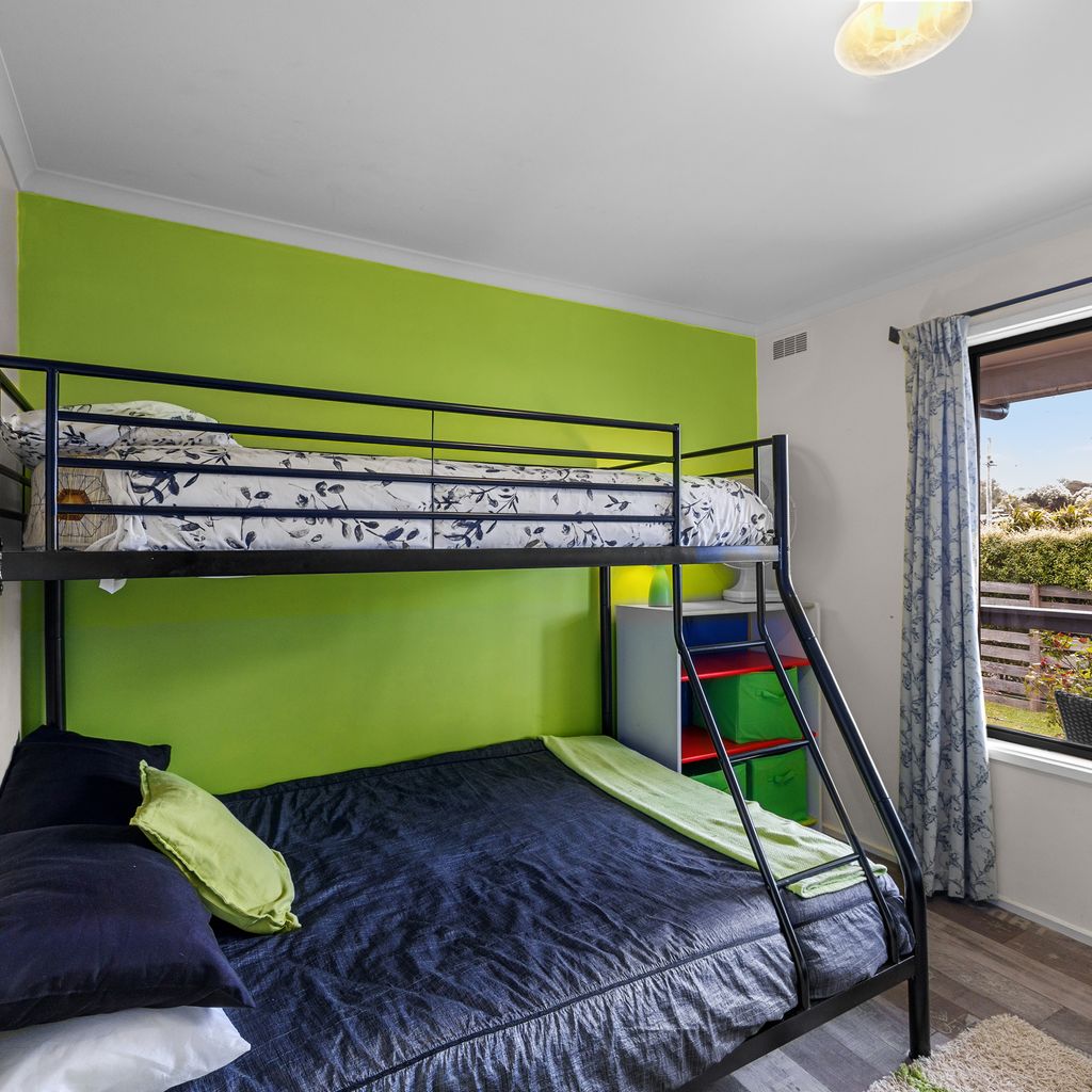 There are three bedrooms to accommodate your group: the main bedroom includes a queen bed along with built-in robes and an ensuite, the second bedroom features a double bed and the third bedroom offers two sets of single bunks—ideal for kids or additional guests.