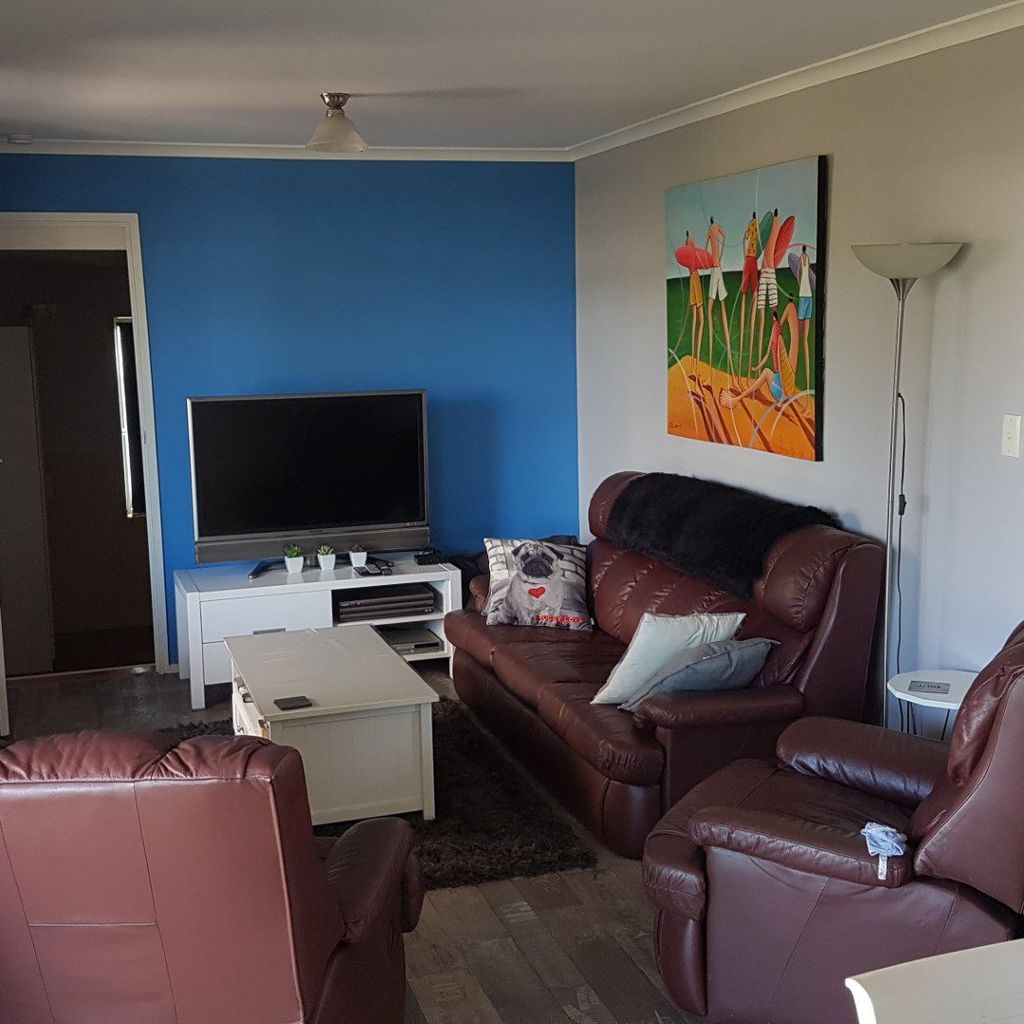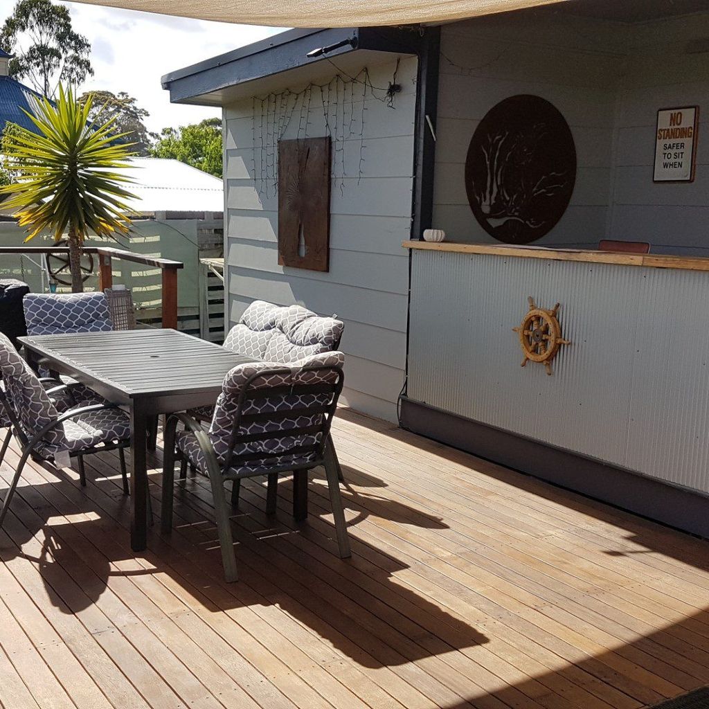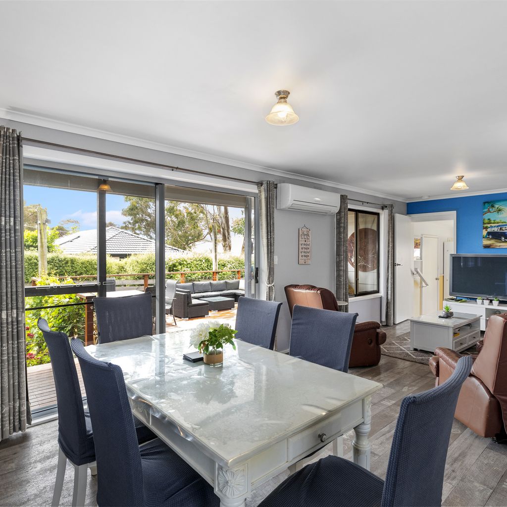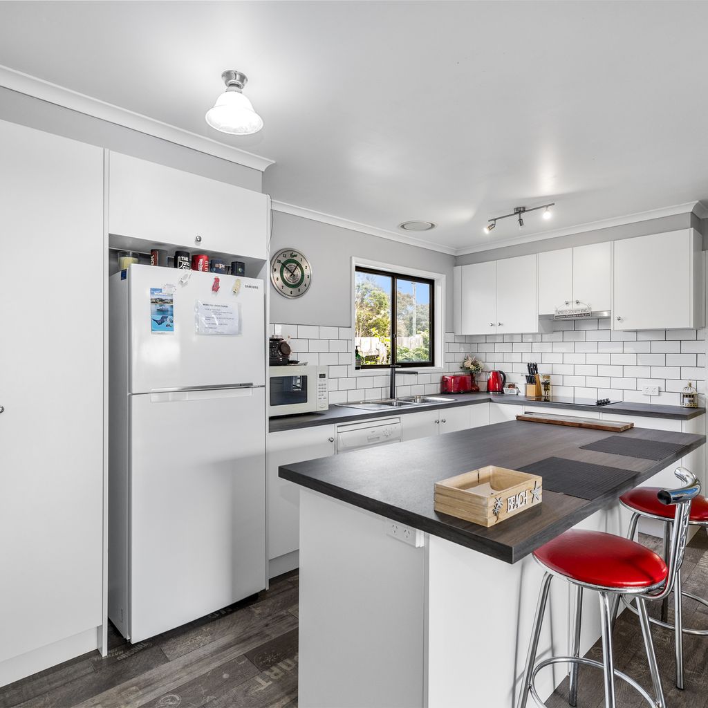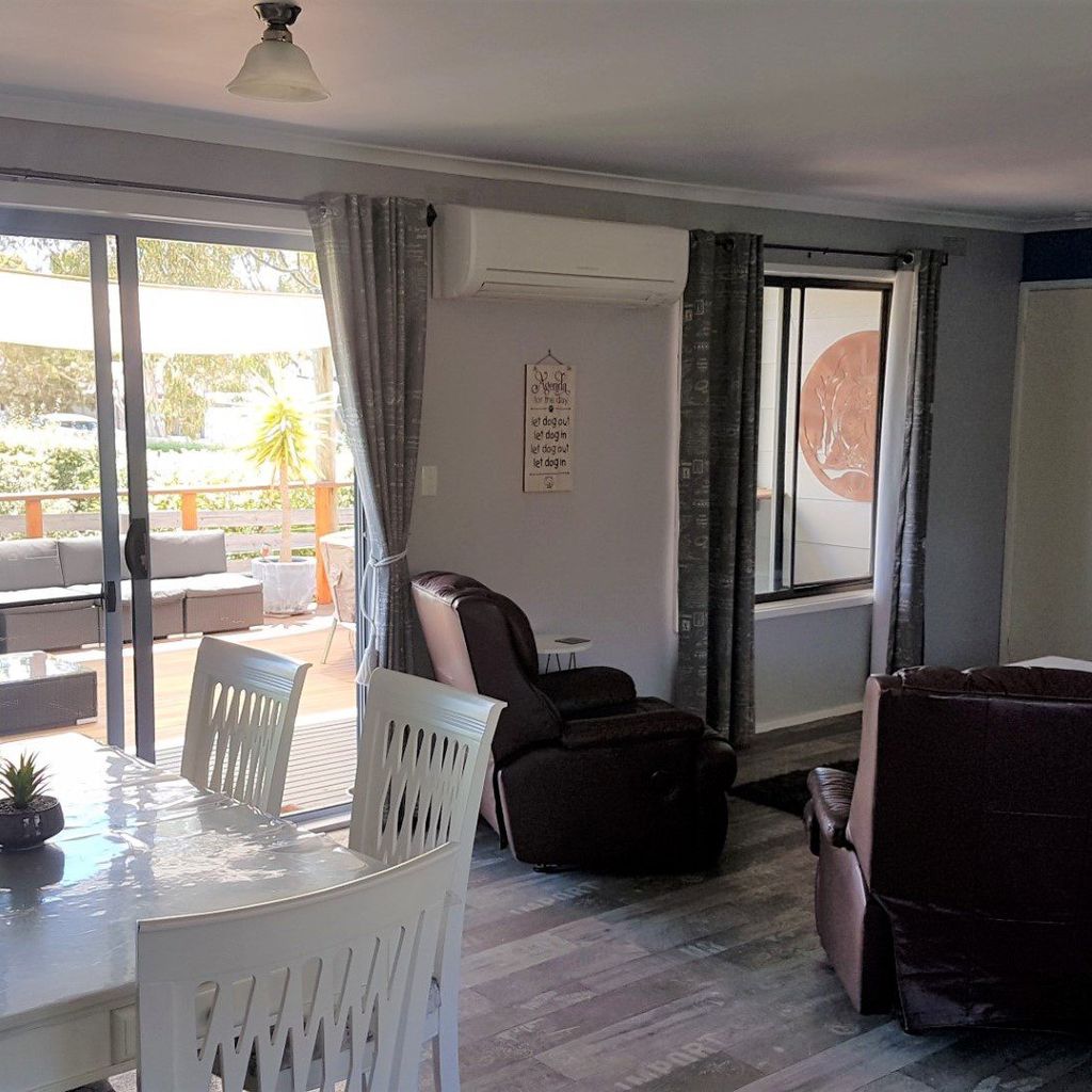 The house features an open plan kitchen and lounge with outdoor living options at the forefront. Step outside to enjoy the expansive deck, which is truly a highlight of this property. Accessible directly from the lounge, the deck comes with a gas BBQ and plenty of seating options to suit every mood. Whether you’re sipping your morning coffee, enjoying breakfast around the table or unwinding with afternoon drinks at the bar, you’ll love this peaceful outdoor space. The kitchen is well equipped with an electric oven and stovetop, a dishwasher and a microwave. The living area is comfortably furnished with a TV and DVD player, a split system for heating and cooling and a dining table that seats six—perfect for family meals or group gatherings.