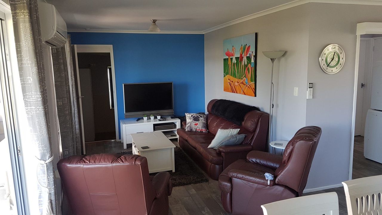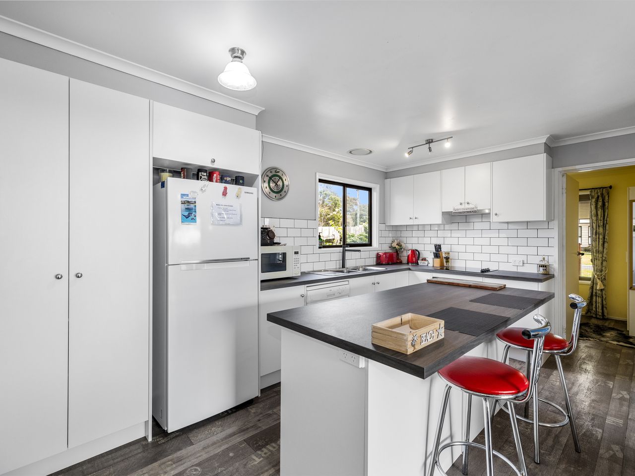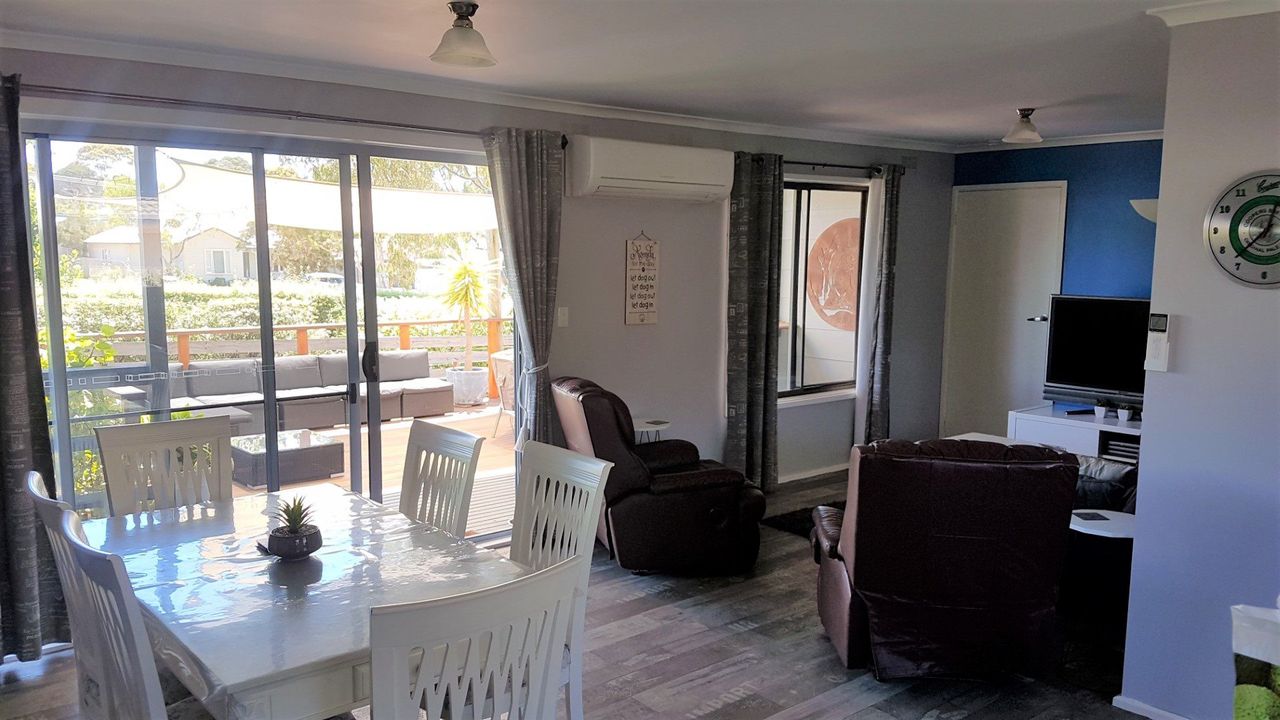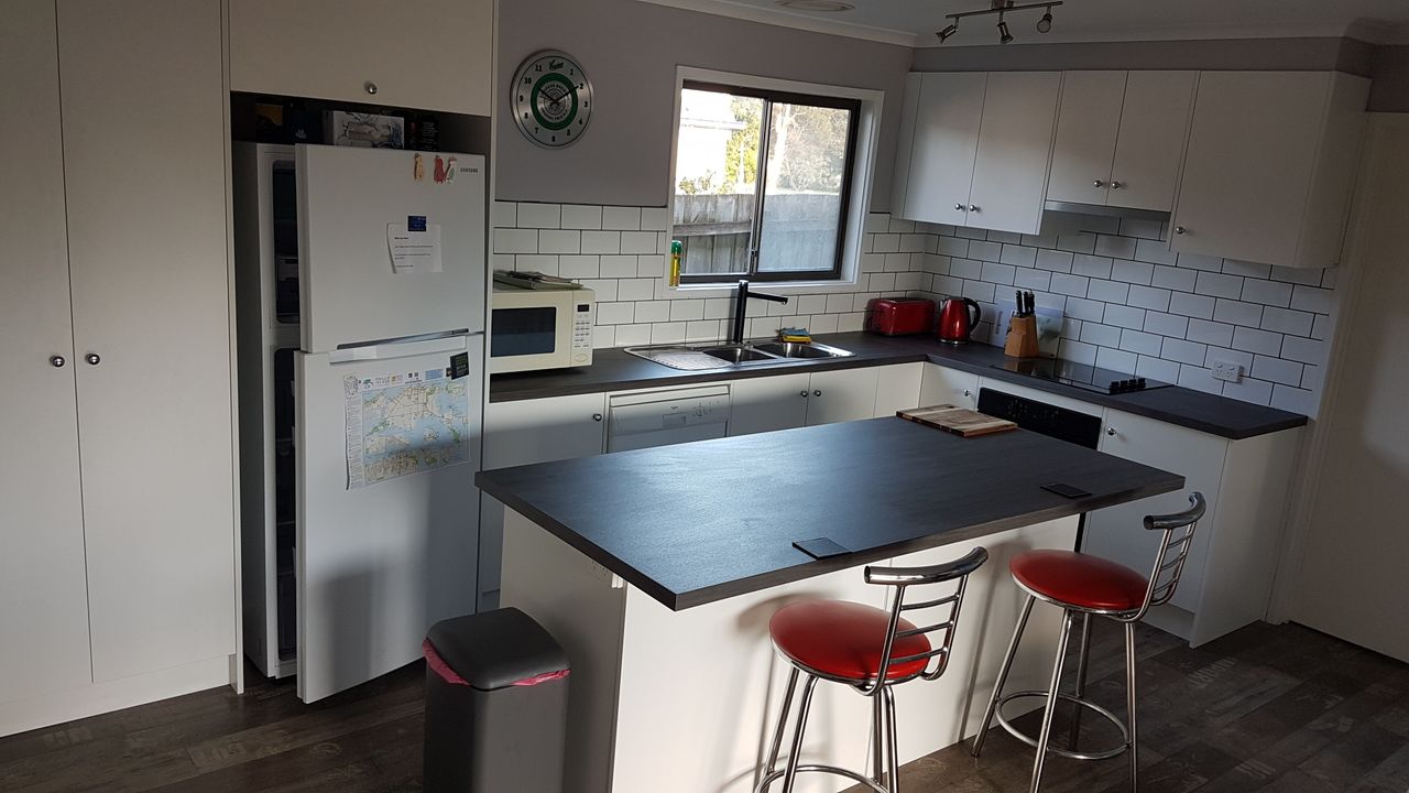 The house features an open plan kitchen and lounge with outdoor living options at the forefront. Step outside to enjoy the expansive deck, which is truly a highlight of this property. Accessible directly from the lounge, the deck comes with a gas BBQ and plenty of seating options to suit every mood. Whether you’re sipping your morning coffee, enjoying breakfast around the table or unwinding with afternoon drinks at the bar, you’ll love this peaceful outdoor space. The kitchen is well equipped with an electric oven and stovetop, a dishwasher and a microwave. The living area is comfortably furnished with a TV and DVD player, a split system for heating and cooling and a dining table that seats six—perfect for family meals or group gatherings.