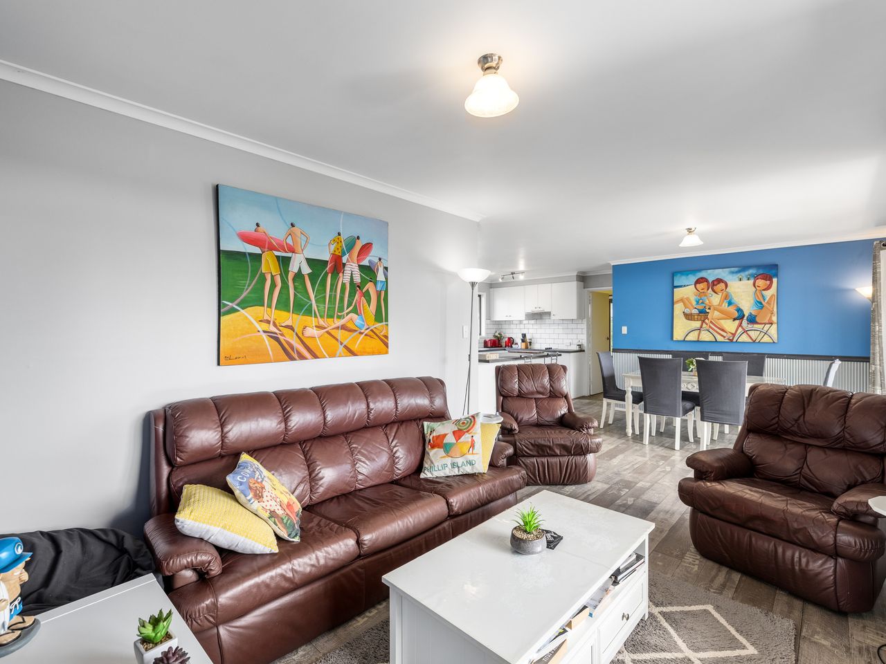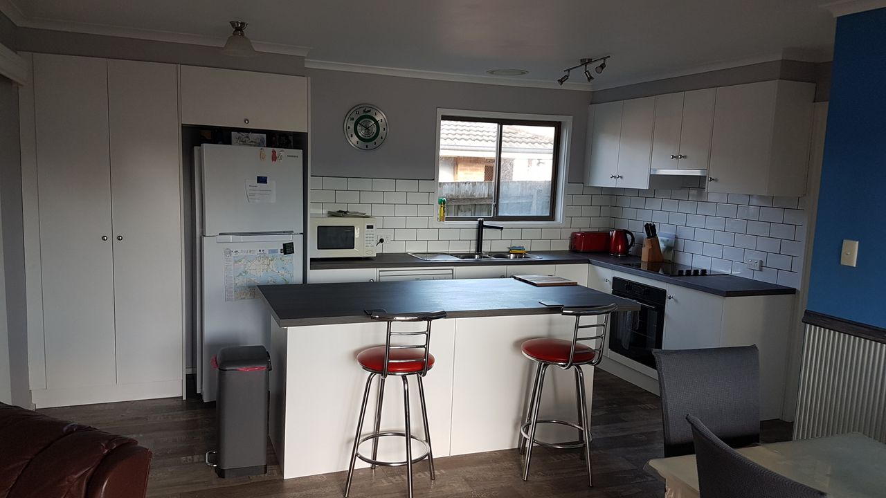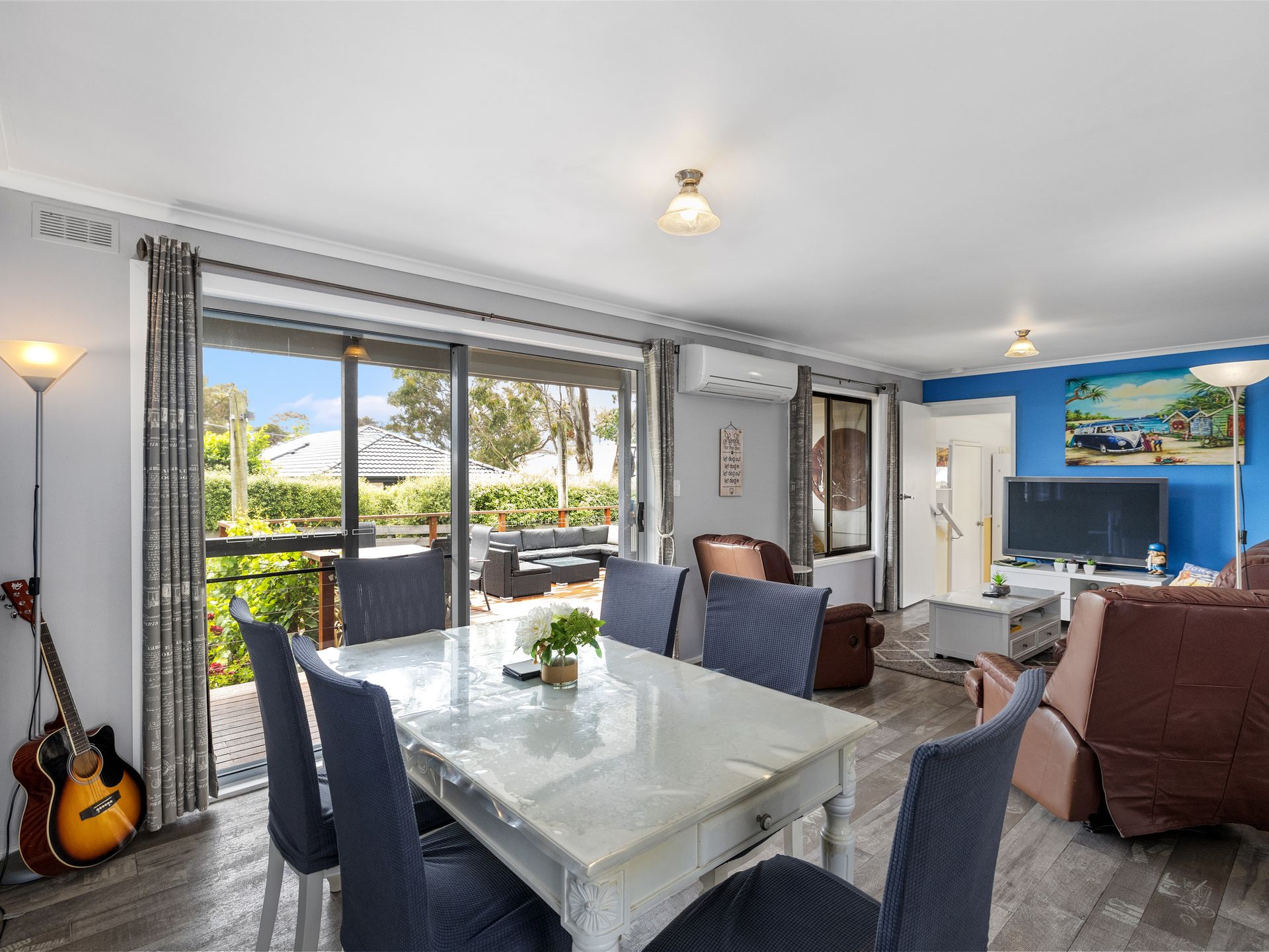 The house features an open plan kitchen and lounge with outdoor living options at the forefront. Step outside to enjoy the expansive deck, which is truly a highlight of this property. Accessible directly from the lounge, the deck comes with a gas BBQ and plenty of seating options to suit every mood. Whether you’re sipping your morning coffee, enjoying breakfast around the table or unwinding with afternoon drinks at the bar, you’ll love this peaceful outdoor space. The kitchen is well equipped with an electric oven and stovetop, a dishwasher and a microwave. The living area is comfortably furnished with a TV and DVD player, a split system for heating and cooling and a dining table that seats six—perfect for family meals or group gatherings.