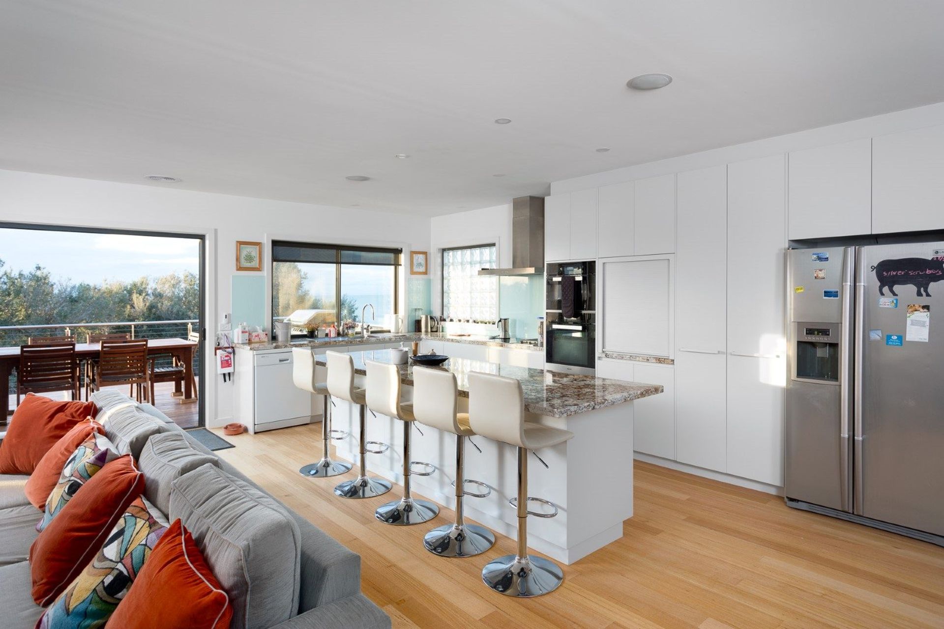 There are 2 living areas, both are upstairs, one has TV, DVD player, pool table, beautiful polished floor boards, seating for 8 in this area. The other living area, also upstairs, is the lounge/dining area. Complete with gas fire, TV, DVD, dining table for 10 guests, 5 seats at the breakfast bar, a well equipped modern kitchen with dishwasher, fridge with ice and filtered water too, a pull out pantry and draws, again with polished floor boards. Extend the living area by opening the glass door out to the deck and take in the ocean views. 2 coffee machines, one is a Berilletti (espresso) and the other is Nespresso, covers all your coffee preferences. Upstairs has evaporated heating and cooling.