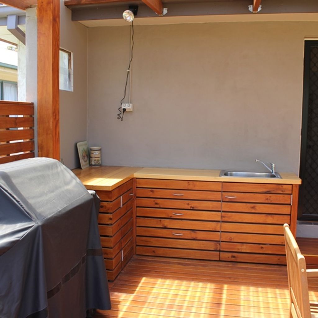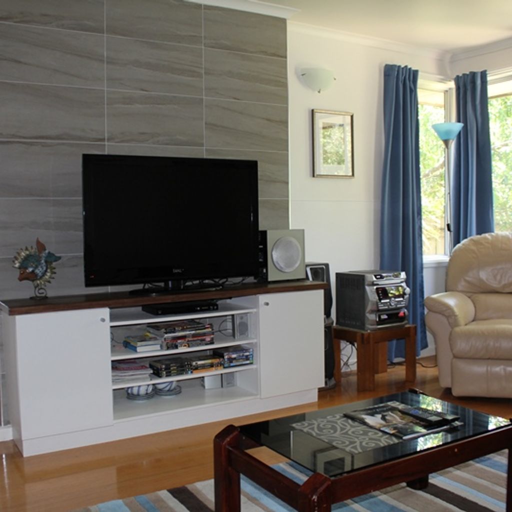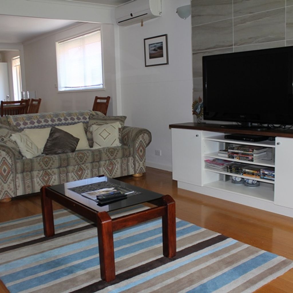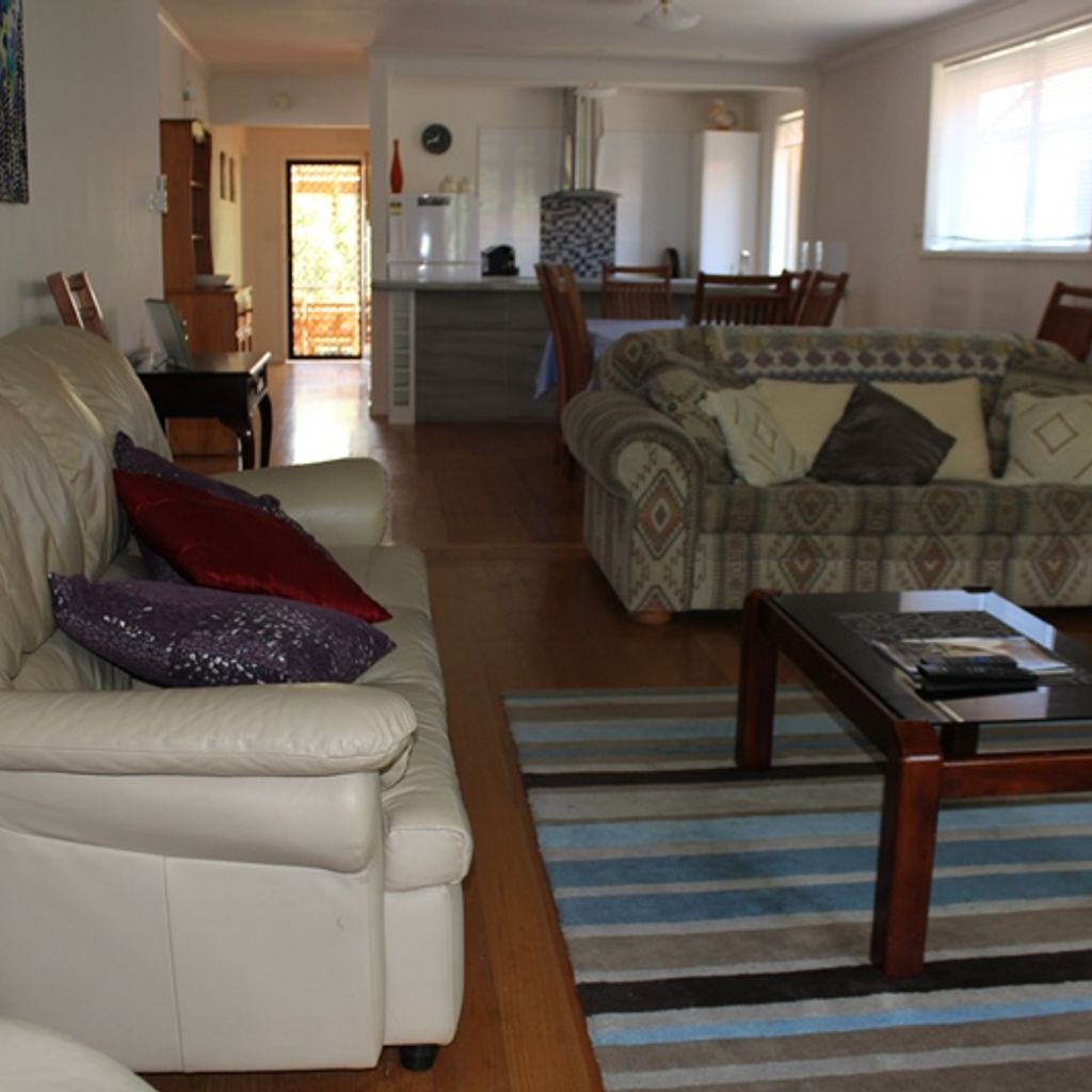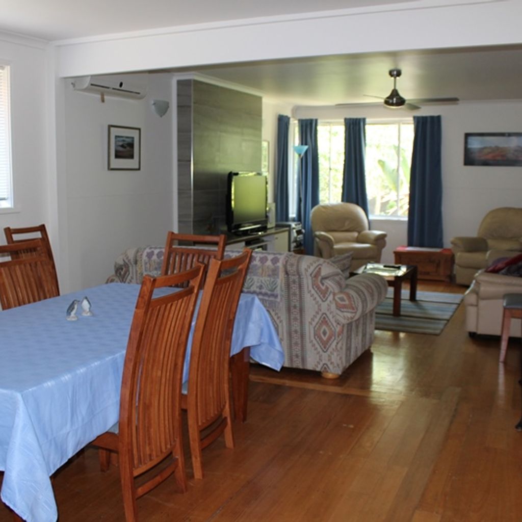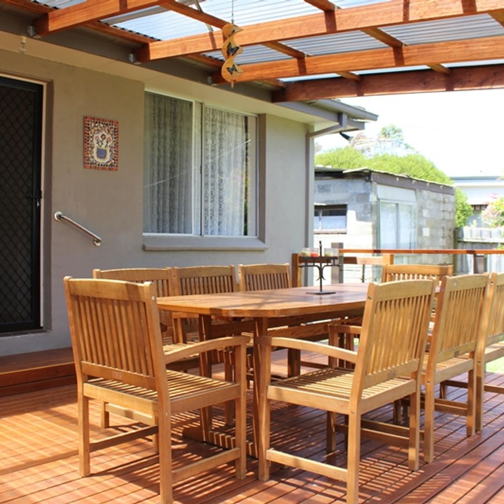 Inside the lounge, dining and kitchen are open plan with a large flat screen tv and dvd player, comfortable sofas and stereo. There is a split system heating and cooling unit and polished timber floors. There is a central dining table and the kitchen is modern and well equipped. The kitchen has electric cooking, a microwave and dishwasher. The fridge is a good size and there are lots of platters and salad bowls perfect for alfresco dining. The deck is at the rear of the house with a large outdoor setting, a gas bbq, outdoor sink and crockery and cutlery - the perfect spot for summer bbqs.