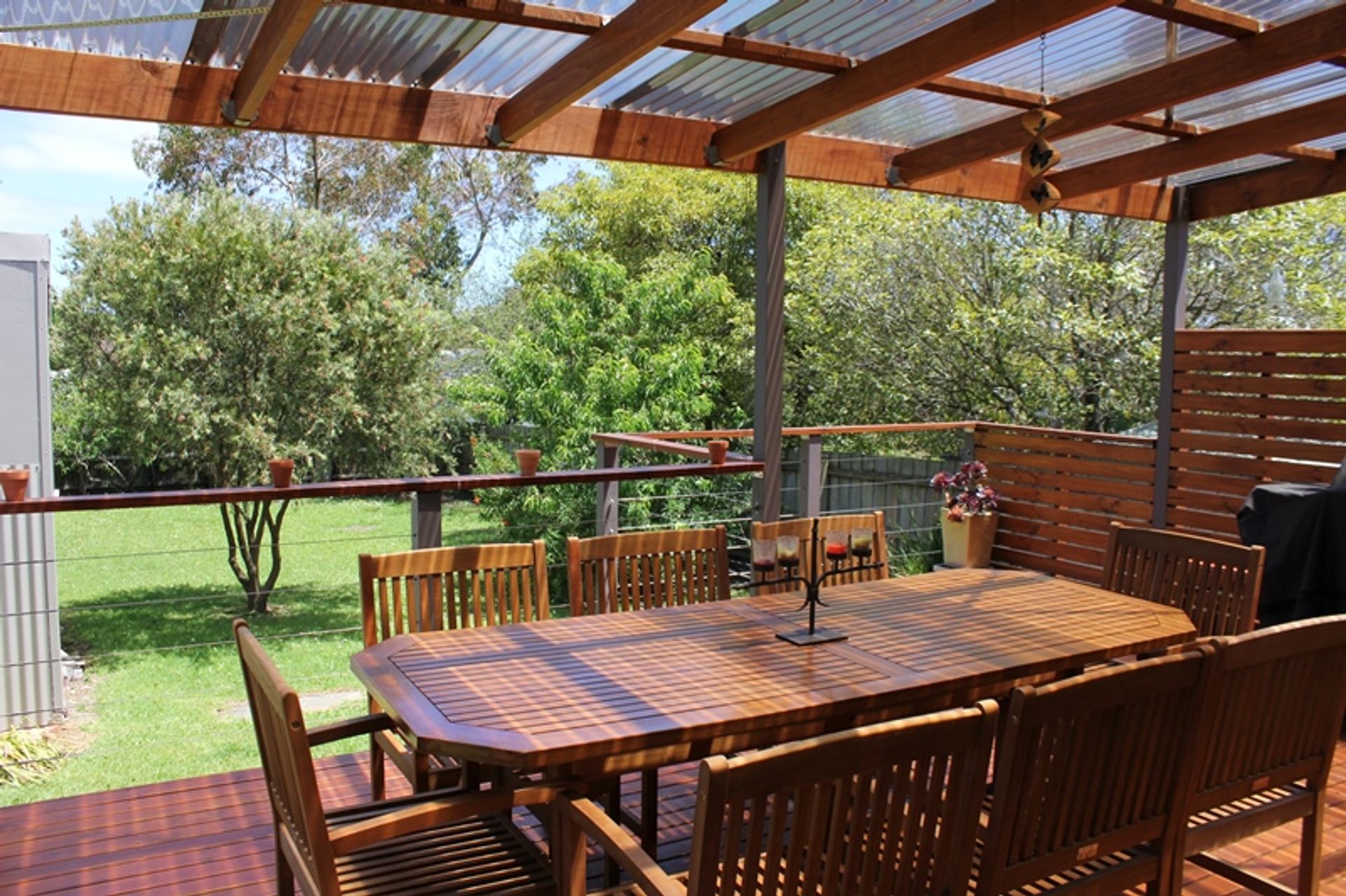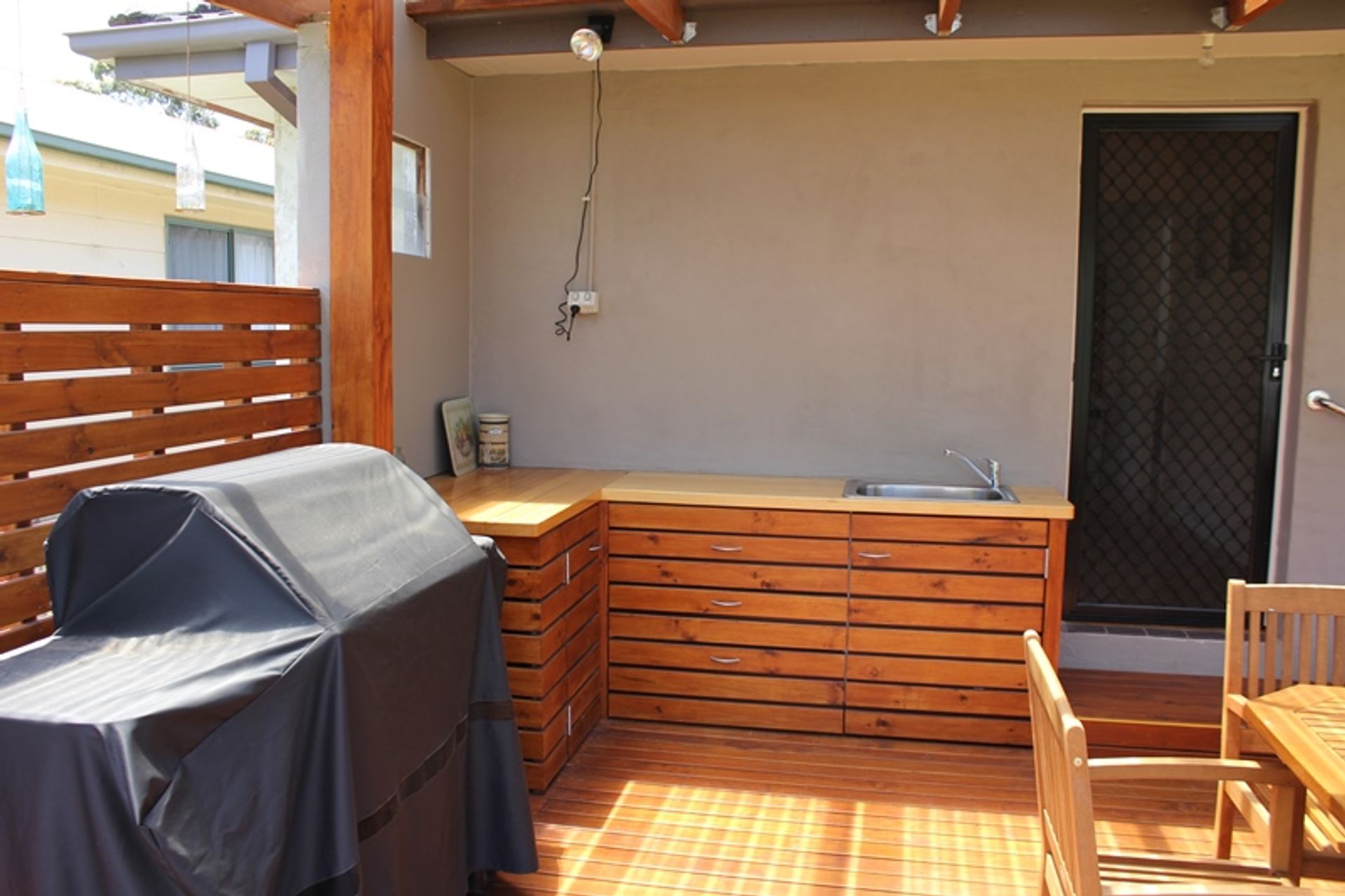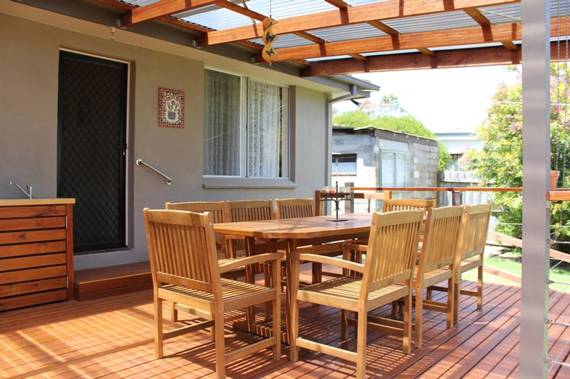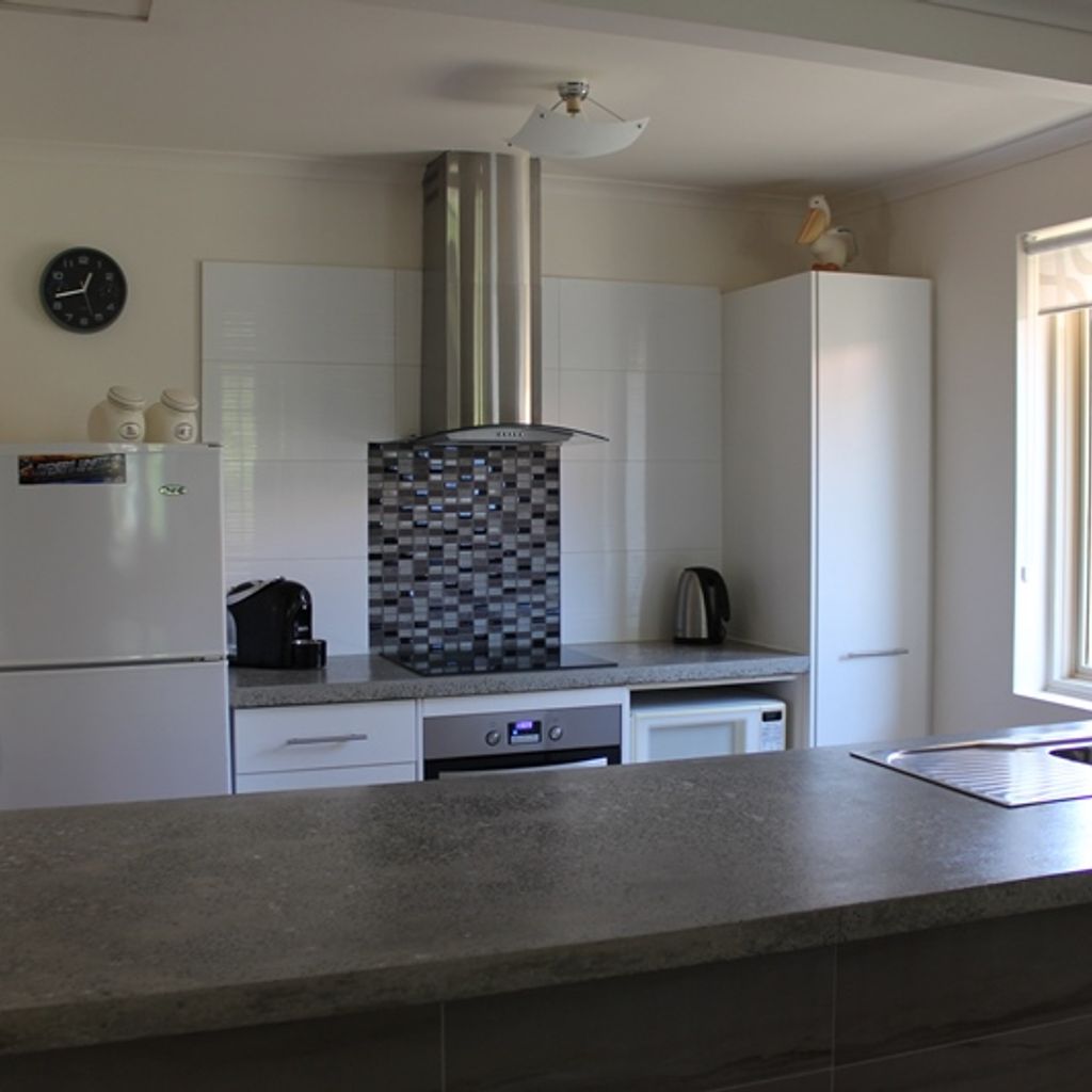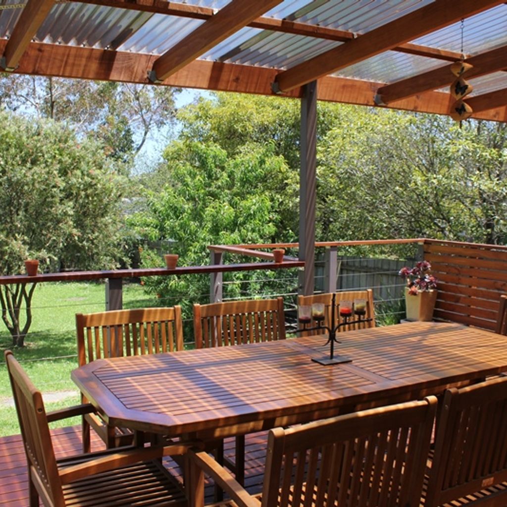 Inside the lounge, dining and kitchen are open plan with a large flat screen tv and dvd player, comfortable sofas and stereo. There is a split system heating and cooling unit and polished timber floors. There is a central dining table and the kitchen is modern and well equipped. The kitchen has electric cooking, a microwave and dishwasher. The fridge is a good size and there are lots of platters and salad bowls perfect for alfresco dining. The deck is at the rear of the house with a large outdoor setting, a gas bbq, outdoor sink and crockery and cutlery - the perfect spot for summer bbqs.